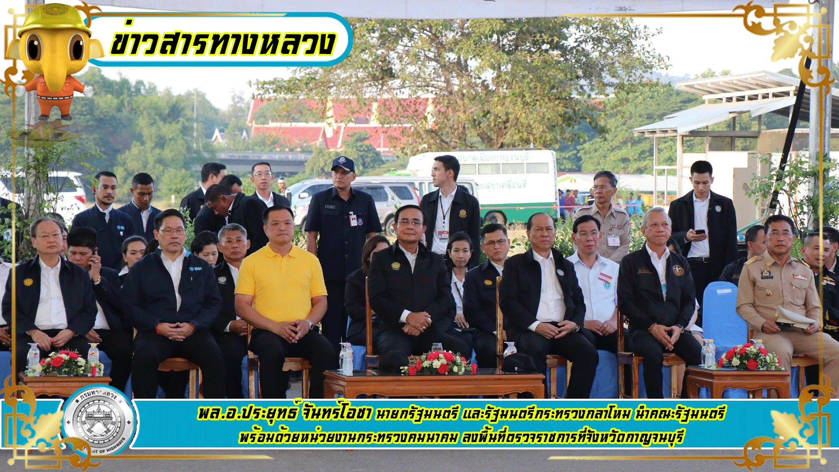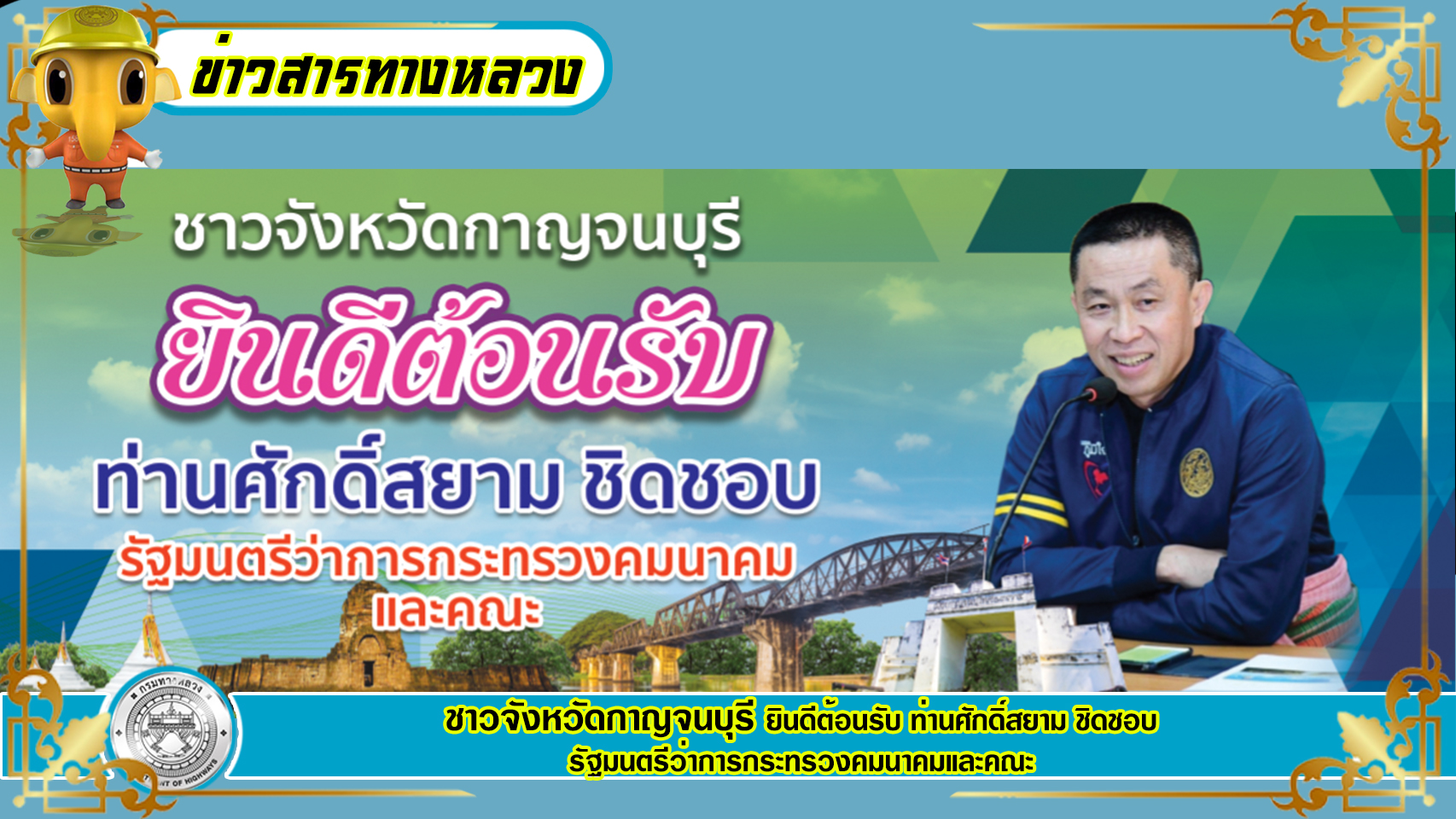 ชาวจังหวัดกาญจนบุรี ยินดีต้อนรับ ท่านศักดิ์สยาม ชิดชอบ รัฐมนตรีว่าการกระทรวงคมนาคม พร้อมด้วย นายสราวุธ ทรงศิวิไล อธิบดีกรมทางหลวง และคณะ ลงพื้นทีในจังหวัดกาญจนบุรี ตรวจติดตามผลการดำเนินงาน โครงการก่อสร้างทางหลวงพิเศษระหว่างเมือง สายบางใหญ่-กาญจนบุรี วันที่ 11 พฤศจิกายน 2562 ณ วัดตะคร้ำเอน ตำบลตำคร้ำเอน อำเภอท่ามะกา จังหวัดกาญจนบุรี และตำบลหนองขาว อำเภอท่าม่วง จังหวัดกาญจนบุรี