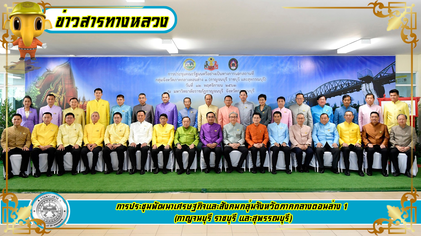 วันจันทร์ที่ 11 พฤศจิกายน 2562 เวลา 19.30 น. พล.อ.ประยุทธ์ จันทร์โอชา นายกรัฐมนตรี และรัฐมนตรีกระทรวงกลาโหม นำคณะรัฐมนตรีพร้อมด้วยหน่วยงานกระทรวงคมนาคม ลงพื้นที่ตรวจราชการที่จังหวัดกาญจนบุรี ประชุมคณะรัฐมนตรีอย่างเป็นทางการนอกสถานที่ ครั้งที่ 1/2562 ตรวจเยี่ยมโครงการจัดระเบียบแพ ที่อำเภอเมืองกาญจนบุรี ก่อนพบปะประชาชนที่โรงงานกระดาษไทย และช่วงค่ำ พล.อ.ประยุทธ์ ร่วมลอยกระทงกับชาวกาญจนบุรี ณ ท่าเรือขุนแผน เทศบาลเมืองกาญจนบุรี จังหวัดกาญจนบุรี