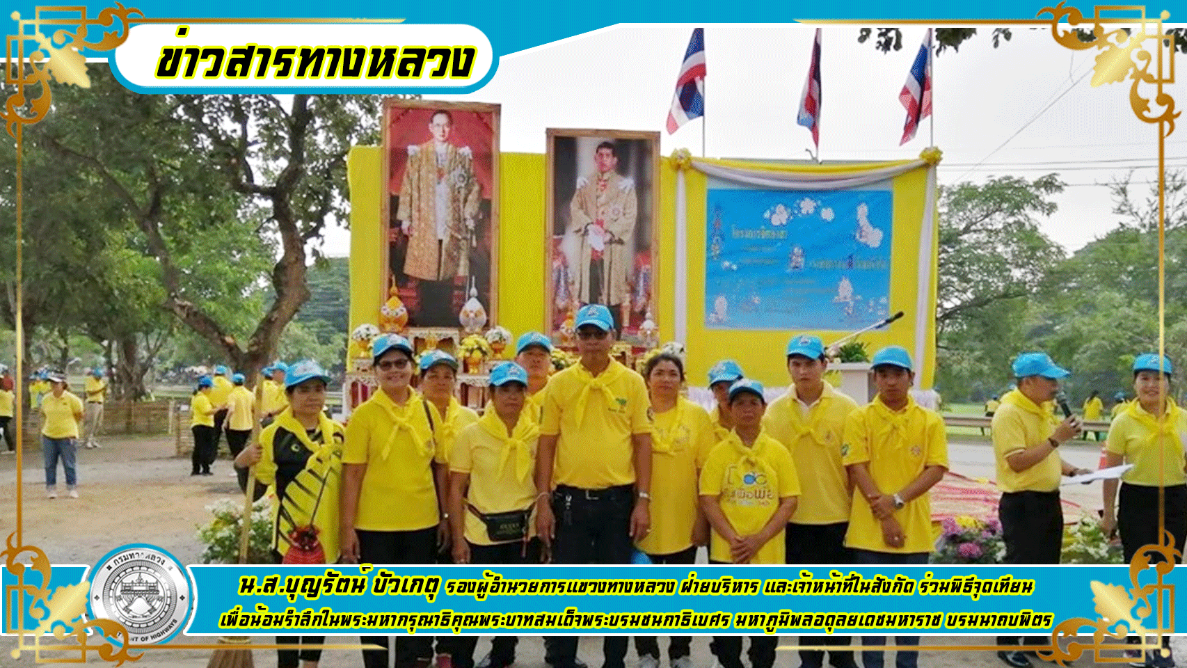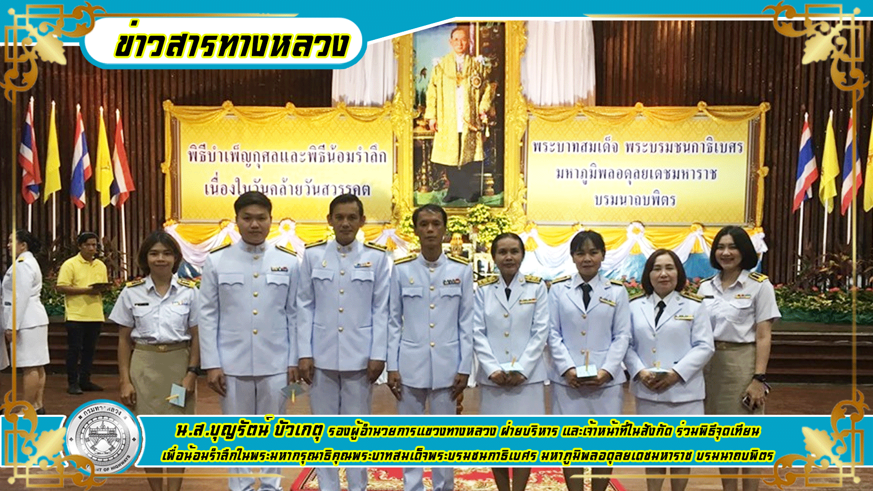 วันที่ ๑๓ ตุลาคม ๒๕๖๒ นายมงคล ทวีชัยทศพล ผู้อำนวยการแขวงทางหลวงกาญจนบุรี มอบหมายให้ น.ส.บุญรัตน์ บัวเกตุ รองผู้อำนวยการแขวงทางหลวง ฝ่ายบริหาร และเจ้าหน้าที่ในสังกัด ร่วมพิธีจุดเทียนเพื่อน้อมรำลึกในพระมหากรุณาธิคุณ พระบาทสมเด็จพระบรมชนกาธิเบศร มหาภูมิพลอดุลยเดชมหาราช บรมนาถบพิตร ณ สนามหน้าศาลกลางจังหวัดกาญจนบุรี