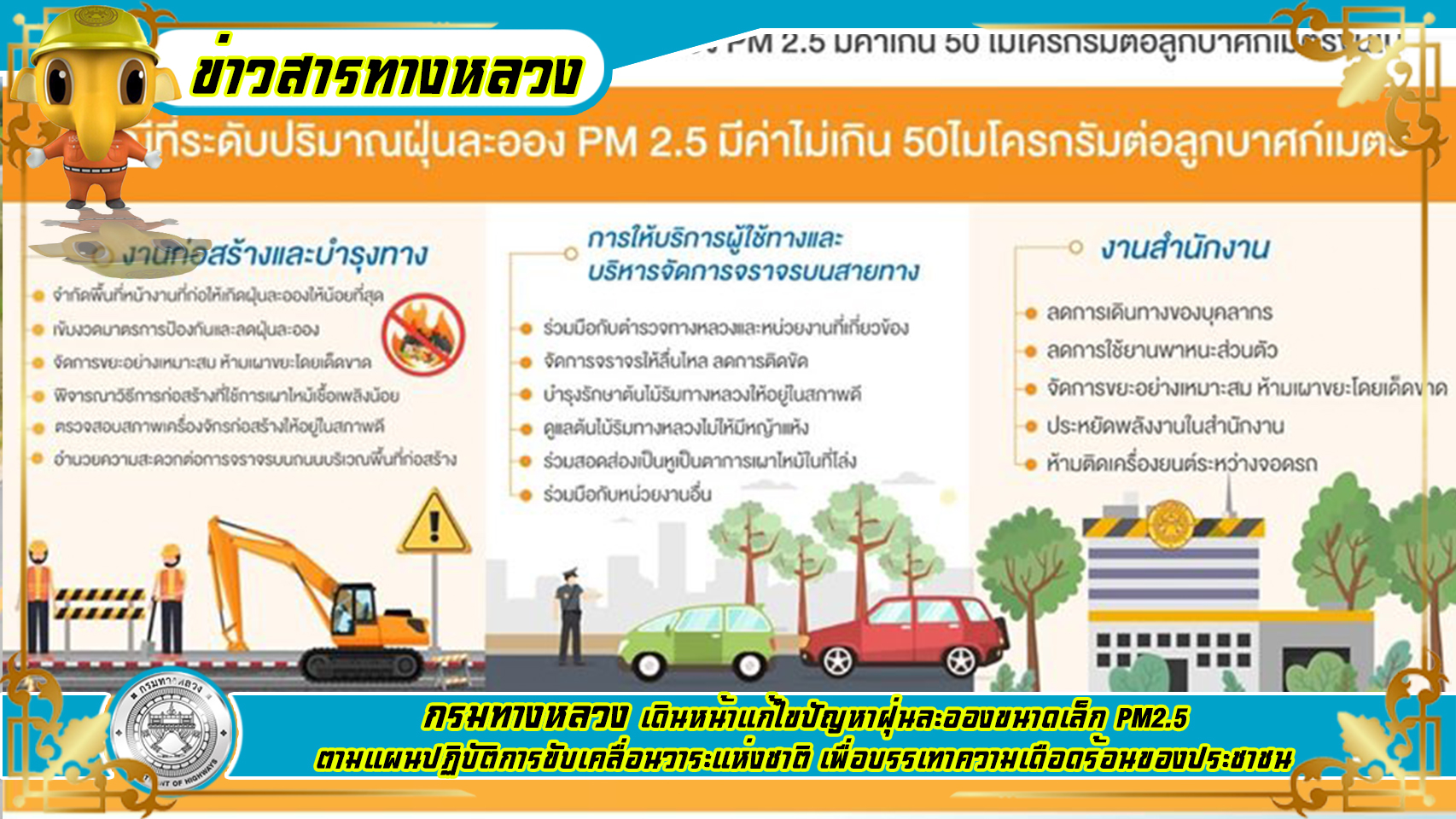 กรมทางหลวง เดินหน้าแก้ไขปัญหาฝุ่นละอองขนาดเล็ก PM2.5 ตามแผนปฏิบัติการขับเคลื่อนวาระแห่งชาติ เพื่อบรรเทาความเดือดร้อนของประชาชน