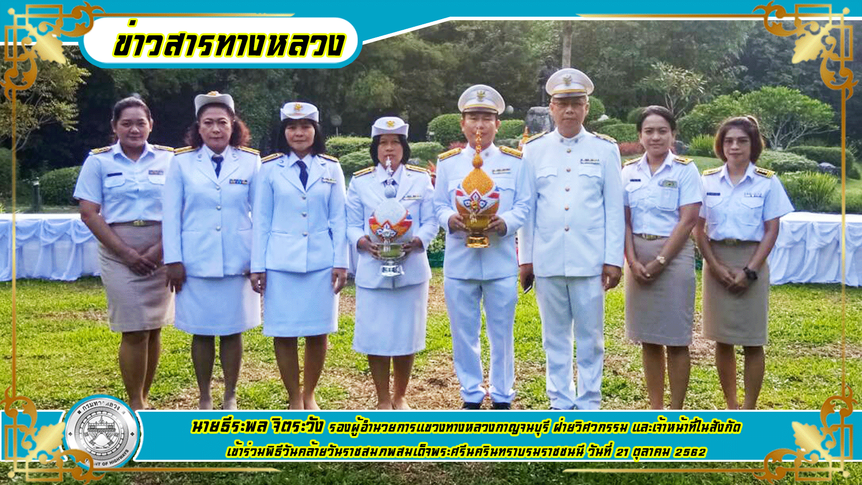 วันที่ ๒๑ ตุลาคม ๒๕๖๒ นายมงคล ทวีชัยทศพล ผู้อำนวยการแขวงทางหลวงกาญจนบุรี มอบหมายให้ นายธีระพล จิตระวัง รองผู้อำนวยการแขวงทางหลวงกาญจนบุรี ฝ่ายวิศวกรรม และเจ้าหน้าที่ในสังกัด เข้าร่วมพิธีสักการะ เนื่องในวันคล้ายวันพระราชสมภพของสมเด็จพระศรีนครินทราบรมราชชนนี ณ บริเวณพระราชานุสารรีย์ สมเด็จพระศรีนครินทราบรมราชชนนี สวนสมเด็จพระศรีนครินทร์กาญจนบุรี วิทยาลัยเกษตรและเทคโนโลยีกาญจนบุรี อำเภอเมือง จังหวัดกาญจนบุรี