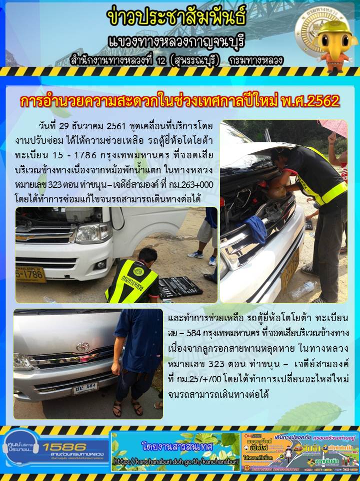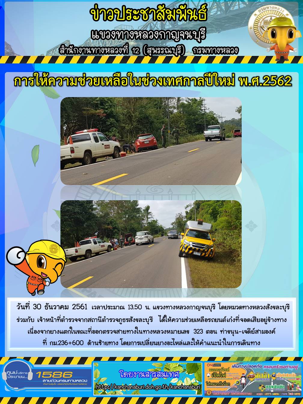 แขวงทางหลวงกาญจนบุรี โดยหมวดทางหลวงสังขละบุรีร่วมกับ เจ้าหน้าที่ตำรวจจากสถานีตำรวจภูธรสังขละบุรี ได้ให้ความช่วยเหลือรถยนต์เก๋งที่จอดเสียอยู่ข้างทาง เนื่องจากยางแตกในขณะที่ออกตรวจสายทางในทางหลวงหมายเลข 323 30/12/61