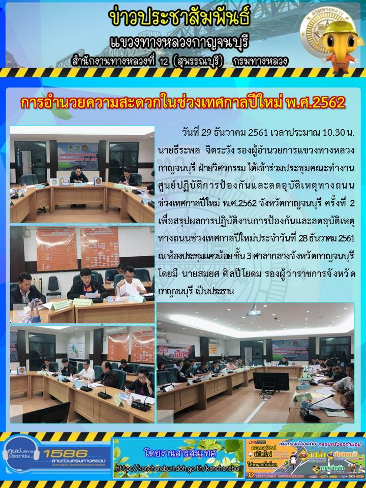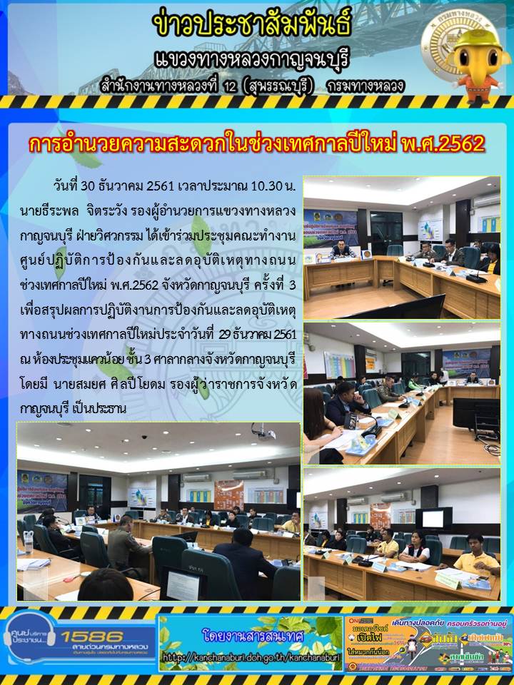 นายธีรพล จิตระวัง รองผู้อำนวยการแขวงทางหลวงกาญจนบุรี ฝ่ายวิศวกรรม ได้เข้าร่วมประชุมคณะทำงานศูนย์ปฏิบัติการป้องกันและลดอุบัติเหตุทางถนน ช่วงเทศกาลปีใหม่ พ.ศ.2562 30/12/61