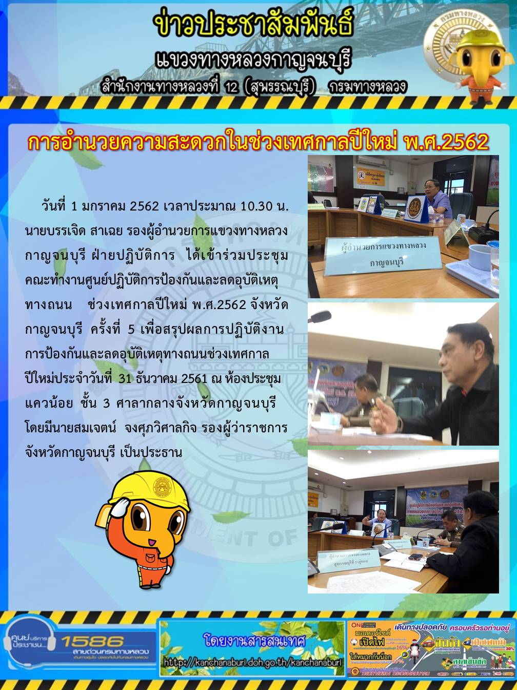 นายบรรเจิด สาเฉย รองผู้อำนวยการแขวงทางหลวงกาญจนบุรี ฝ่ายปฏิบัติการ ได้เข้าร่วมประชุมคณะทำงานศูนย์ปฏิบัติการป้องกันและลดอุบัติเหตุทางถนน ช่วงเทศกาลปีใหม่ พ.ศ.2562