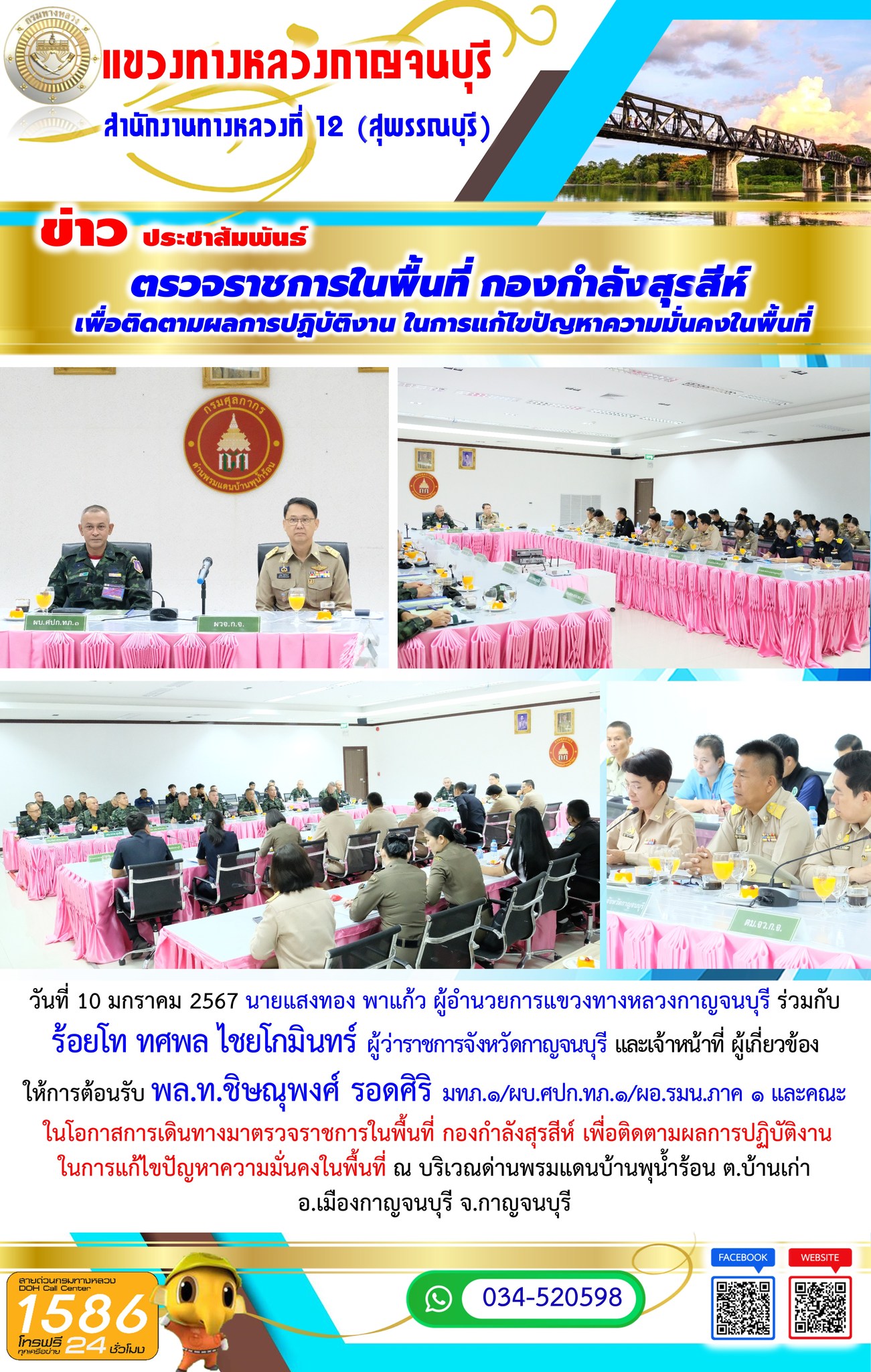 วันที่ 10 มกราคม 2567 นายแสงทอง พาแก้ว ผู้อำนวยการแขวงทางหลวงกาญจนบุรี ร่วมกับ ร้อยโท ทศพล ไชยโกมินทร์ ผู้ว่าราชการจังหวัดกาญจนบุรี และเจ้าหน้าที่ ผู้เกี่ยวข้อง ให้การต้อนรับ พล.ท.ชิษณุพงศ์ รอดศิริ มทภ.๑/ผบ.ศปก.ทภ.๑/ผอ.รมน.ภาค ๑ และคณะ ในโอกาสการเดินทางมาตรวจราชการในพื้นที่ กองกำลังสุรสีห์ เพื่อติดตามผลการปฏิบัติงาน ในการแก้ไขปัญหาความมั่นคงในพื้นที่ ณ บริเวณด่านพรมแดนบ้านพุน้ำร้อน ต.บ้านเก่า อ.เมืองกาญจนบุรี จ.กาญจนบุรี