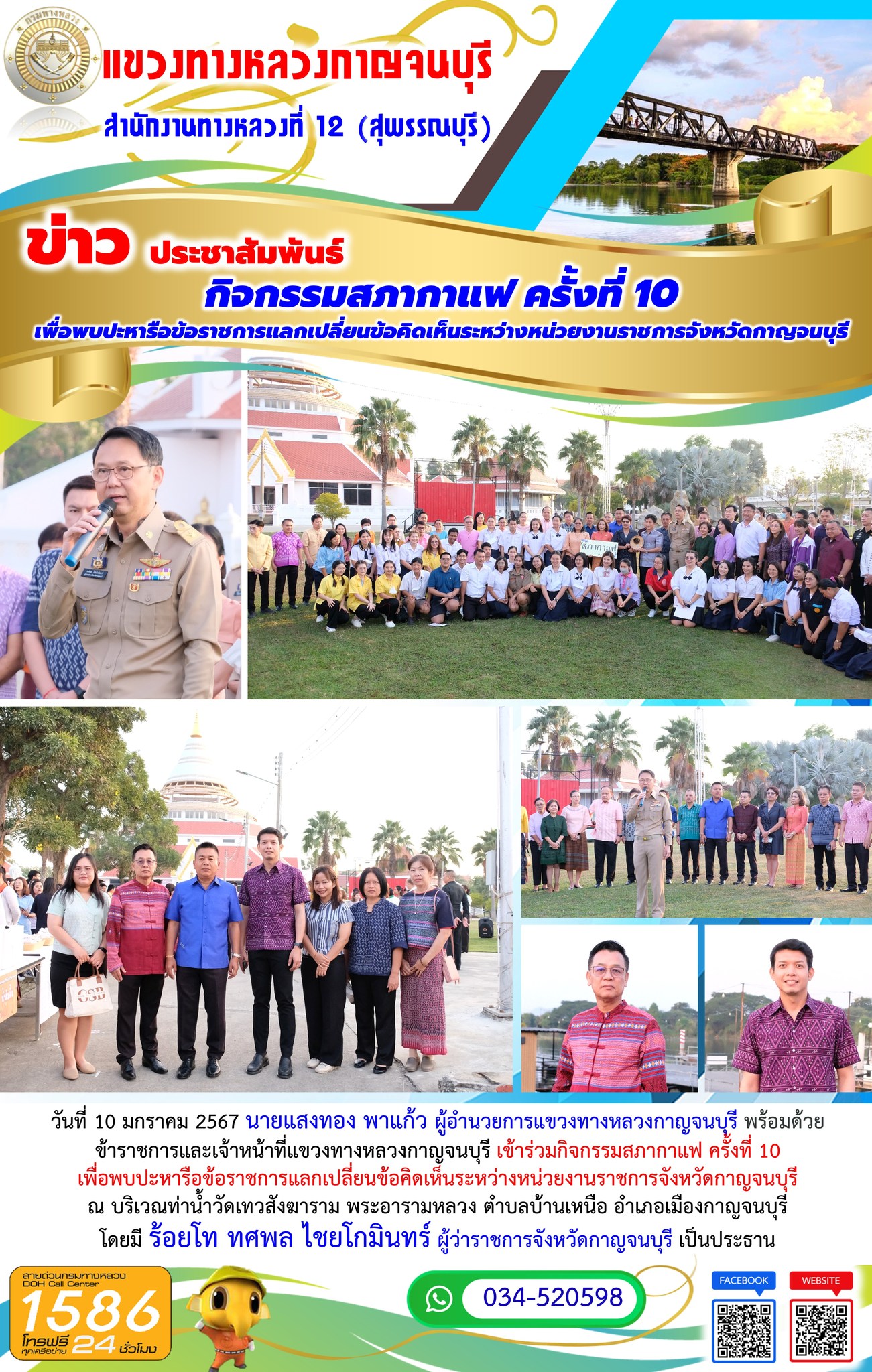 10 มกราคม 2567 นายแสงทอง พาแก้ว ผู้อำนวยการแขวงทางหลวงกาญจนบุรี พร้อมด้วย ข้าราชการและเจ้าหน้าที่แขวงทางหลวงกาญจนบุรี เข้าร่วมกิจกรรมสภากาแฟ ครั้งที่ 10 เพื่อพบปะหารือข้อราชการแลกเปลี่ยนข้อคิดเห็นระหว่างหน่วยงานราชการจังหวัดกาญจนบุรี ณ บริเวณท่าน้ำวัดเทวสังฆาราม พระอารามหลวง ตำบลบ้านเหนือ อำเภอเมืองกาญจนบุรี โดยมี ร้อยโท ทศพล ไชยโกมินทร์ ผู้ว่าราชการจังหวัดกาญจนบุรี เป็นประธาน
