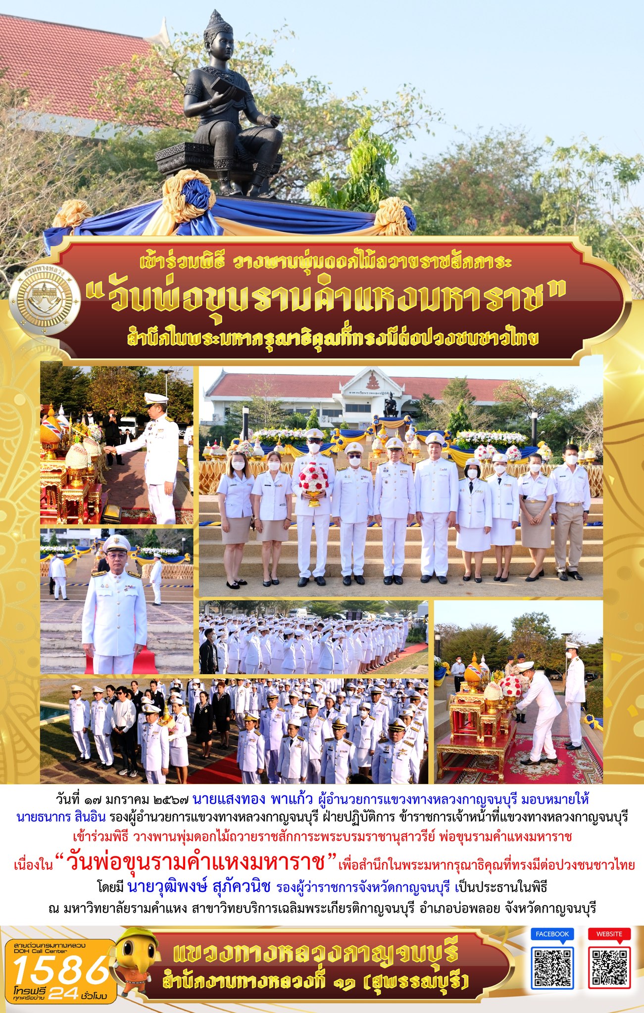 วันที่ ๑๗ มกราคม ๒๕๖๗ นายแสงทอง พาแก้ว ผู้อำนวยการแขวงทางหลวงกาญจนบุรี มอบหมายให้ นายธนากร สินอิน รองผู้อำนวยการแขวงทางหลวงกาญจนบุรี ฝ่ายปฏิบัติการ ข้าราชการเจ้าหน้าที่แขวงทางหลวงกาญจนบุรี เข้าร่วมพิธี วางพานพุ่มดอกไม้ถวายราชสักการะพระบรมราชานุสาวรีย์ พ่อขุนรามคำแหงมหาราช เนื่องใน“วันพ่อขุนรามคำแหงมหาราช”