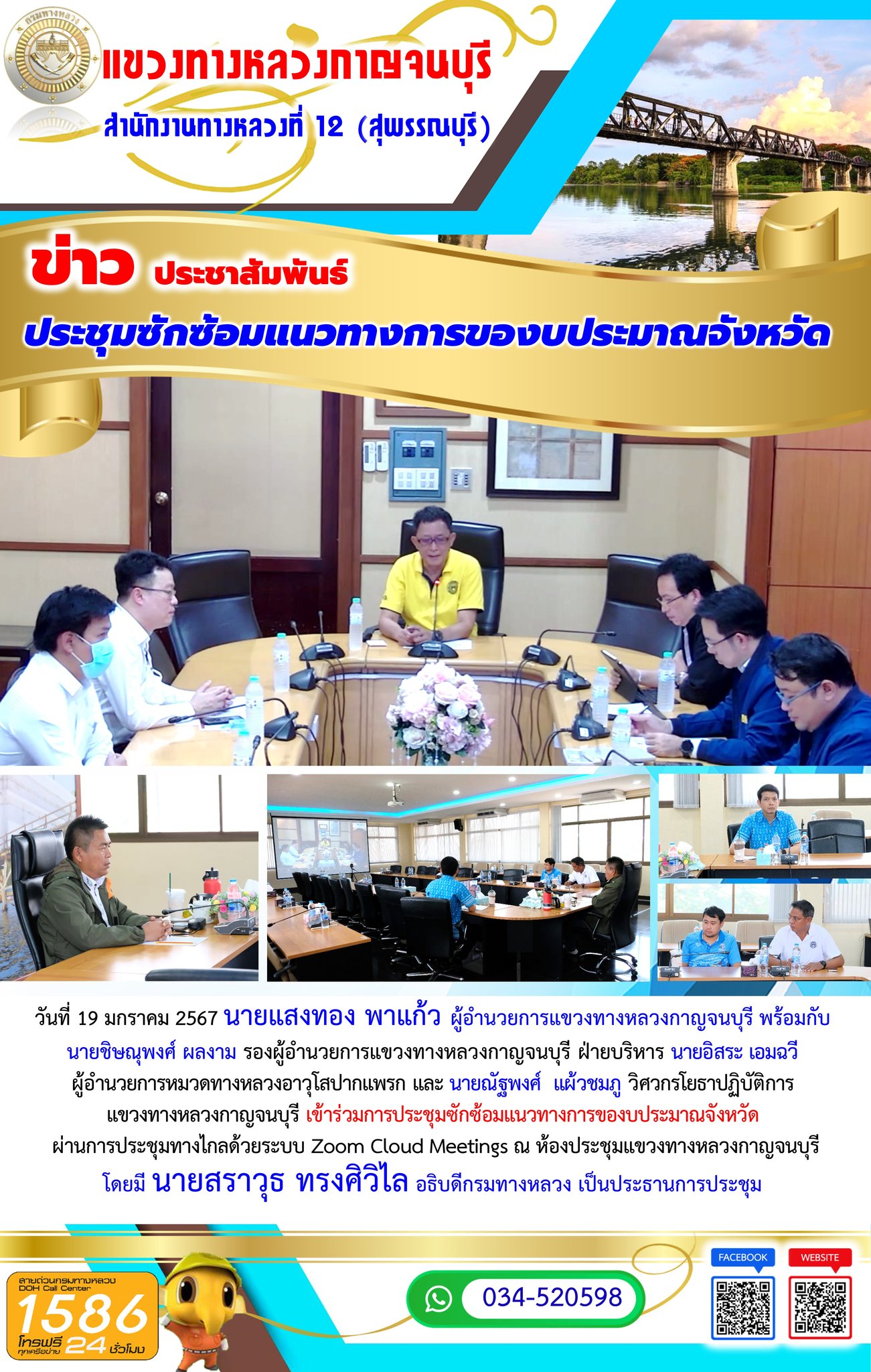 วันที่ 19 มกราคม 2567 นายแสงทอง พาแก้ว ผู้อำนวยการแขวงทางหลวงกาญจนบุรี พร้อมกับ นายชิษณุพงศ์ ผลงาม รองผู้อำนวยการแขวงทางหลวงกาญจนบุรี ฝ่ายบริหาร นายอิสระ เอมฉวี ผู้อำนวยการหมวดทางหลวงอาวุโสปากแพรก และ นายณัฐพงศ์ แผ้วชมภู วิศวกรโยธาปฏิบัติการ แขวงทางหลวงกาญจนบุรี เข้าร่วมการประชุมซักซ้อมแนวทางการของบประมาณจังหวัด ผ่านการประชุมทางไกลด้วยระบบ Zoom Cloud Meetings