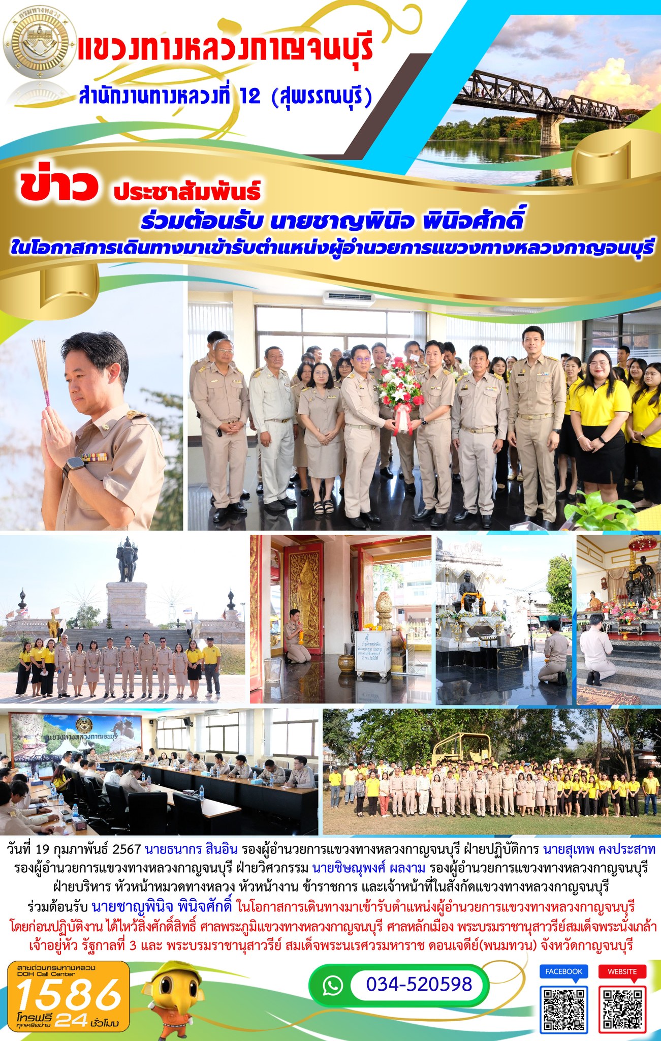 วันที่ 19 กุมภาพันธ์ 2567 นายธนากร สินอิน รองผู้อำนวยการแขวงทางหลวงกาญจนบุรี ฝ่ายปฏิบัติการ นายสุเทพ คงประสาท รองผู้อำนวยการแขวงทางหลวงกาญจนบุรี ฝ่ายวิศวกรรม นายชิษณุพงศ์ ผลงาม รองผู้อำนวยการแขวงทางหลวงกาญจนบุรี ฝ่ายบริหาร หัวหน้าหมวดทางหลวง หัวหน้างาน ข้าราชการ และเจ้าหน้าที่ในสังกัดแขวงทางหลวงกาญจนบุรี ร่วมต้อนรับ นายชาญพินิจ พินิจศักดิ์ ในโอกาสการเดินทางมาเข้ารับตำแหน่งผู้อำนวยการแขวงทางหลวงกาญจนบุรี
