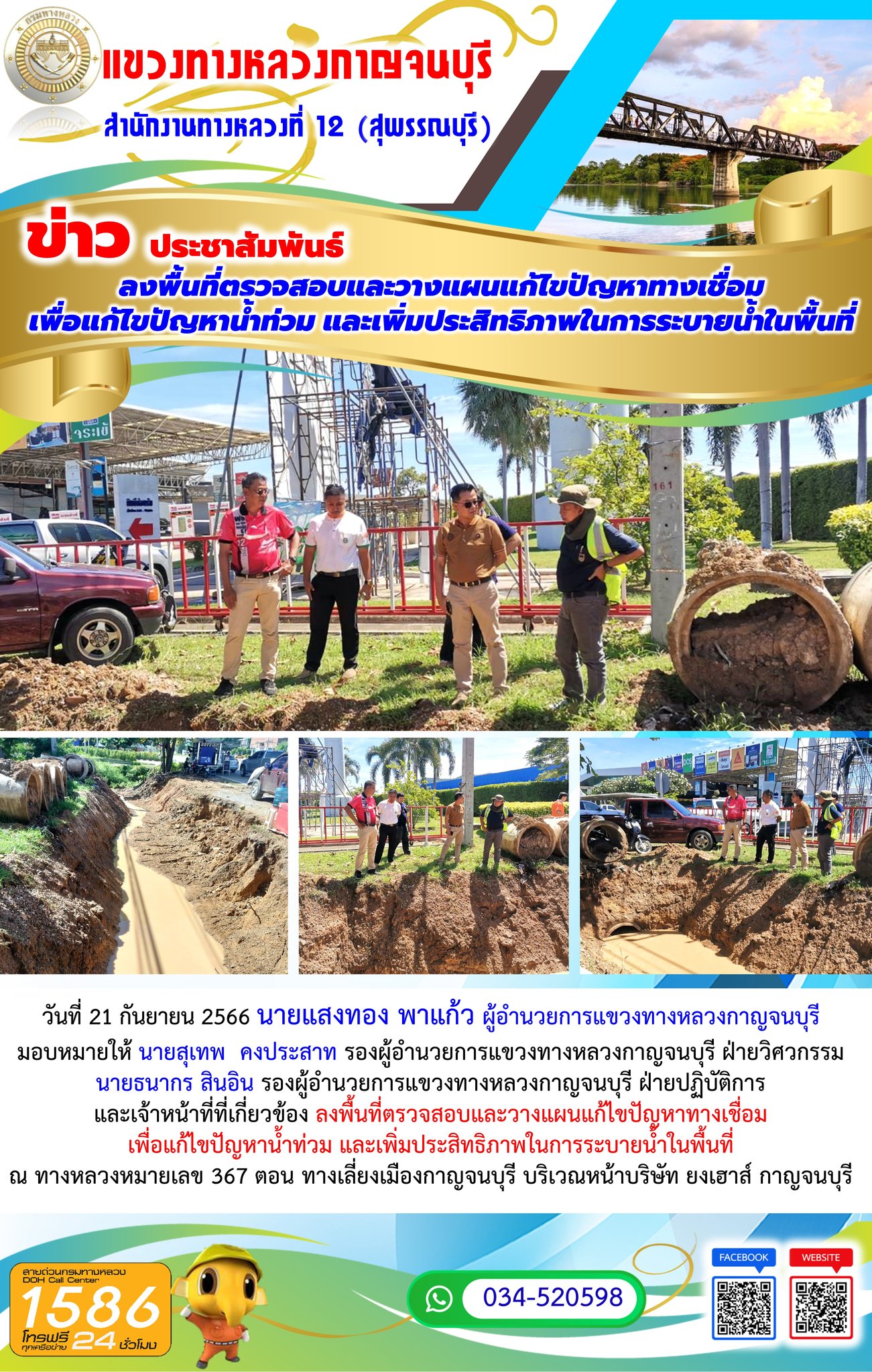 วันที่ 21 กันยายน 2566 นายแสงทอง พาแก้ว ผู้อำนวยการแขวงทางหลวงกาญจนบุรี มอบหมายให้ นายสุเทพ คงประสาท รองผู้อำนวยการแขวงทางหลวงกาญจนบุรี ฝ่ายวิศวกรรม นายธนากร สินอิน รองผู้อำนวยการแขวงทางหลวงกาญจนบุรี ฝ่ายปฏิบัติการ และเจ้าหน้าที่ที่เกี่ยวข้อง ลงพื้นที่ตรวจสอบและวางแผนแก้ไขปัญหาทางเชื่อม เพื่อแก้ไขปัญหาน้ำท่วม และเพิ่มประสิทธิภาพในการระบายน้ำในพื้นที่ ณ ทางหลวงหมายเลข 367 ตอน ทางเลี่ยงเมืองกาญจนบุรี บริเวณหน้าบริษัท ยงเฮาส์ กาญจนบุรี #กรมทางหลวง