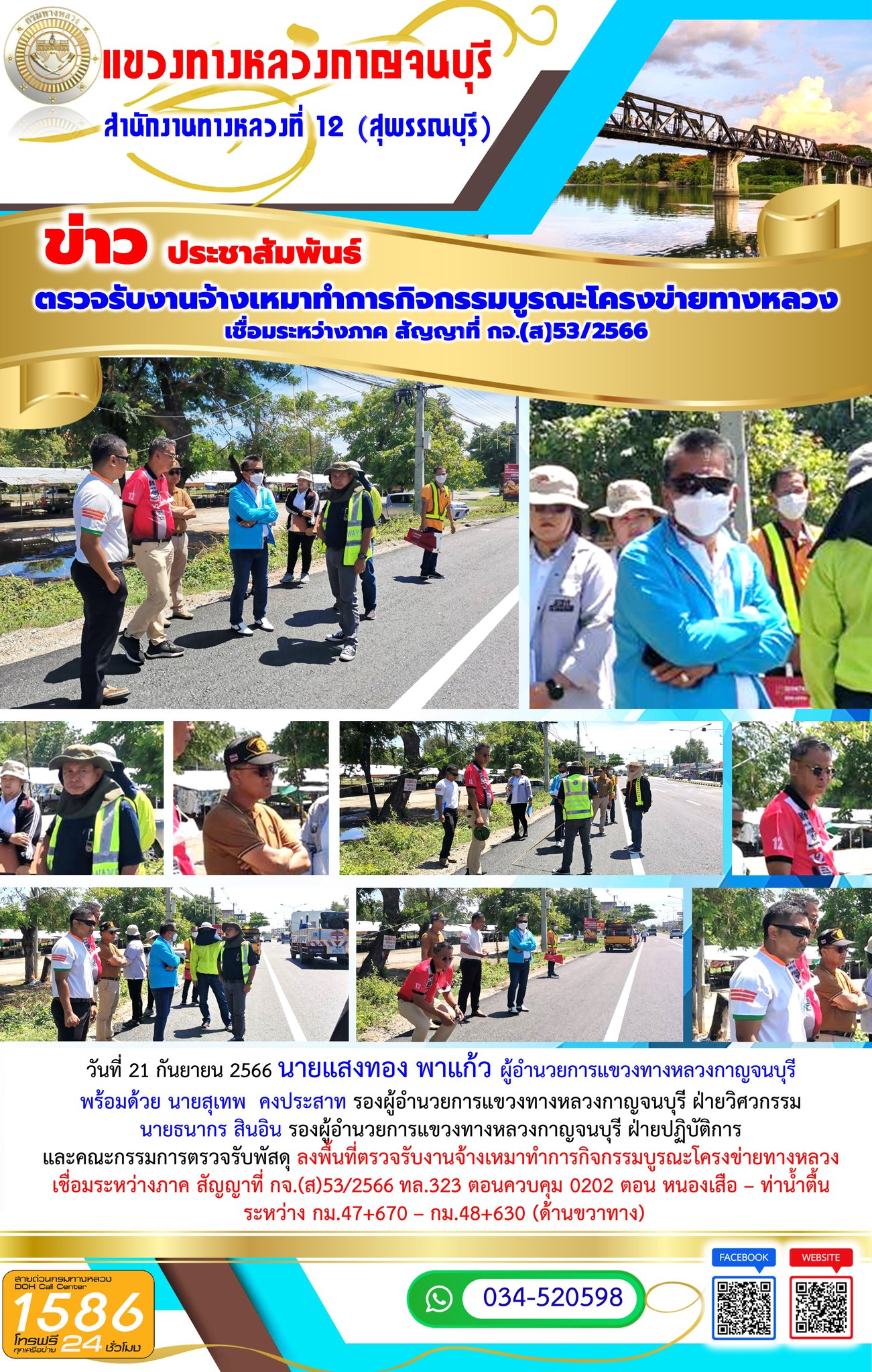 วันที่ 21 กันยายน 2566 นายแสงทอง พาแก้ว ผู้อำนวยการแขวงทางหลวงกาญจนบุรี พร้อมด้วย นายสุเทพ คงประสาท รองผู้อำนวยการแขวงทางหลวงกาญจนบุรี ฝ่ายวิศวกรรม นายธนากร สินอิน รองผู้อำนวยการแขวงทางหลวงกาญจนบุรี ฝ่ายปฏิบัติการ และคณะกรรมการตรวจรับพัสดุ ลงพื้นที่ตรวจรับงานจ้างเหมาทำการกิจกรรมบูรณะโครงข่ายทางหลวง เชื่อมระหว่างภาค สัญญาที่ กจ.(ส)53/2566 ทล.323 ตอนควบคุม 0202 ตอน หนองเสือ – ท่าน้ำตื้น ระหว่าง กม.47+670 – กม.48+630 (ด้านขวาทาง)