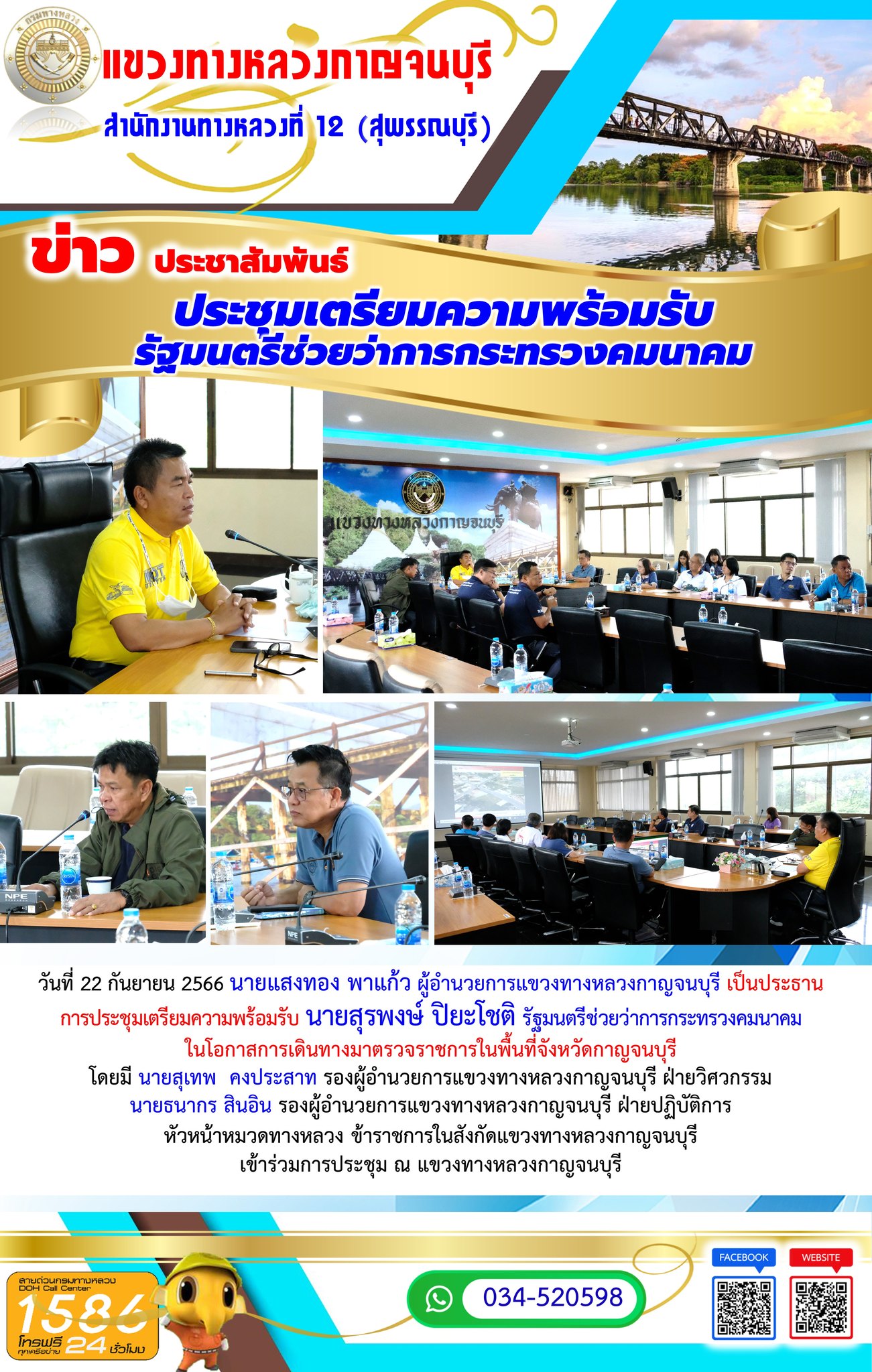 วันที่ 22 กันยายน 2566 นายแสงทอง พาแก้ว ผู้อำนวยการแขวงทางหลวงกาญจนบุรี เป็นประธานการประชุมเตรียมความพร้อมรับ นายสุรพงษ์ ปิยะโชติ รัฐมนตรีช่วยว่าการกระทรวงคมนาคม ในโอกาสการเดินทางมาตรวจราชการในพื้นที่จังหวัดกาญจนบุรี โดยมี นายสุเทพ คงประสาท รองผู้อำนวยการแขวงทางหลวงกาญจนบุรี ฝ่ายวิศวกรรม นายธนากร สินอิน รองผู้อำนวยการแขวงทางหลวงกาญจนบุรี ฝ่ายปฏิบัติการ หัวหน้าหมวดทางหลวง ข้าราชการในสังกัดแขวงทางหลวงกาญจนบุรี เข้าร่วมการประชุม ณ แขวงทางหลวงกาญจนบุรี