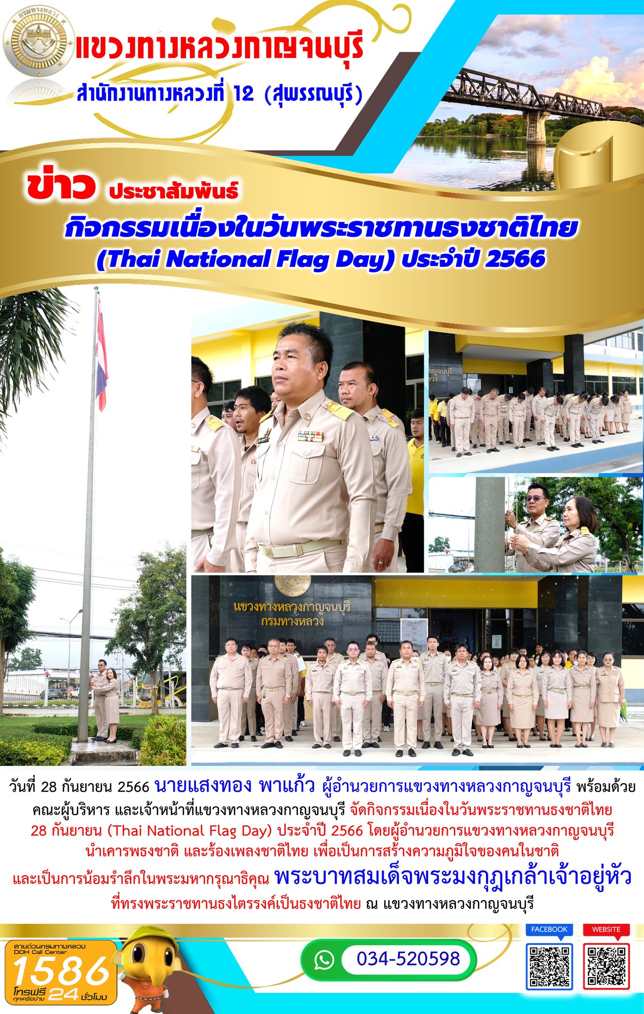 วันที่ 28 กันยายน 2566 นายแสงทอง พาแก้ว ผู้อำนวยการแขวงทางหลวงกาญจนบุรี พร้อมด้วยคณะผู้บริหาร และเจ้าหน้าที่แขวงทางหลวงกาญจนบุรี จัดกิจกรรมเนื่องในวันพระราชทานธงชาติไทย 28 กันยายน (Thai National Flag Day) ประจำปี 2566 โดยผู้อำนวยการแขวงทางหลวงกาญจนบุรี นำเคารพธงชาติ และร้องเพลงชาติไทย เพื่อเป็นการสร้างความภูมิใจของคนในชาติ และเป็นการน้อมรำลึกในพระมหากรุณาธิคุณ พระบาทสมเด็จพระมงกุฎเกล้าเจ้าอยู่หัว ที่ทรงพระราชทานธงไตรรงค์เป็นธงชาติไทย ณ แขวงทางหลวงกาญจนบุรี