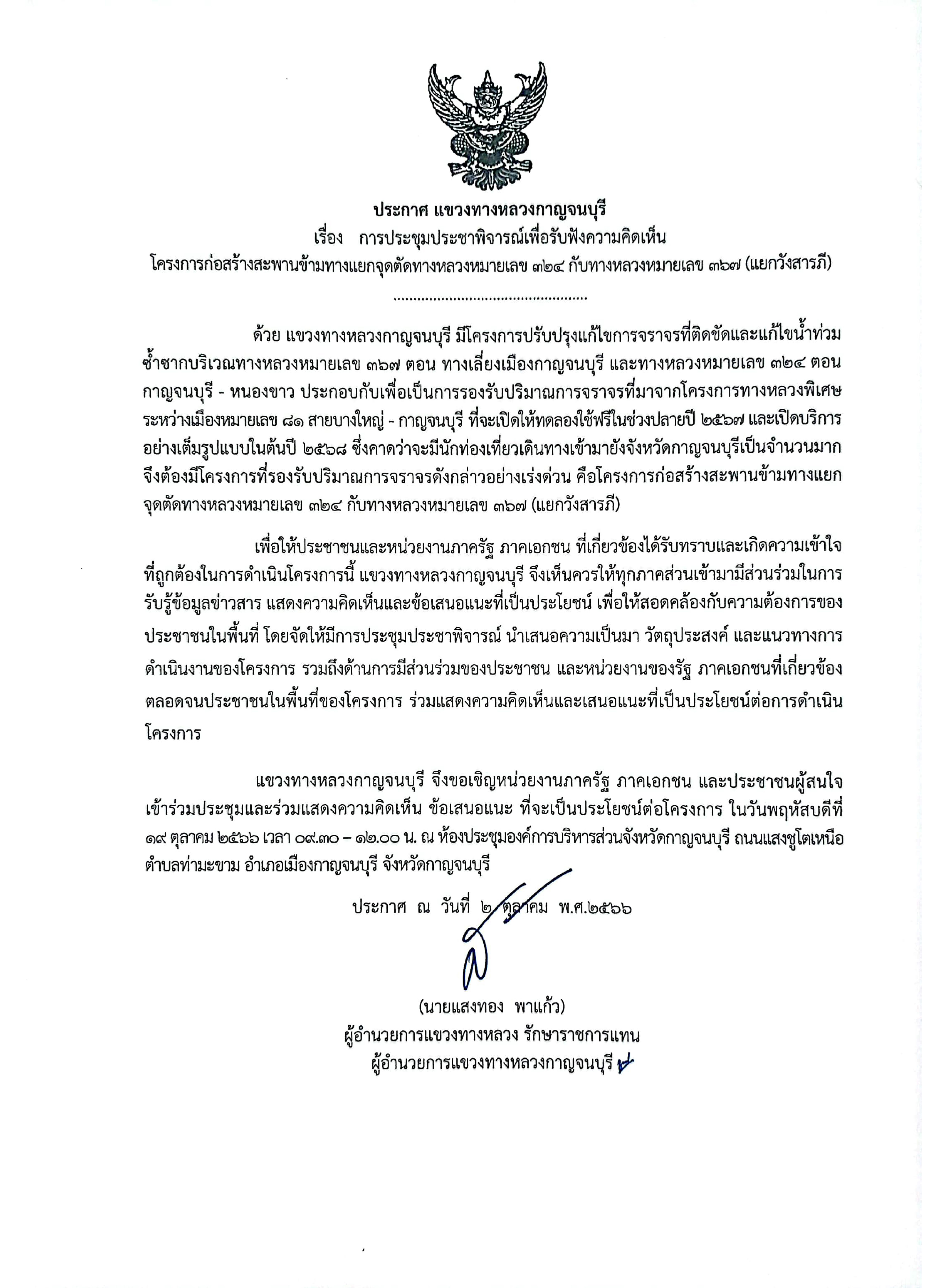 ประกาศ แขวงทางหลวงกาญจนบุรี เรื่อง การประชุมประชาพิจารณ์เพื่อรับฟังความคิดเห็น โครงการก่อสร้างสะพานข้ามทางแยกจุดตัดทางหลวงหมายเลข 324 กับทางหลวงหมายเลข 367 (แยกวังสารภี)