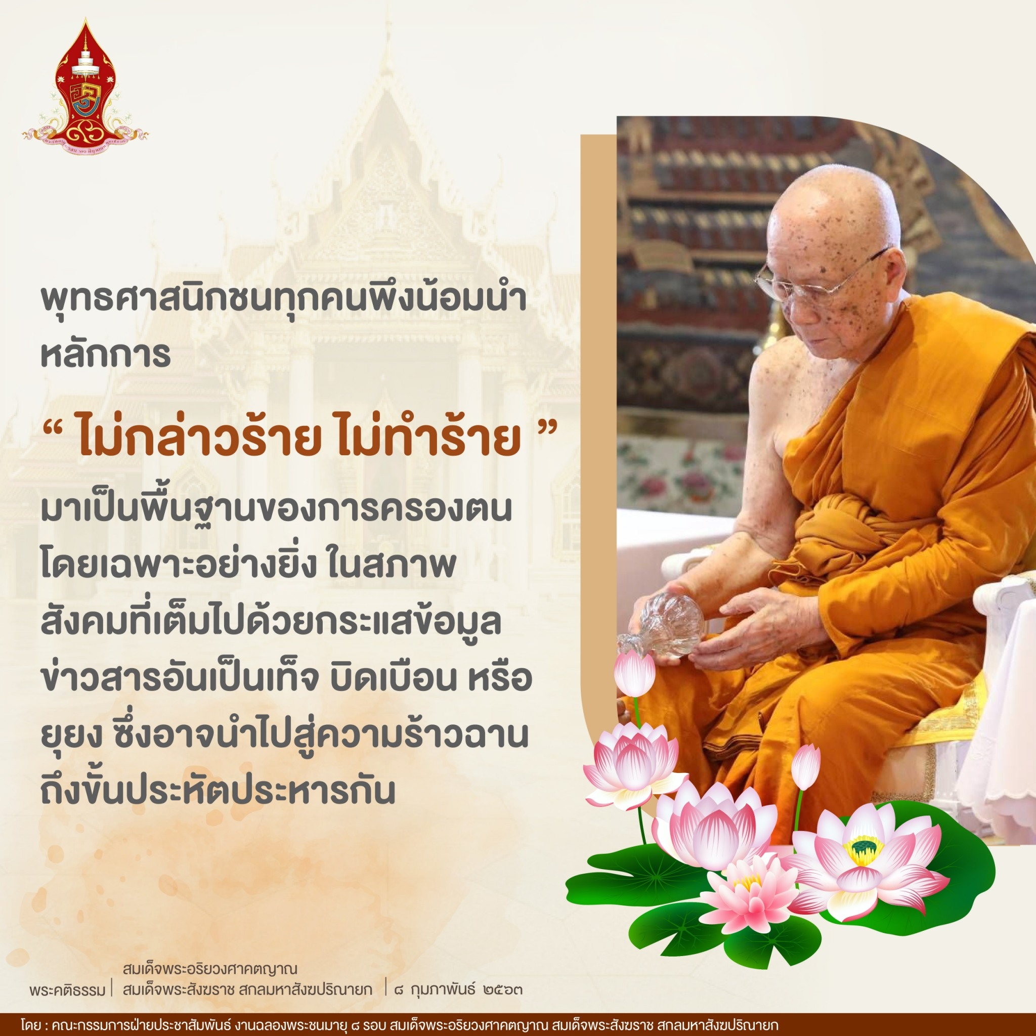พุทธศาสนิกชนทุกคนพึงน้อมนำหลักการ "ไม่กล่าวร้าย ไม่ทำร้าย" มาเป็นพื้นฐานของการครองตน โดยเฉพาะอย่างยิ่ง ในสภาพสังคมที่เต็มไปด้วยกระแสข้อมูลข่าวสารอันเป็นเท็จ บิดเบือน หรือยุยง ซึ่งอาจนำไปสู่ความร้าวฉานถึงขั้นประหัต