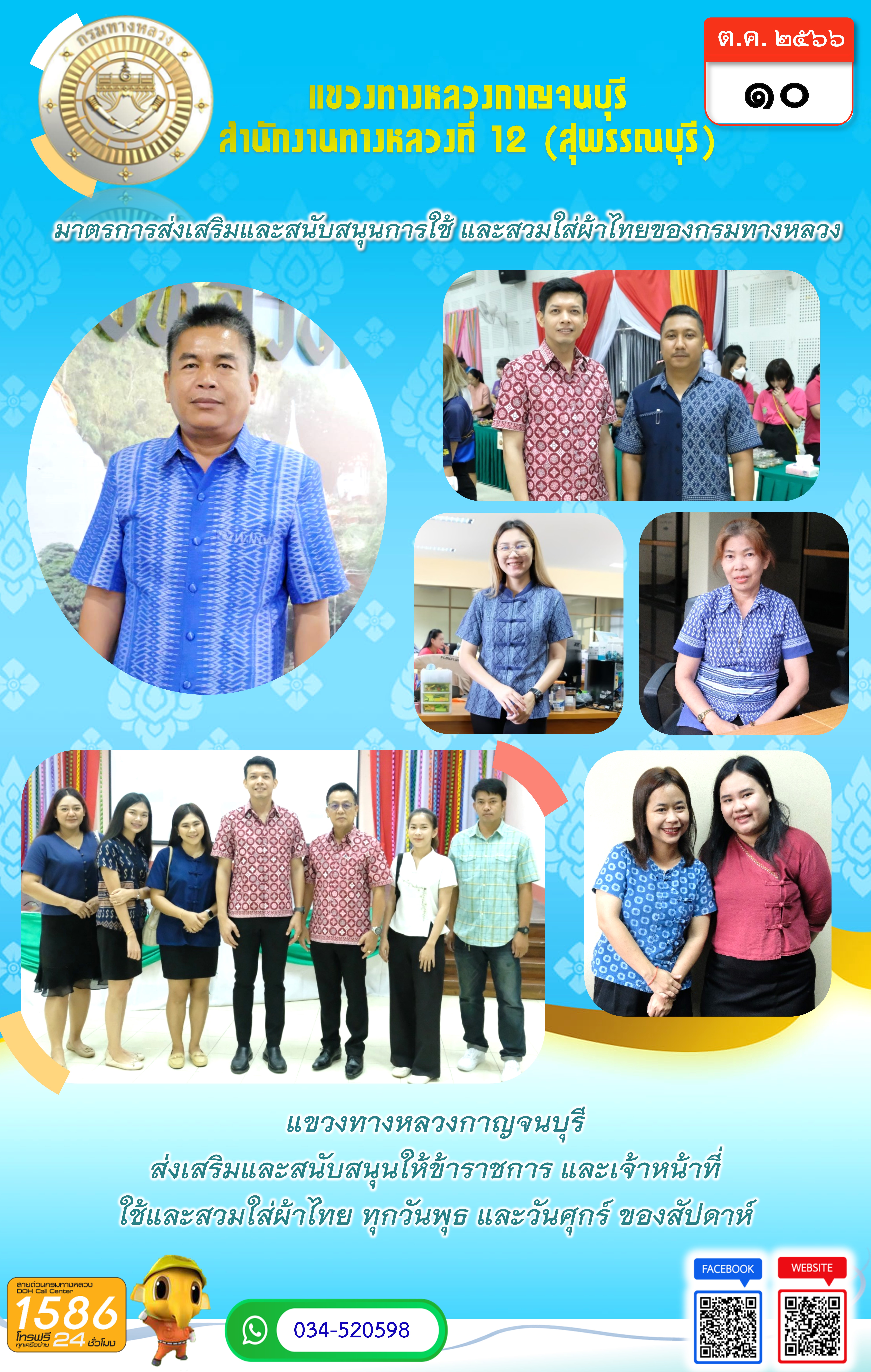 วันที่ 10 ต.ค. 2566 แขวงทางหลวงกาญจนบุรี รณรงค์แต่งกายด้วยผ้าไทยเพื่อส่งเสริมและสนับสนุนการใช้และสวมใส่ผ้าไทย เป็นการอนุรักษ์และสืบสานภูมิปัญญาของไทย สร้างค่านิยมและการตระหนักรับรู้การรักษามรดกและอัตลักษณ์ภูมิปัญญาของไทย