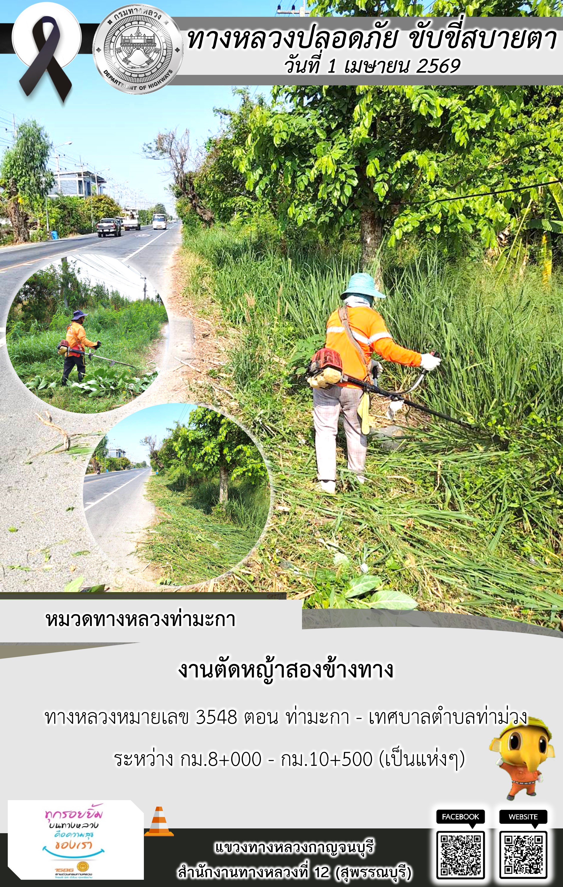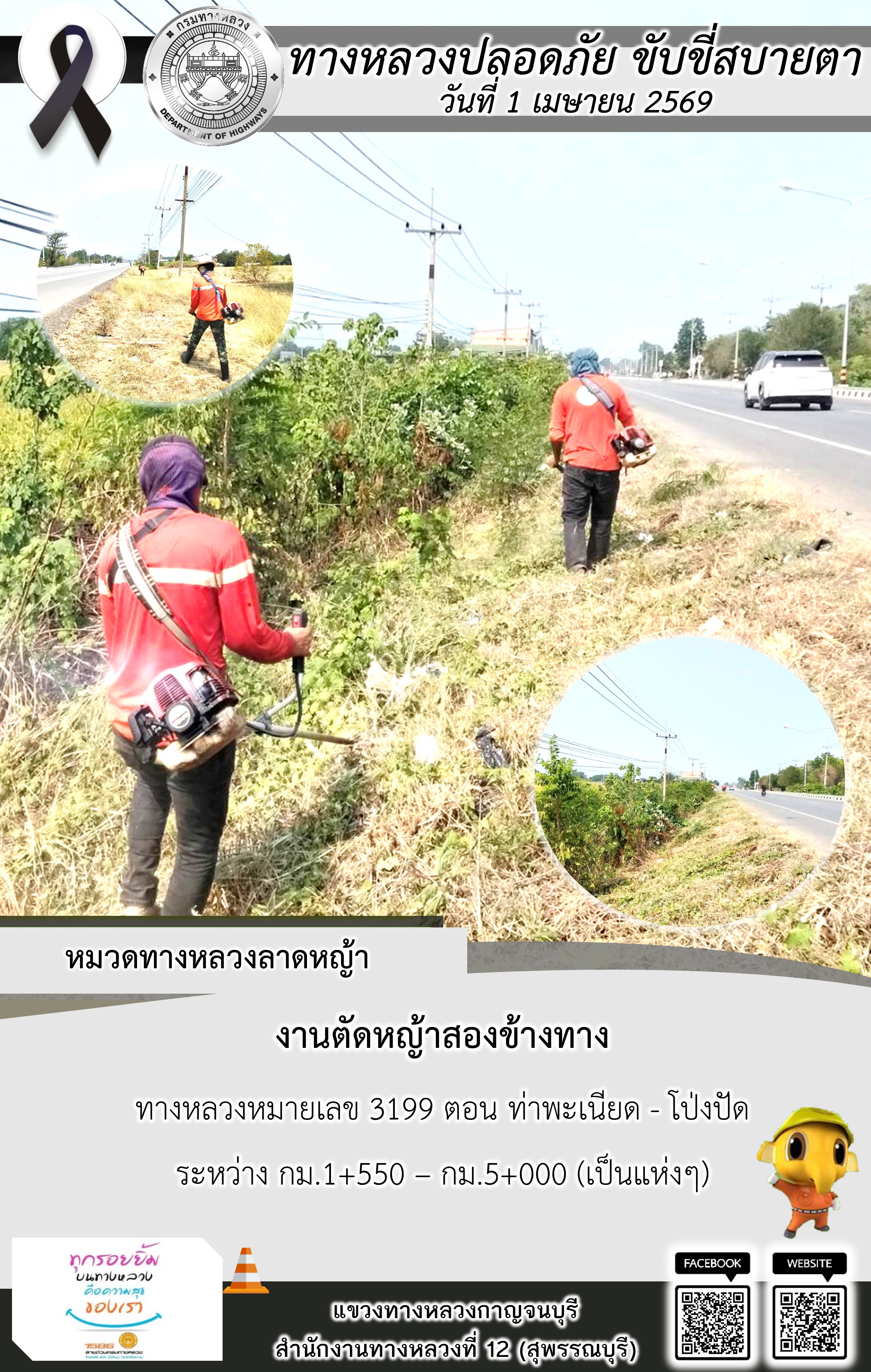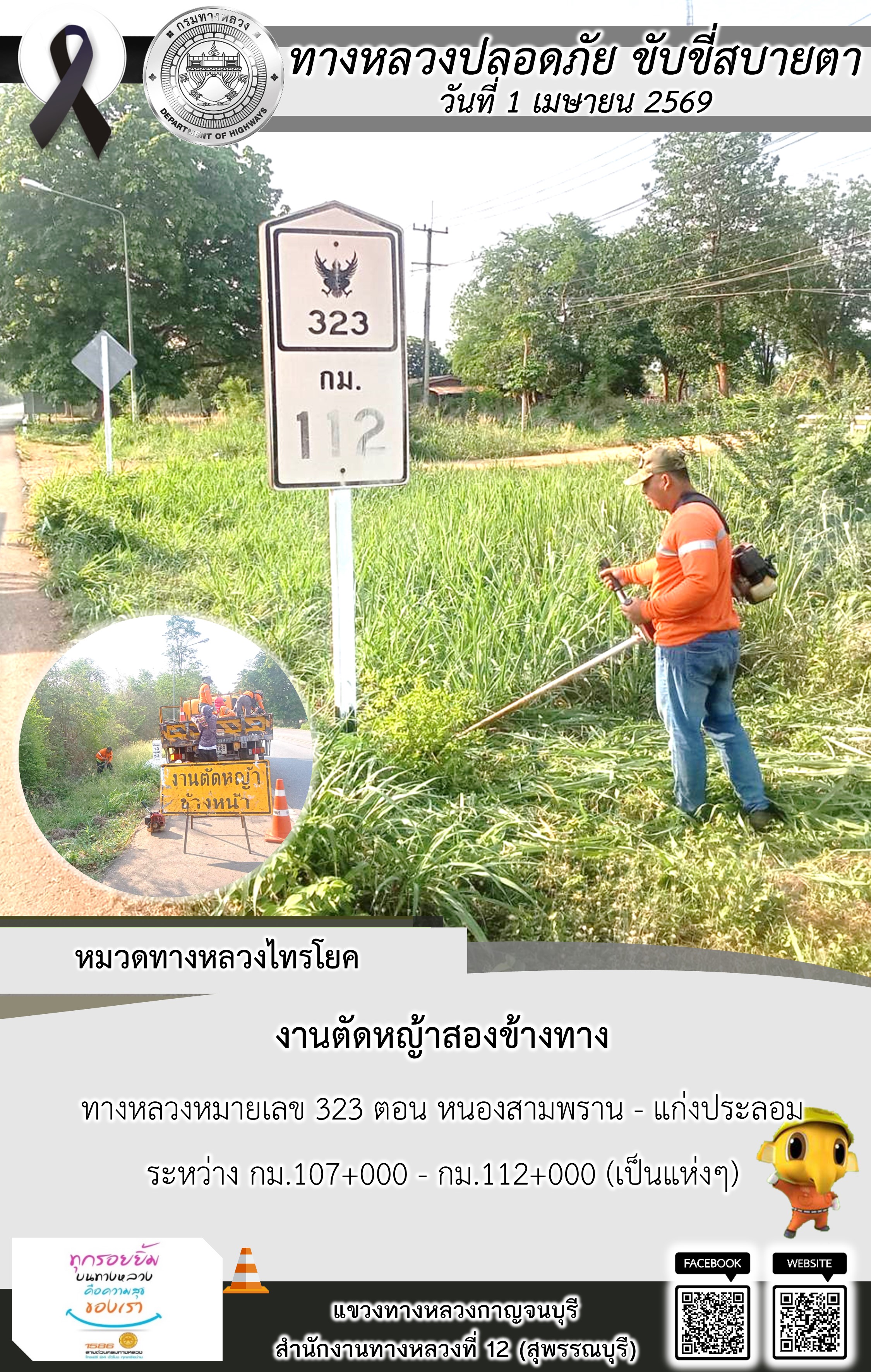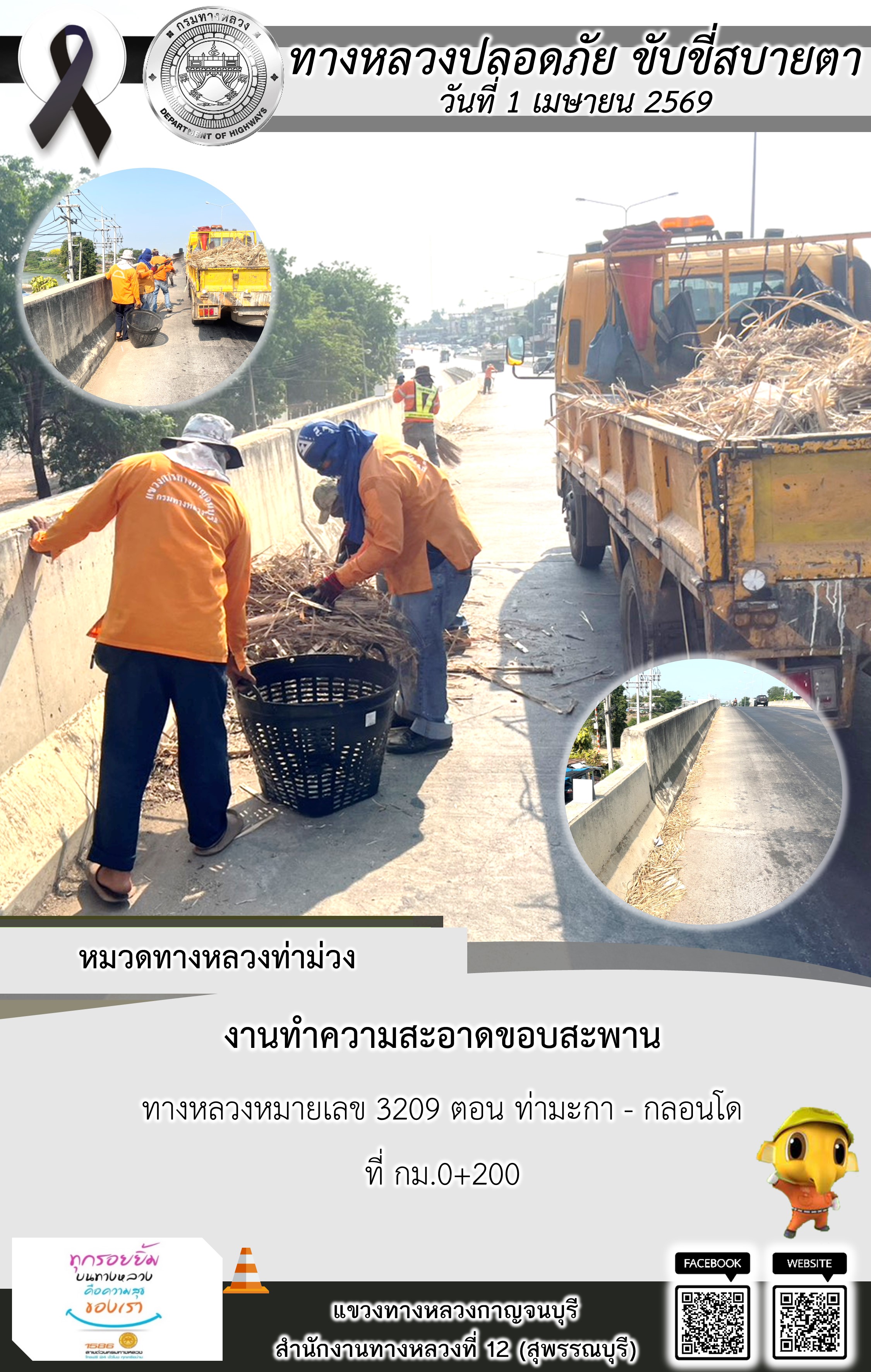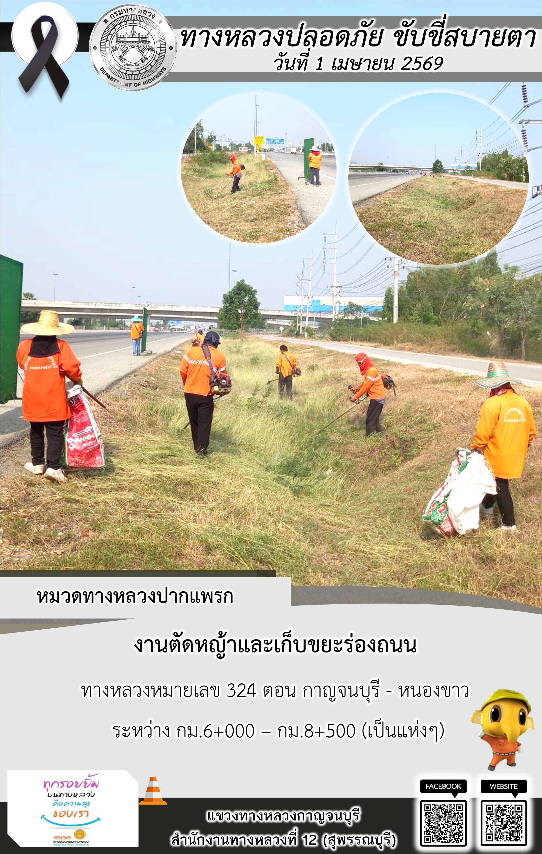 ข้อมูลภาพกิจกรรม : แขวงทางหลวงกาญจนบุรี โดยหมวดทางหลวงในสังกัด และงานอำนวยความปลอดภัยปฏิบัติงาน ประจำวันที่ 1 เม.ย. 69