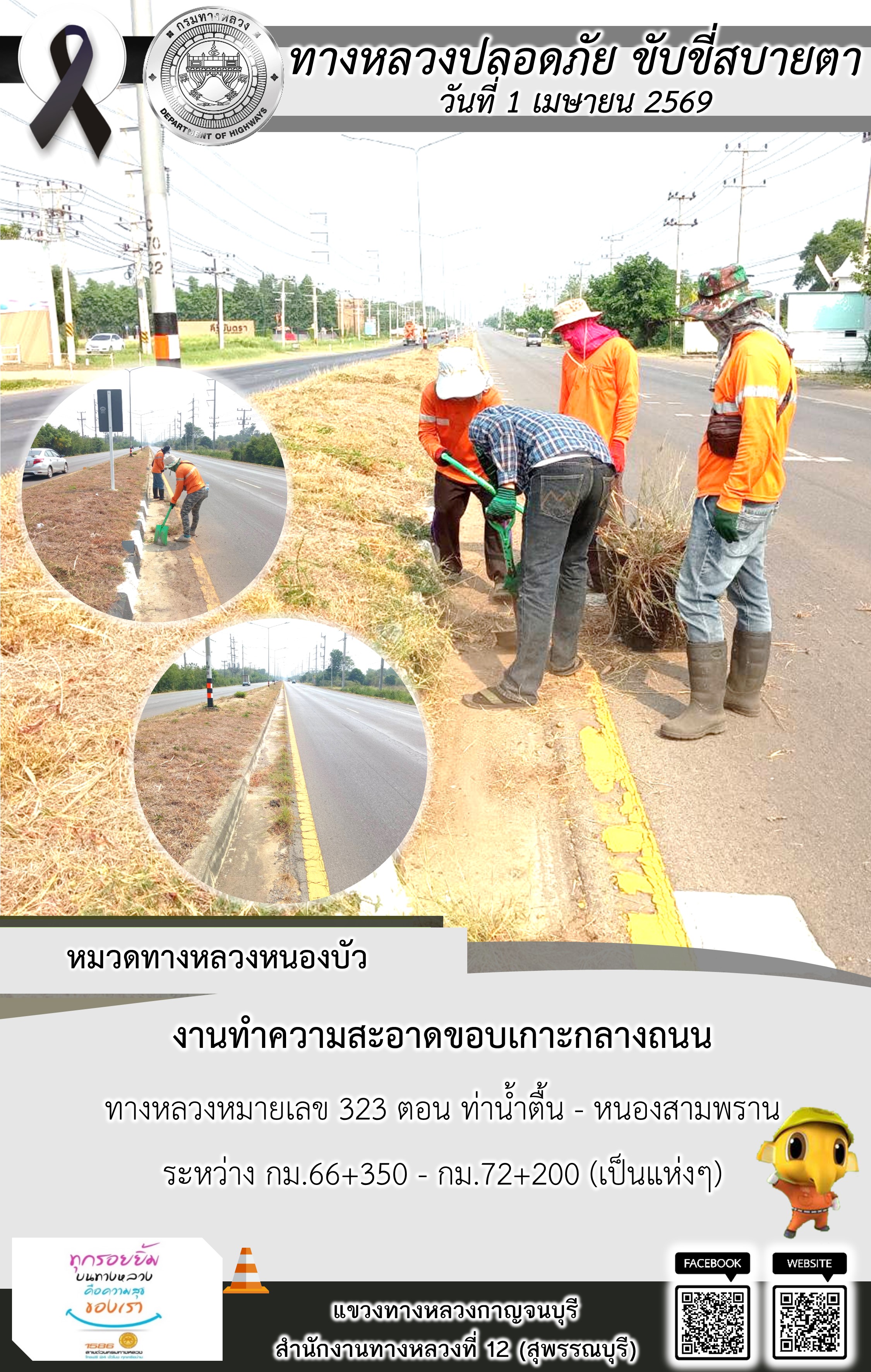 แขวงทางหลวงกาญจนบุรี โดยหมวดทางหลวงในสังกัด และงานอำนวยความปลอดภัยปฏิบัติงาน ประจำวันที่ 1 เม.ย. 69
