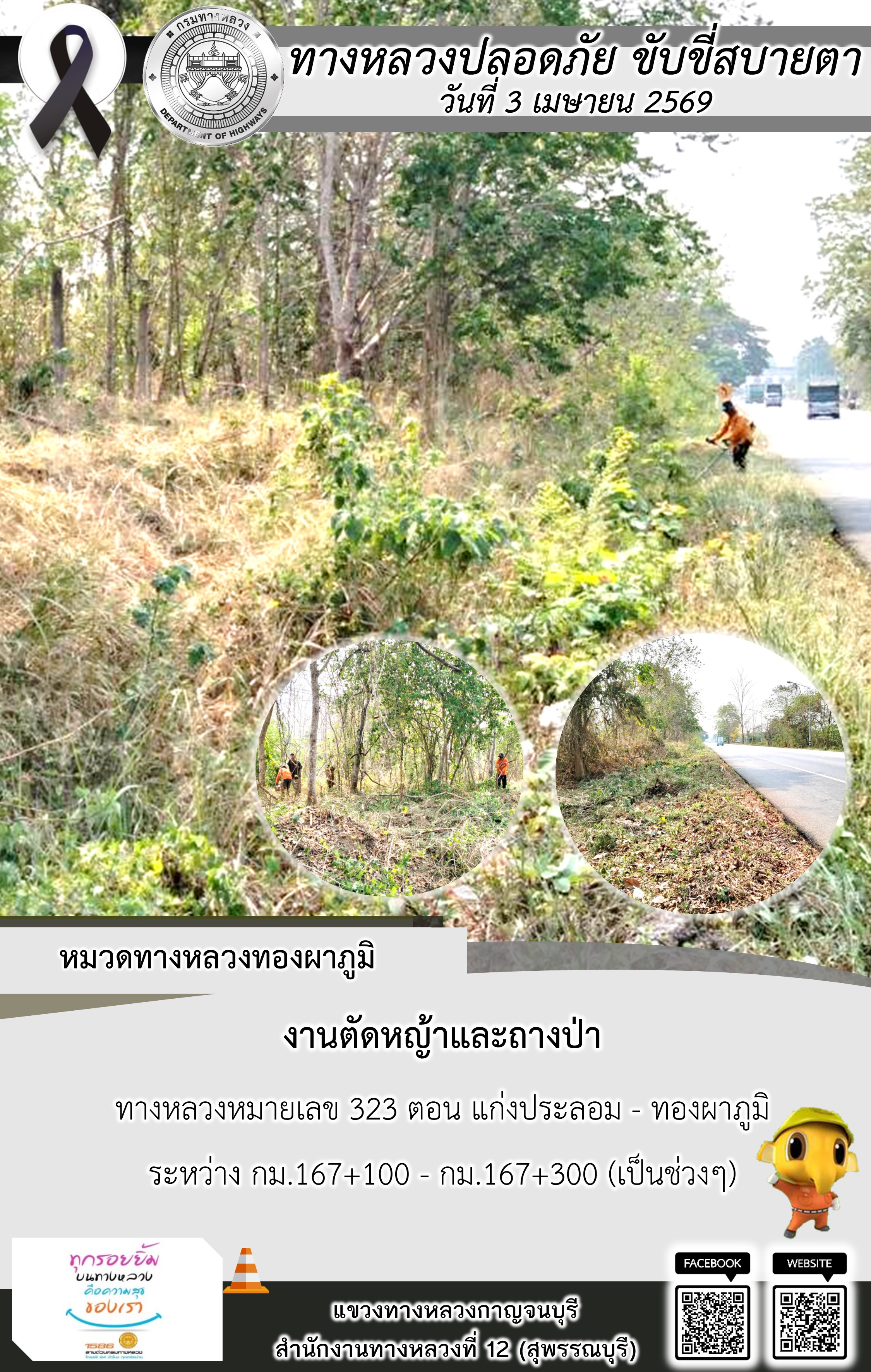 ข้อมูลภาพกิจกรรม : แขวงทางหลวงกาญจนบุรี โดยหมวดทางหลวงในสังกัด และงานอำนวยความปลอดภัยปฏิบัติงาน ประจำวันที่ 3 เม.ย. 69