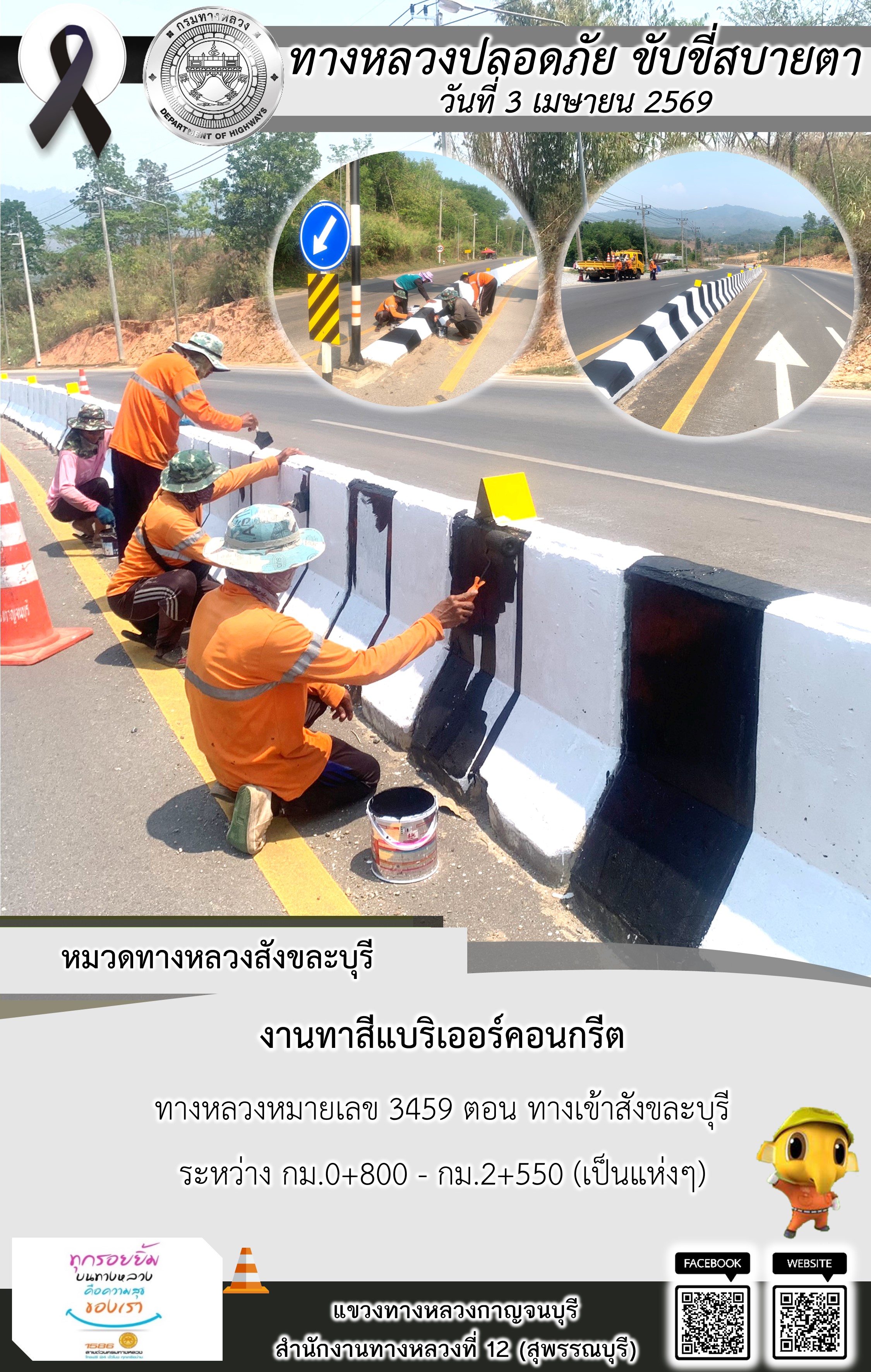 แขวงทางหลวงกาญจนบุรี โดยหมวดทางหลวงในสังกัด และงานอำนวยความปลอดภัยปฏิบัติงาน ประจำวันที่ 3 เม.ย. 69