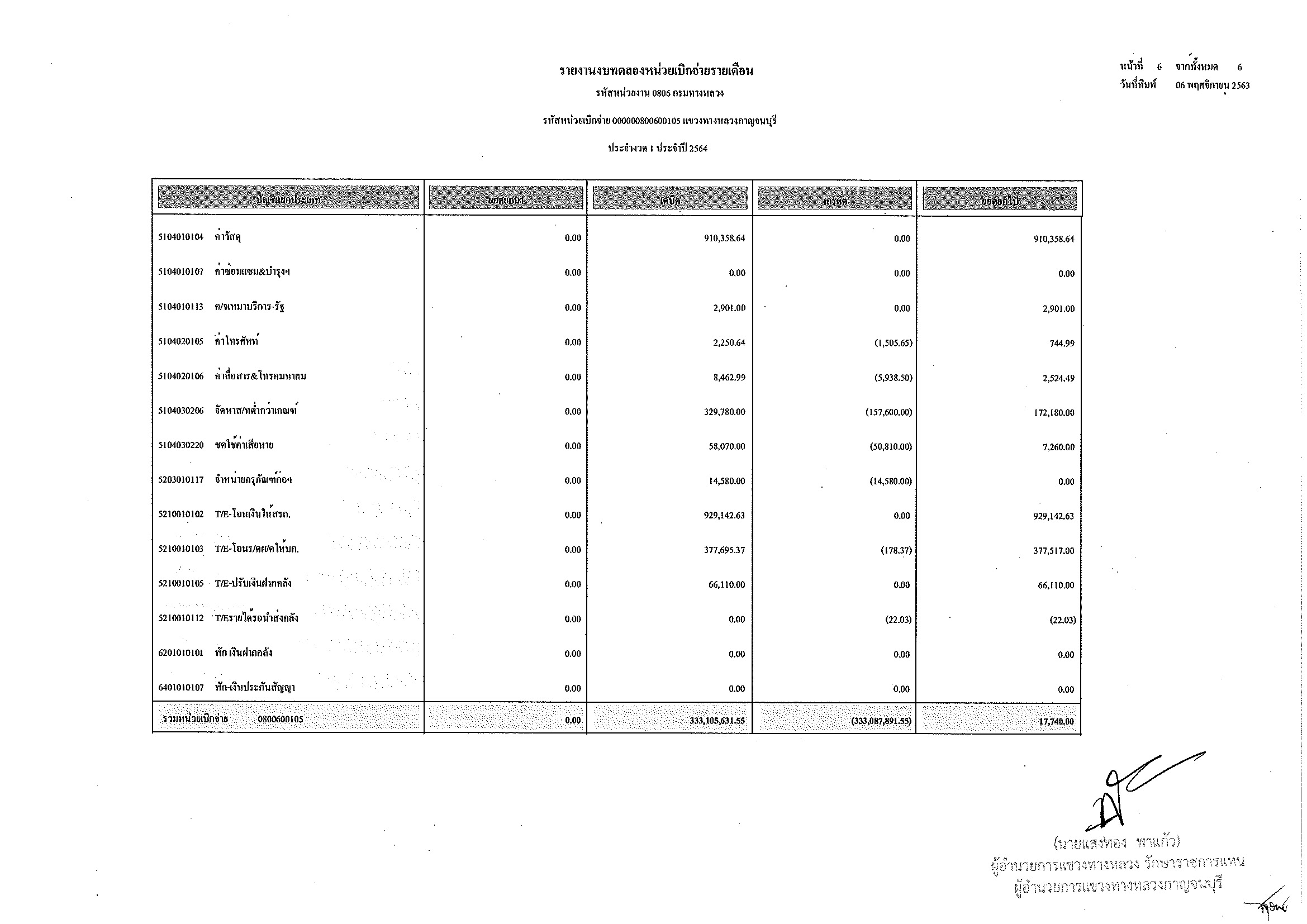 รายงานงบทดลองหน่วยเบิกจ่ายรายเดือน ประจำงวด 1 ประจำปีที่ 2564
