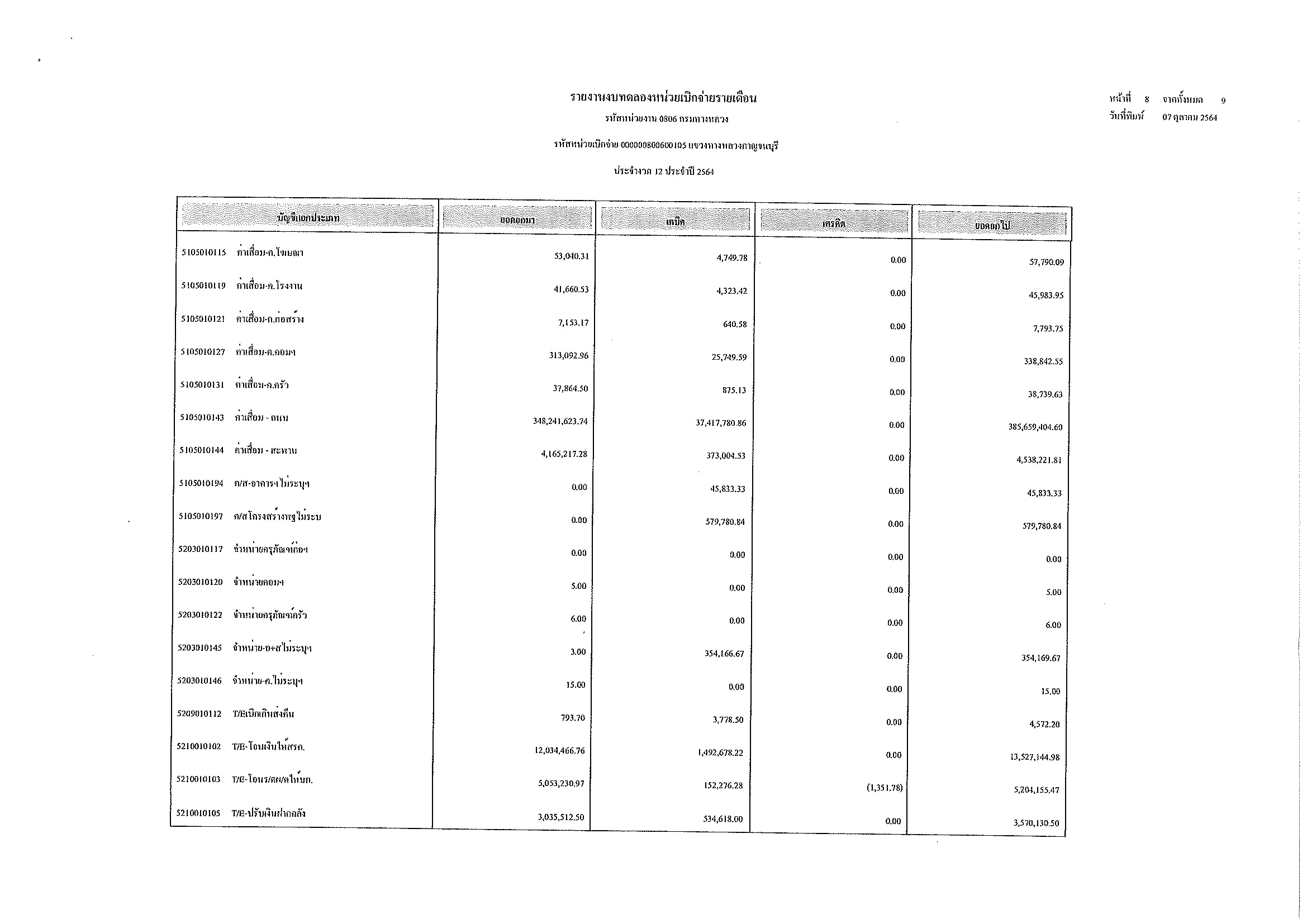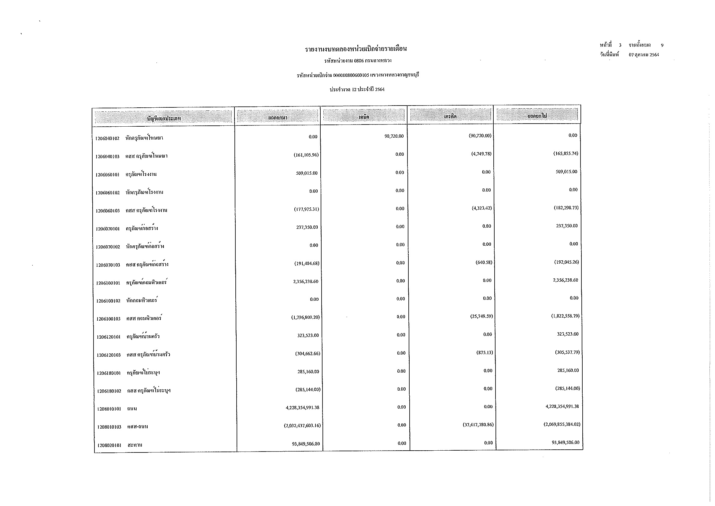 รายงานงบทดลองหน่วยเบิกจ่ายรายเดือน ประจำงวด 12 ประจำปีที่ 2564