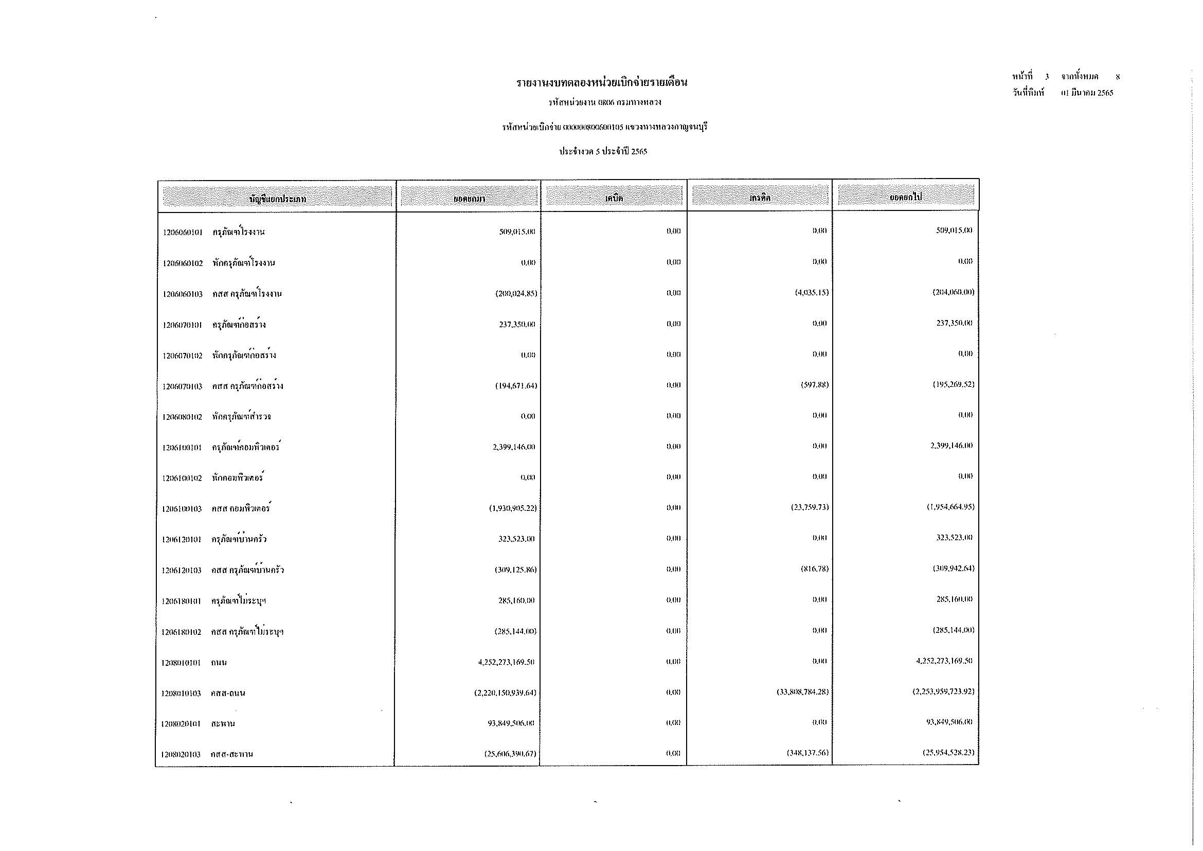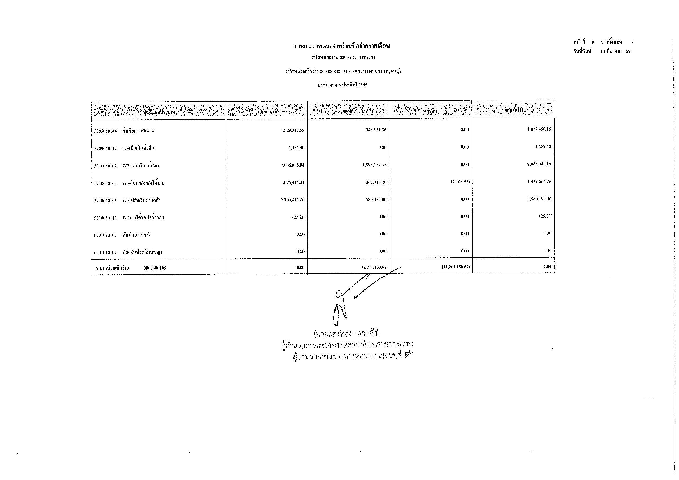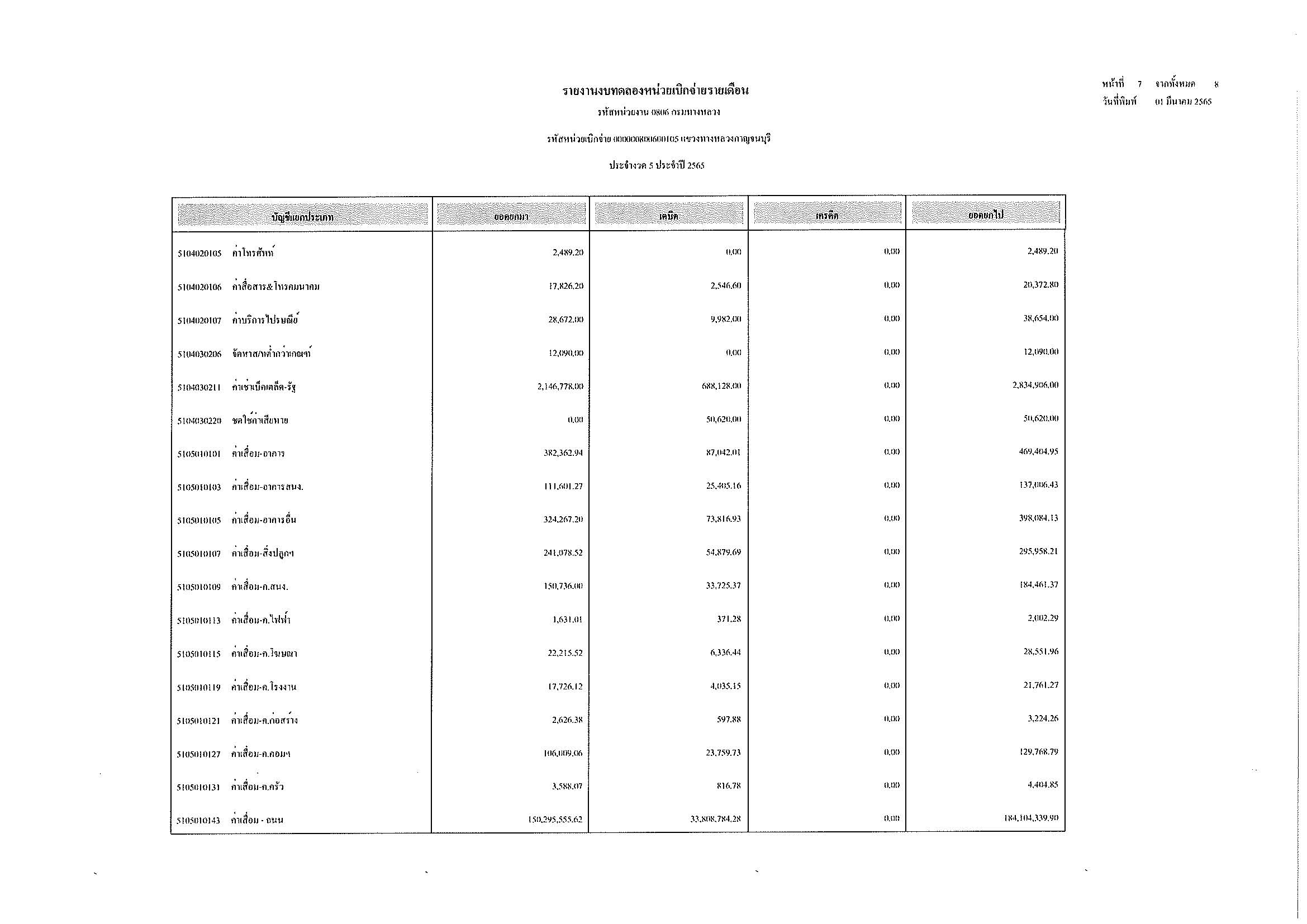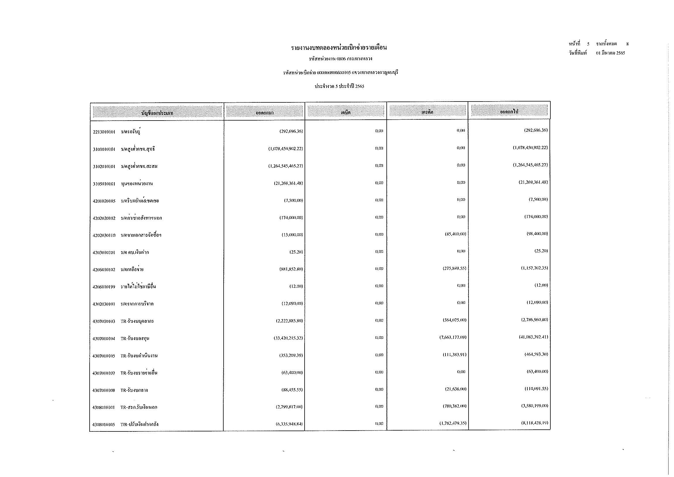 รายงานงบทดลองหน่วยเบิกจ่ายรายเดือน ประจำงวด 5 ประจำปีที่ 2565