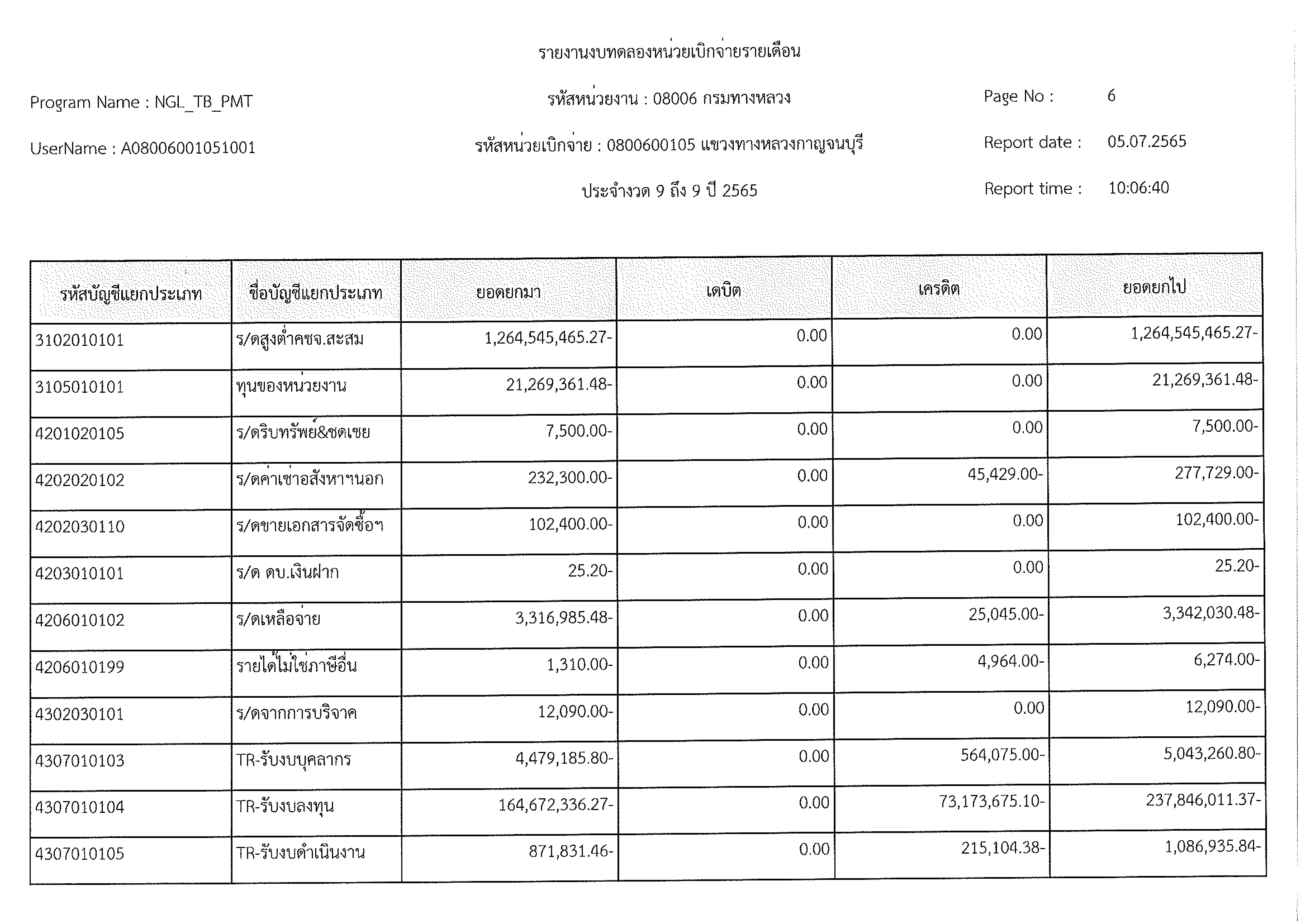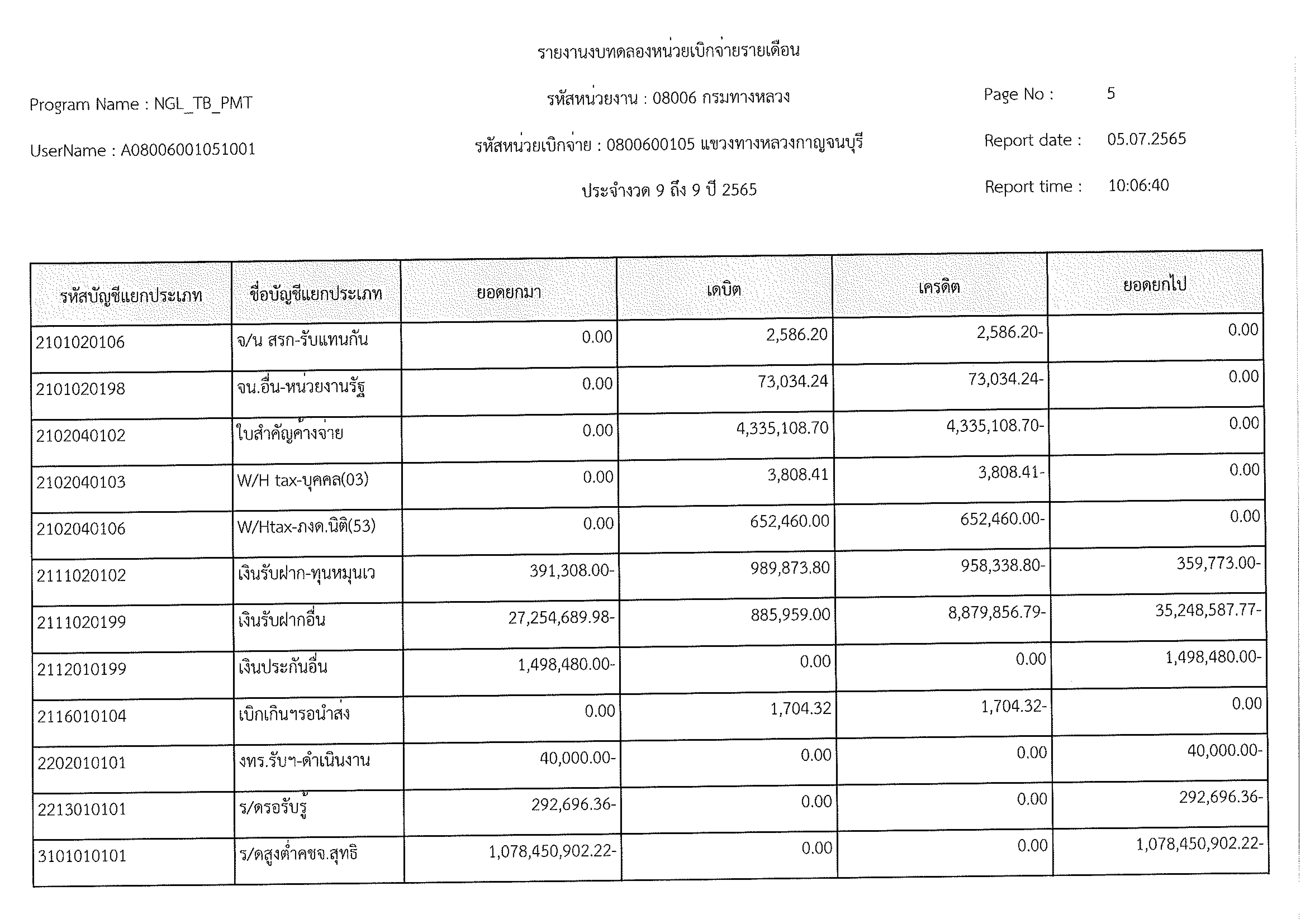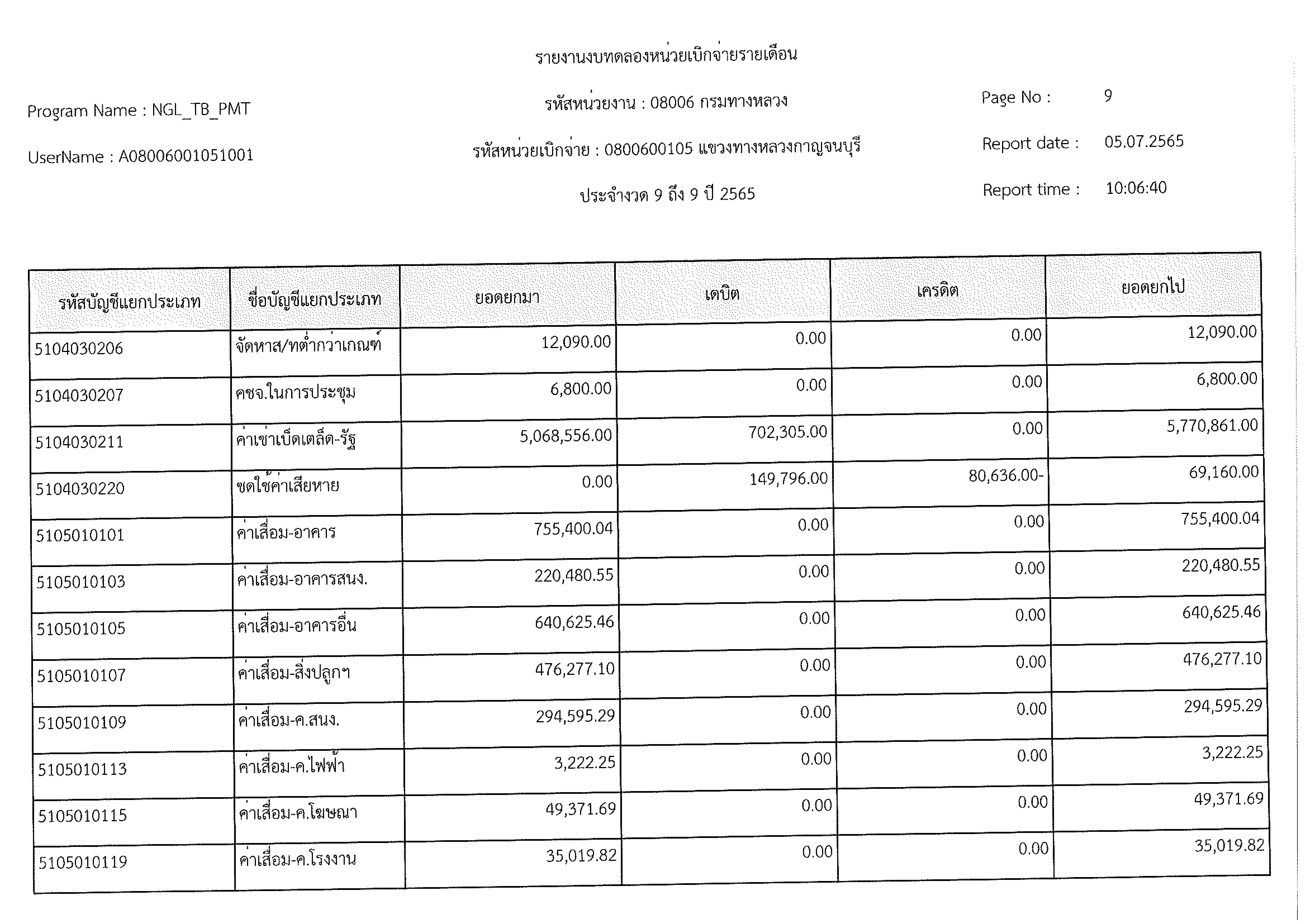 รายงานงบทดลองหน่วยเบิกจ่ายรายเดือน ประจำงวด 9 ประจำปีที่ 2565