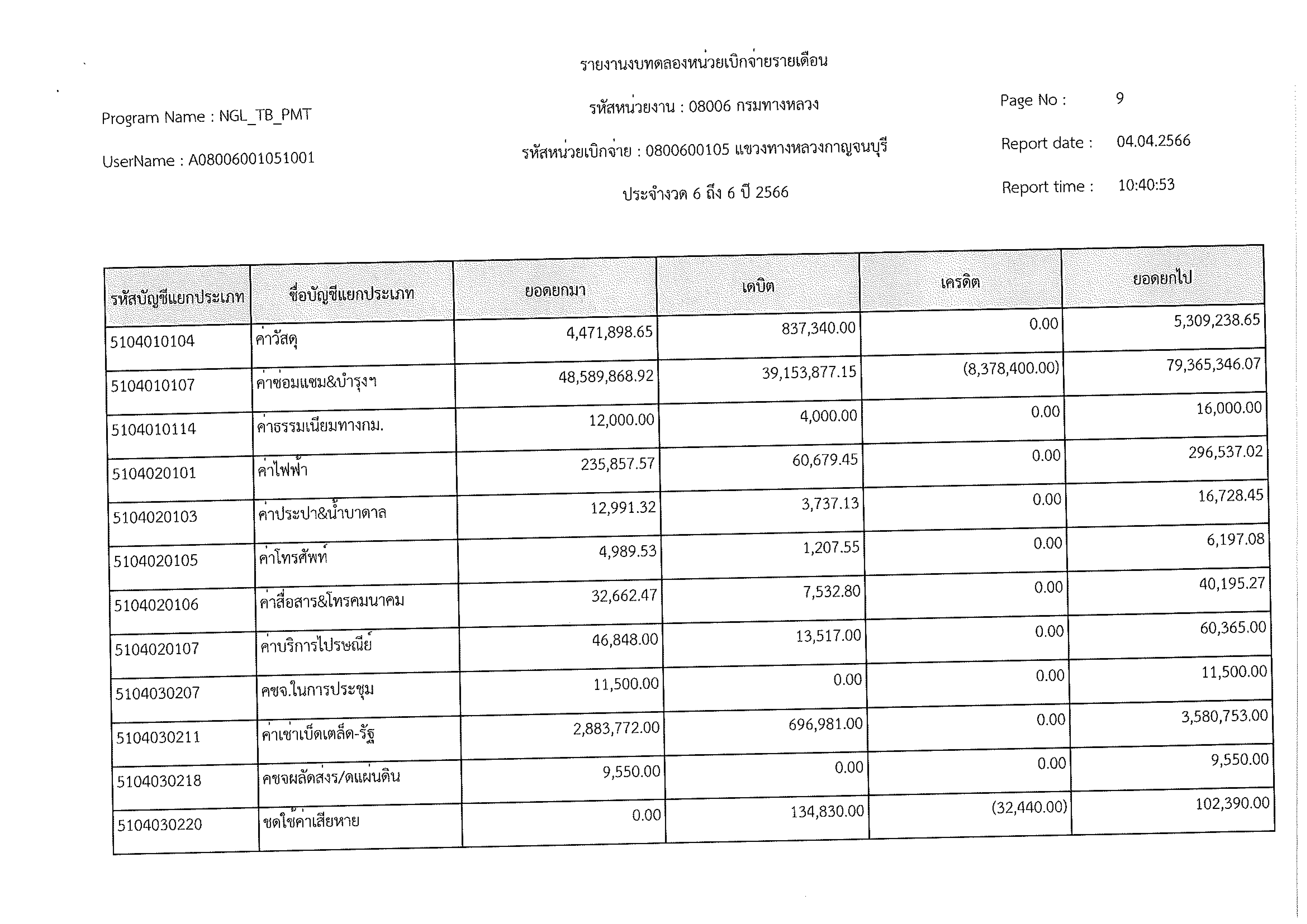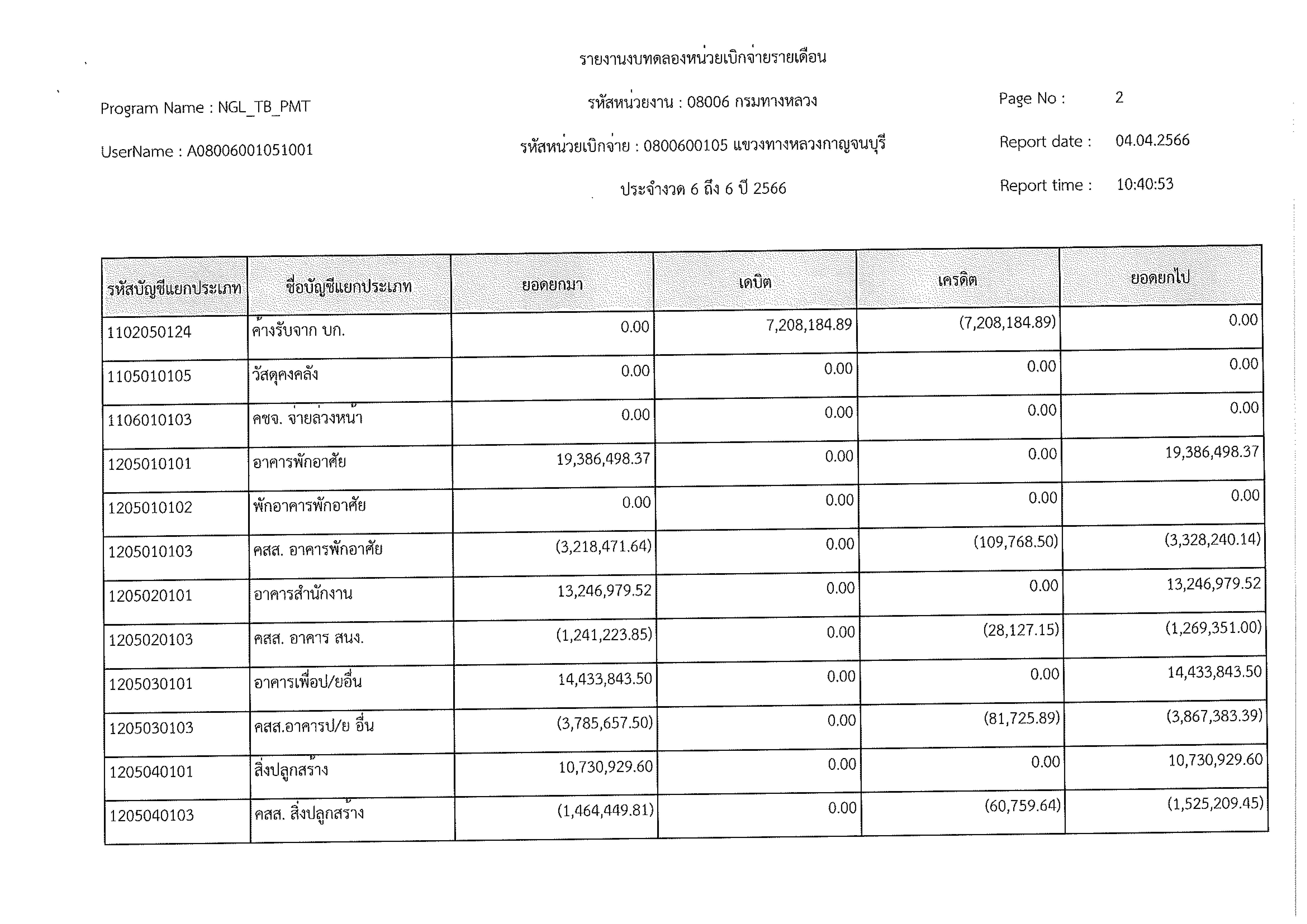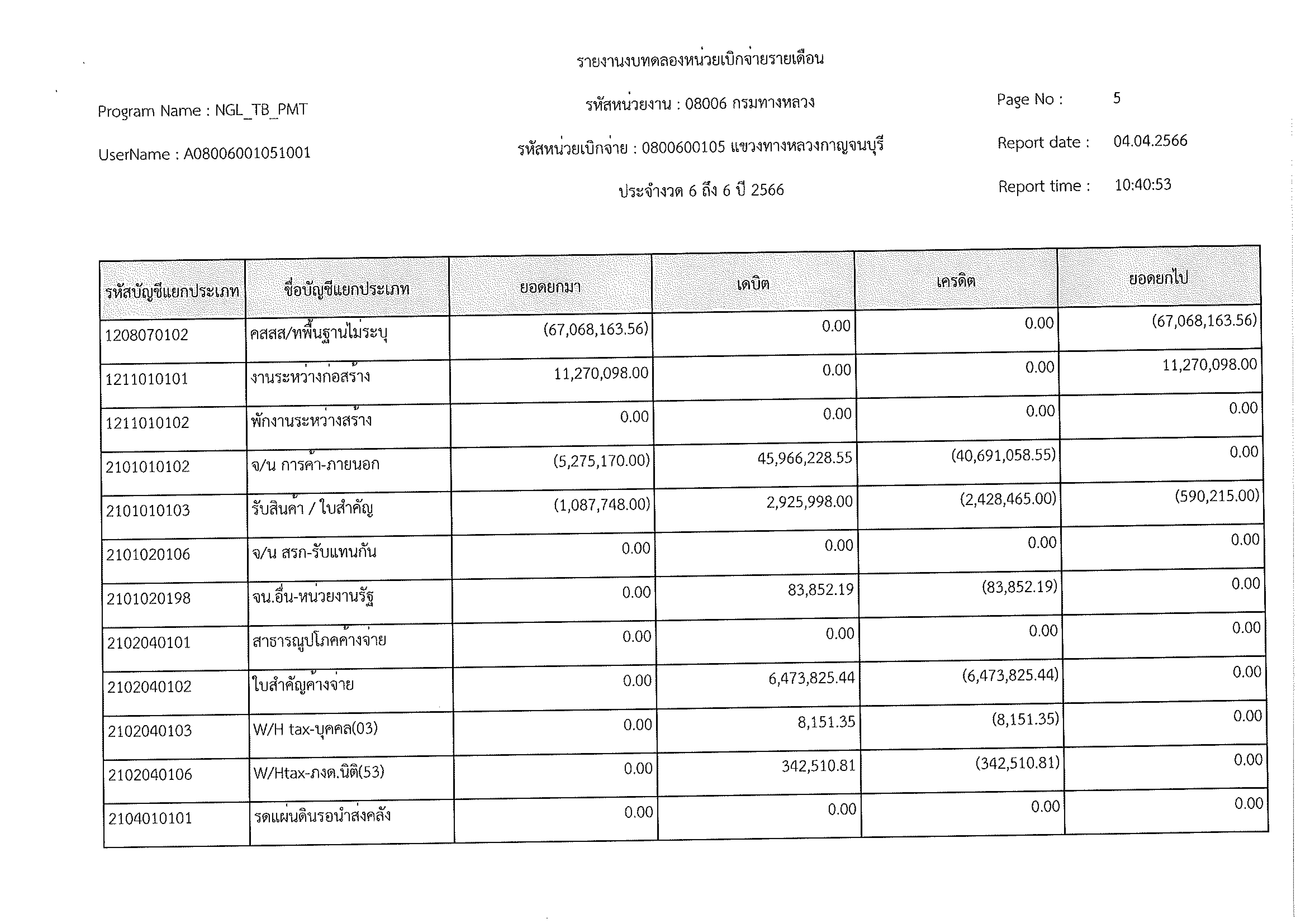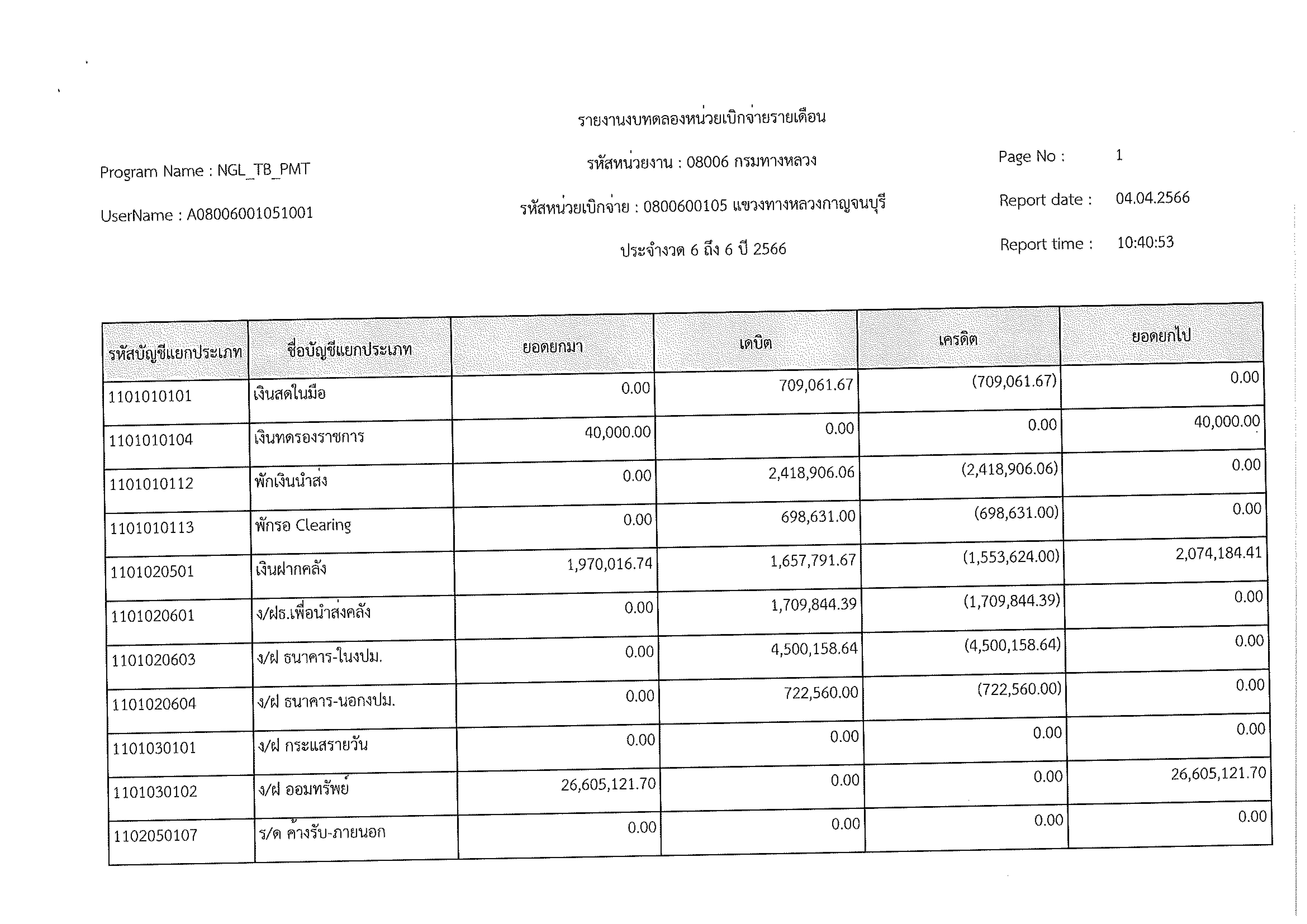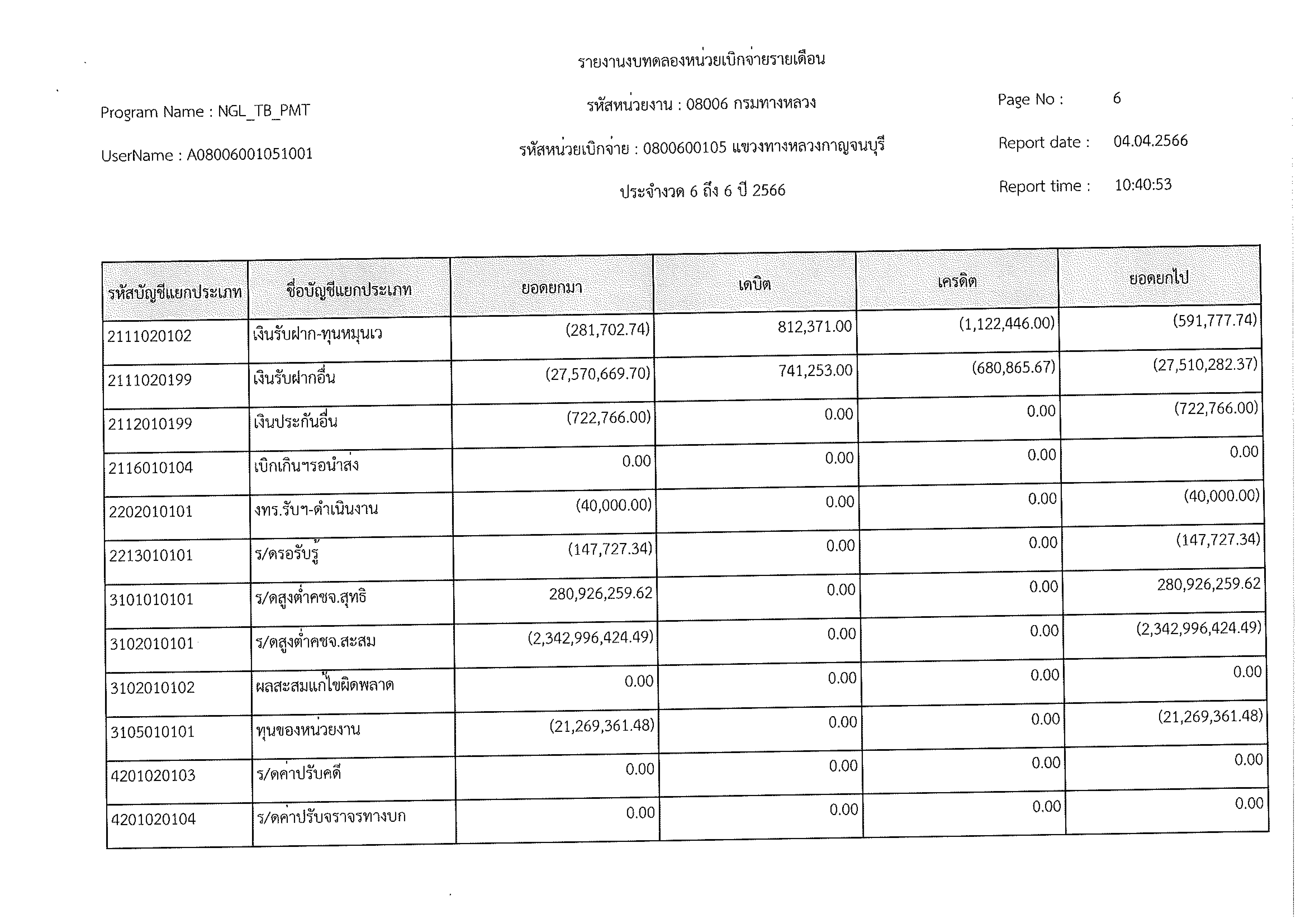 รายงานงบทดลองหน่วยเบิกจ่ายรายเดือน ประจำงวด 6 ประจำปีที่ 2566