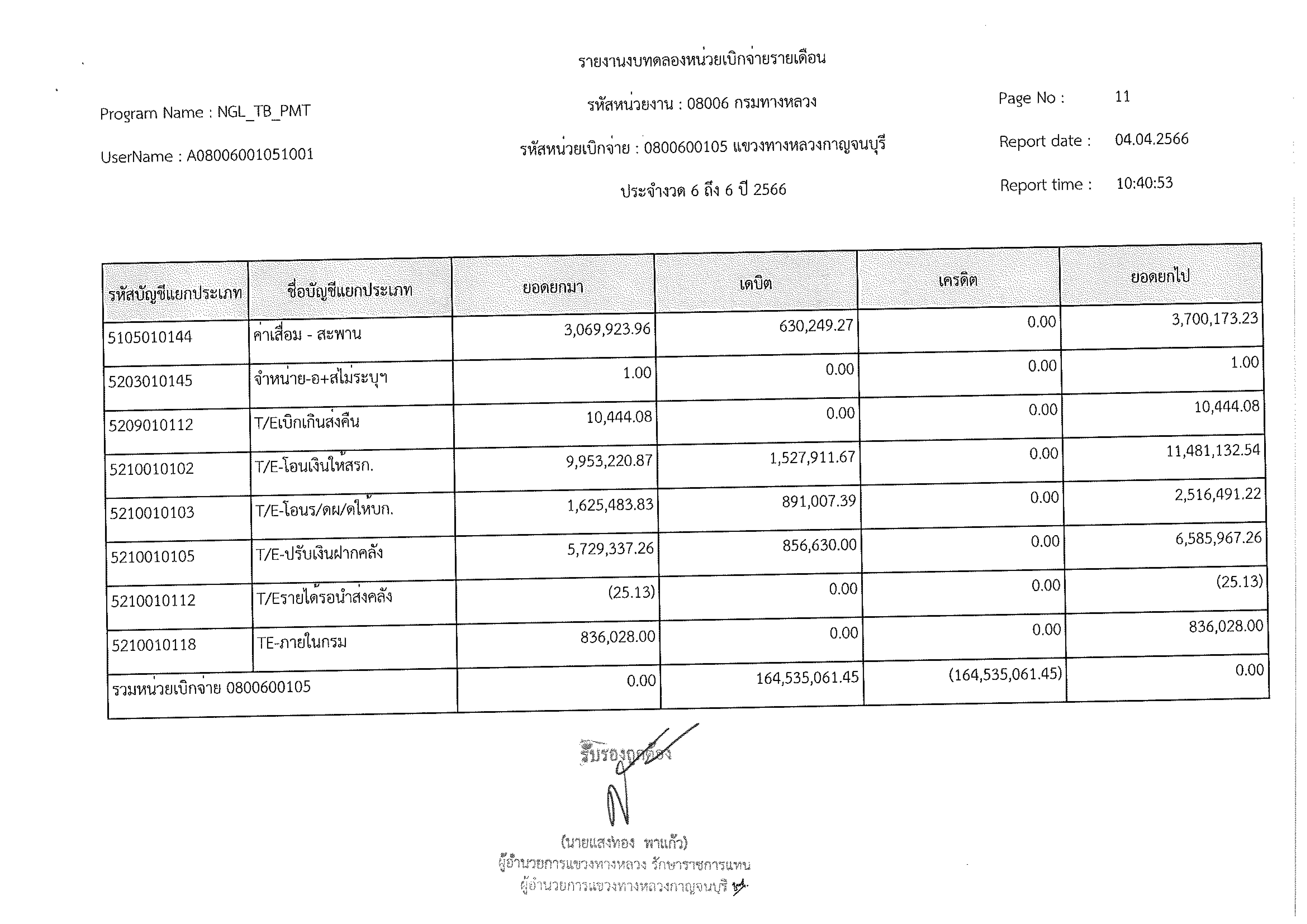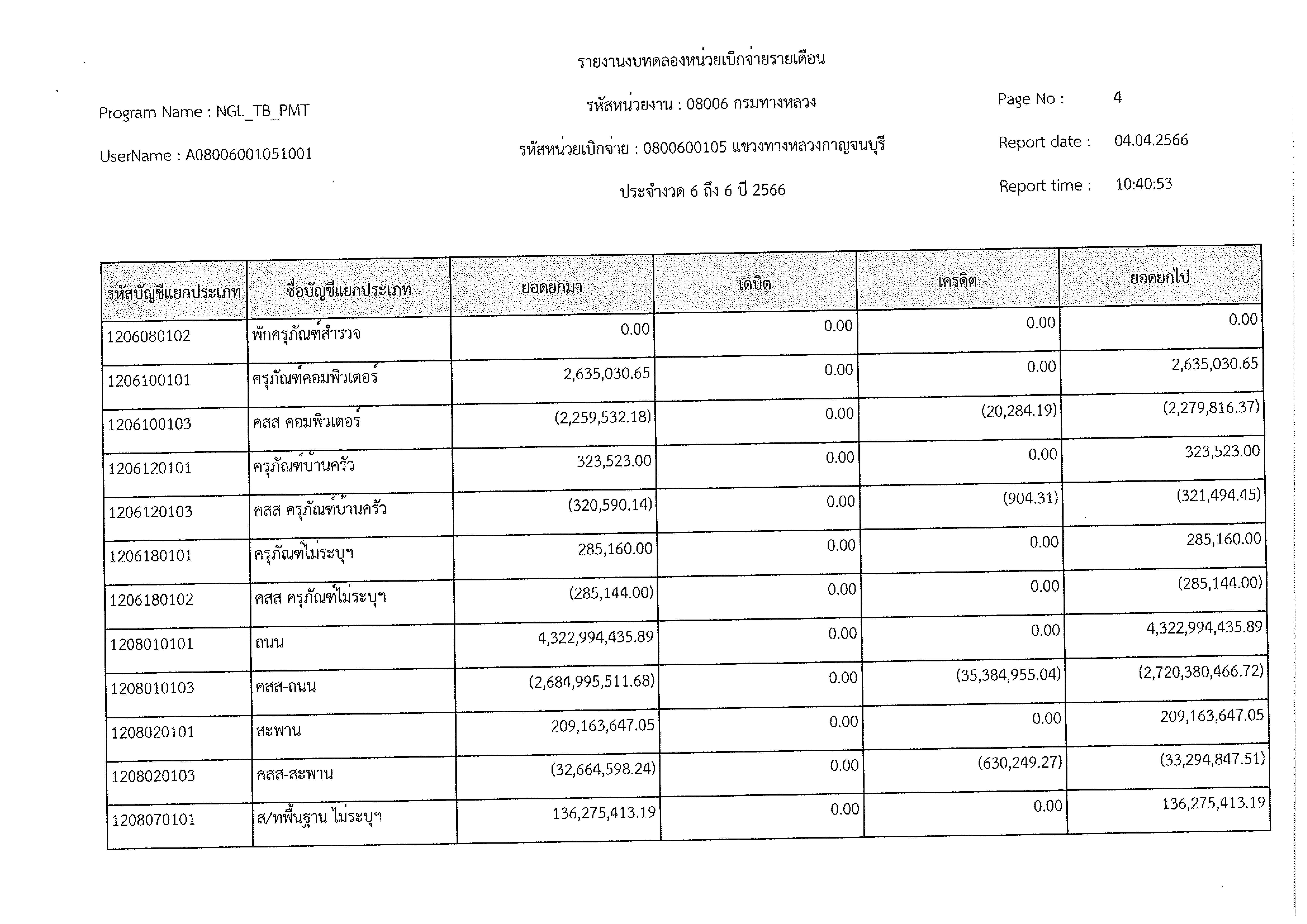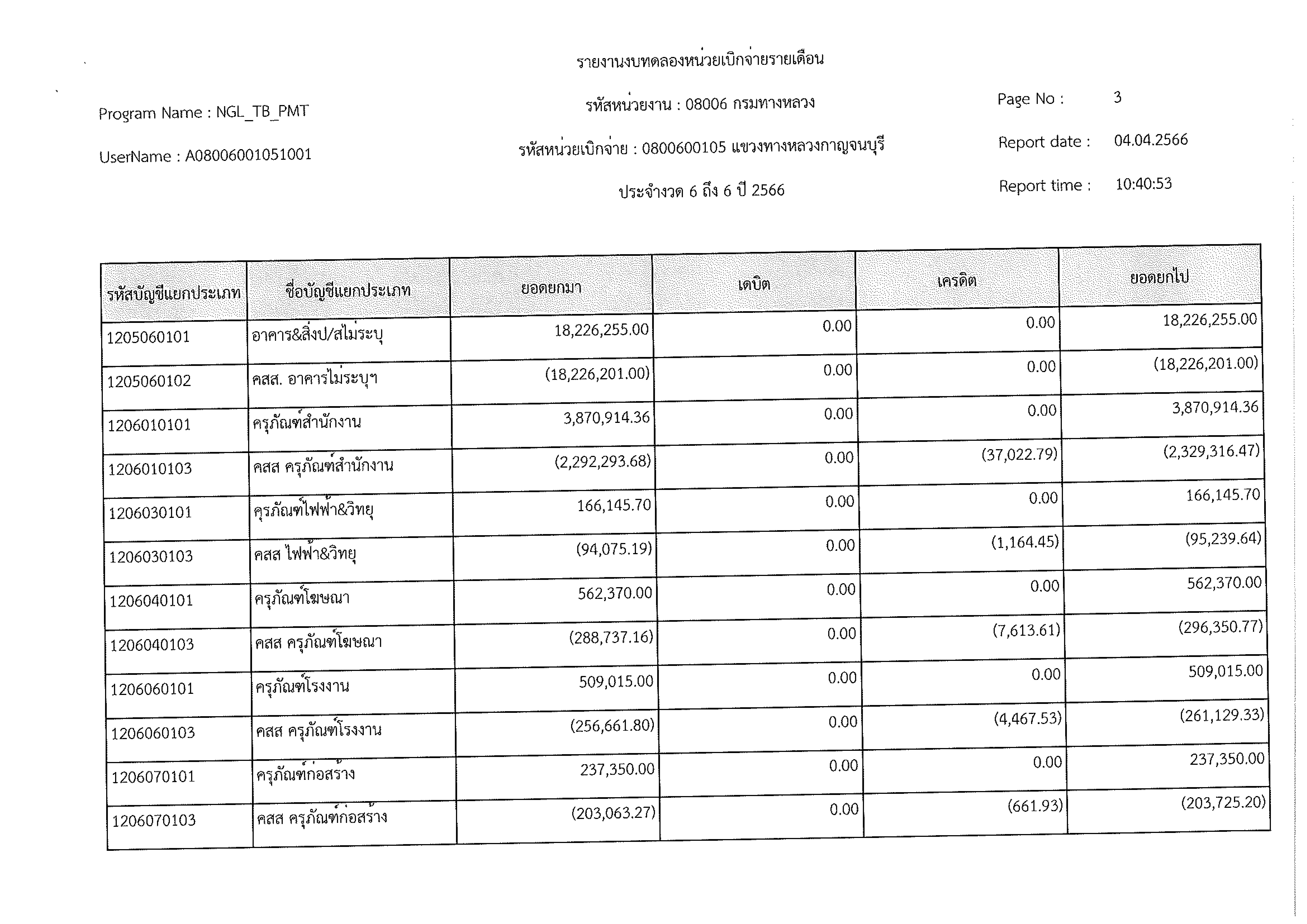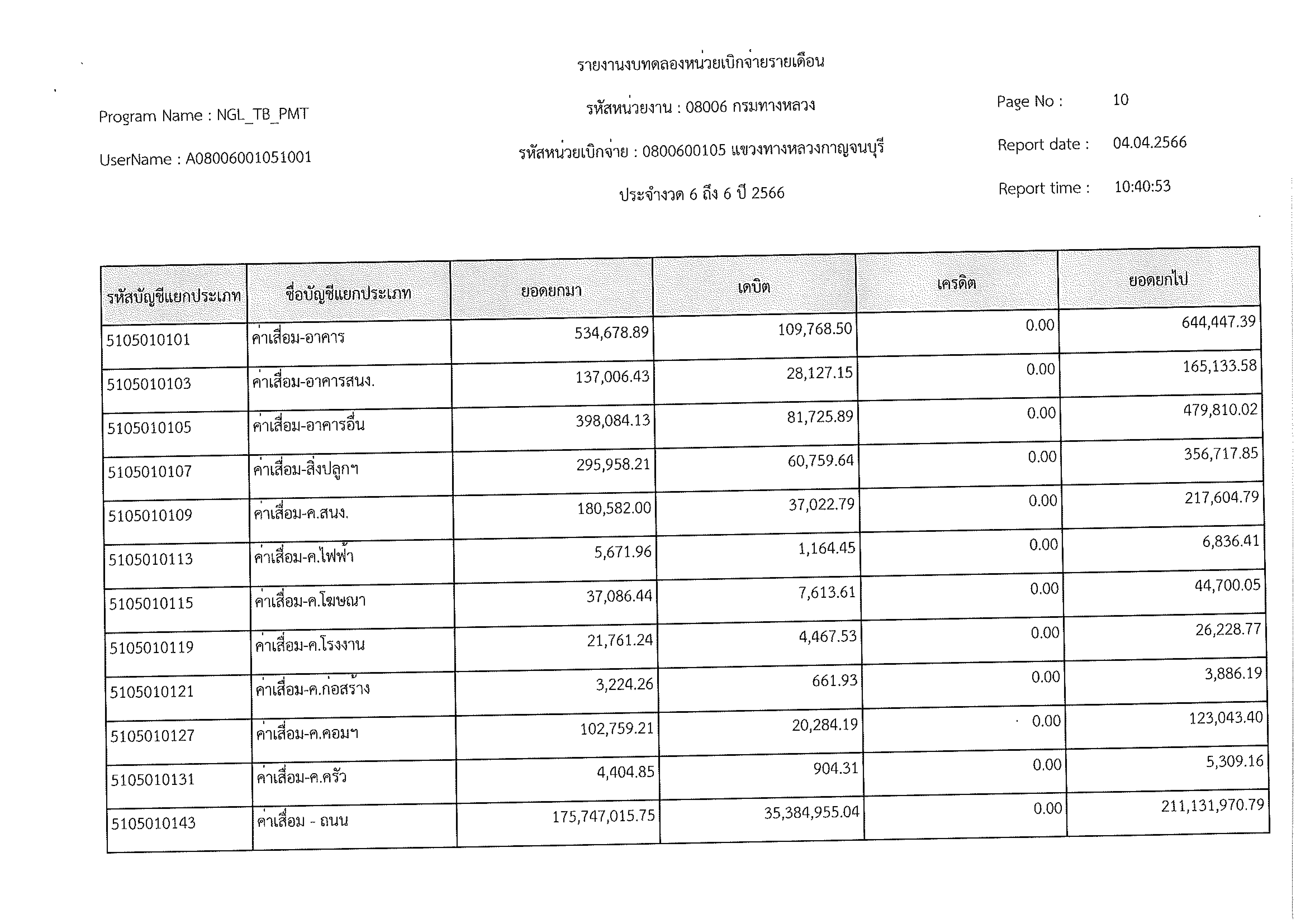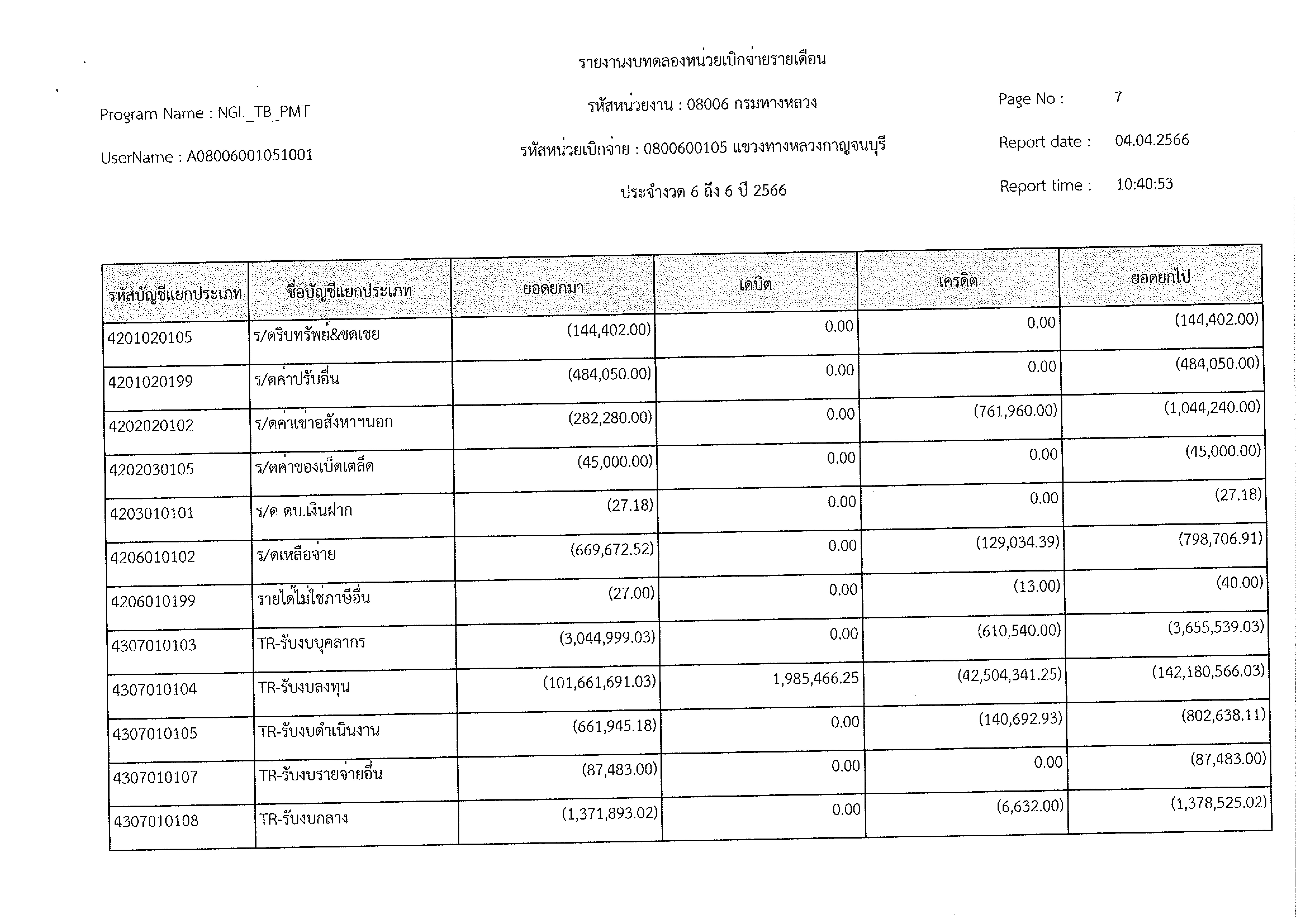 รายงานงบทดลองหน่วยเบิกจ่ายรายเดือน ประจำงวด 6 ประจำปีที่ 2566