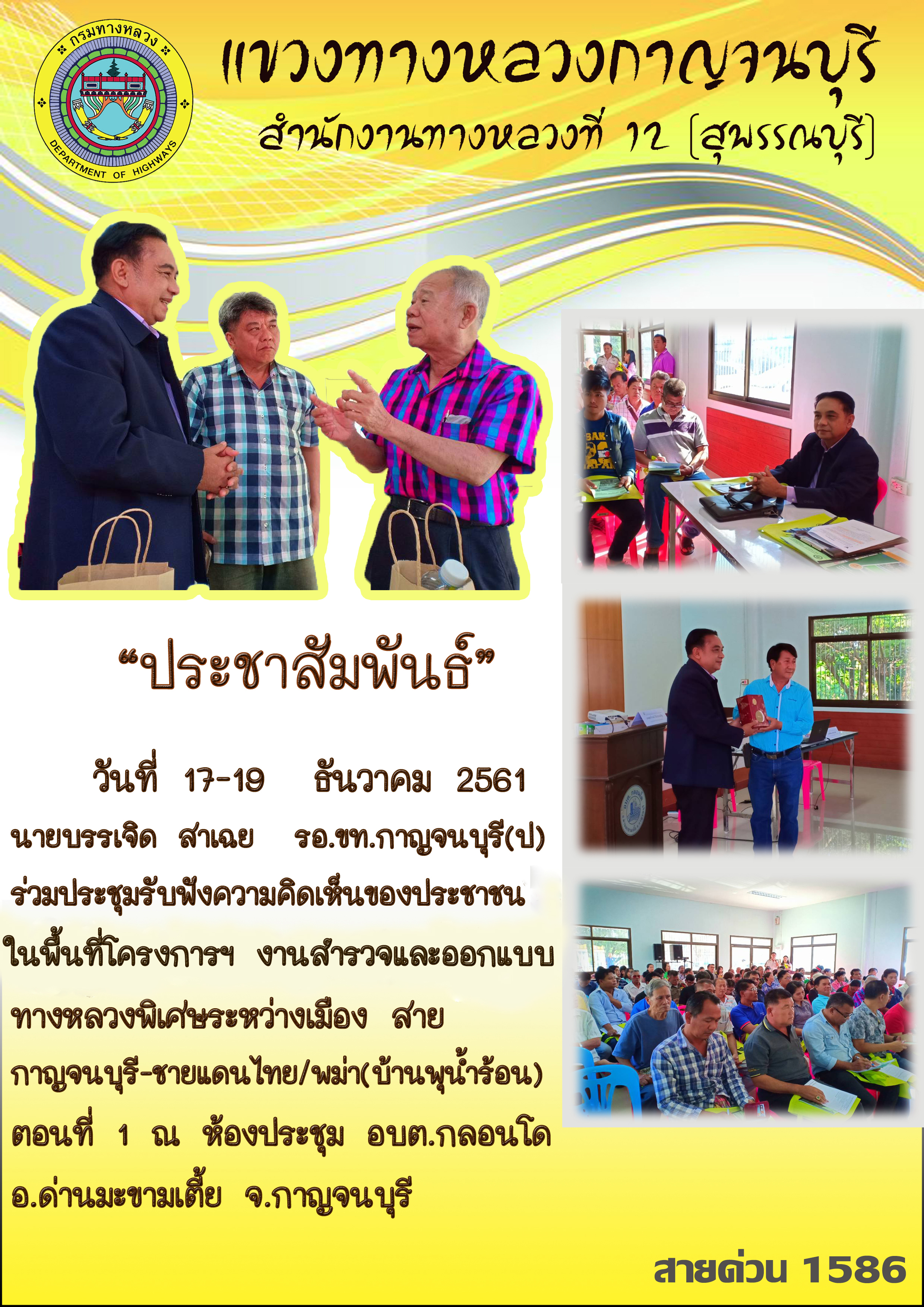 ข้อมูลข่าว : นายบรรเจิด สาเฉย รองผู้อำนวยการฝ่ายปฎิบัติการ แขวงทางหลวงกาญจนบุรี ร่วมประชุมรับฟังความคิดเห็นของประชาชนในพื้นที่โครงการฯ งานสำรวจและออกแบบทางหลวงพิเศษระหว่างเมือง 19/12/61
