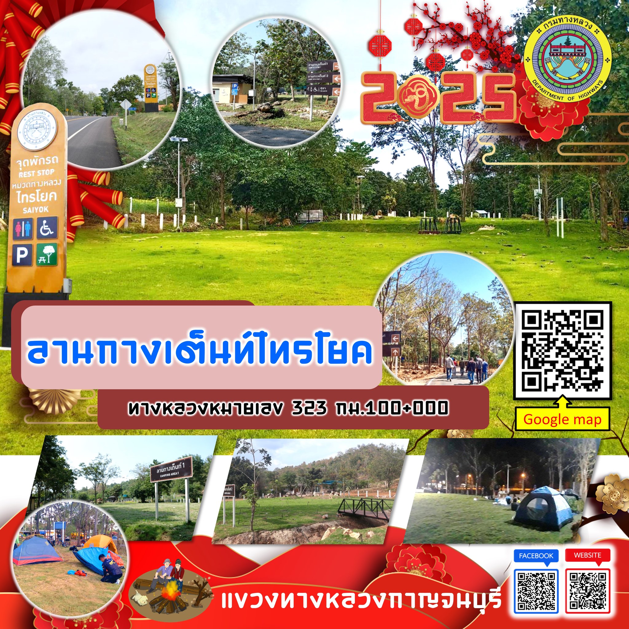 แผนที่แสดงจุดบริการประชาชนแขวงทางหลวงกาญจนบุรี สำนักงานทางหลวงที่ 12 (สุพรรณบุรี) กรมทางหลวง จุดบริการลานกางเต็นท์ จุดพักรถ ห้องน้ำ และสอบถามข้อมูลต่างๆ สำหรับนักท่องเที่ยวแวะพักใช้บริการ โดยมีเจ้าหน้าที่พร้อมบริการตลอด 24 ชั่วโมง ในช่วงเทศกาลปีใหม่ 2568