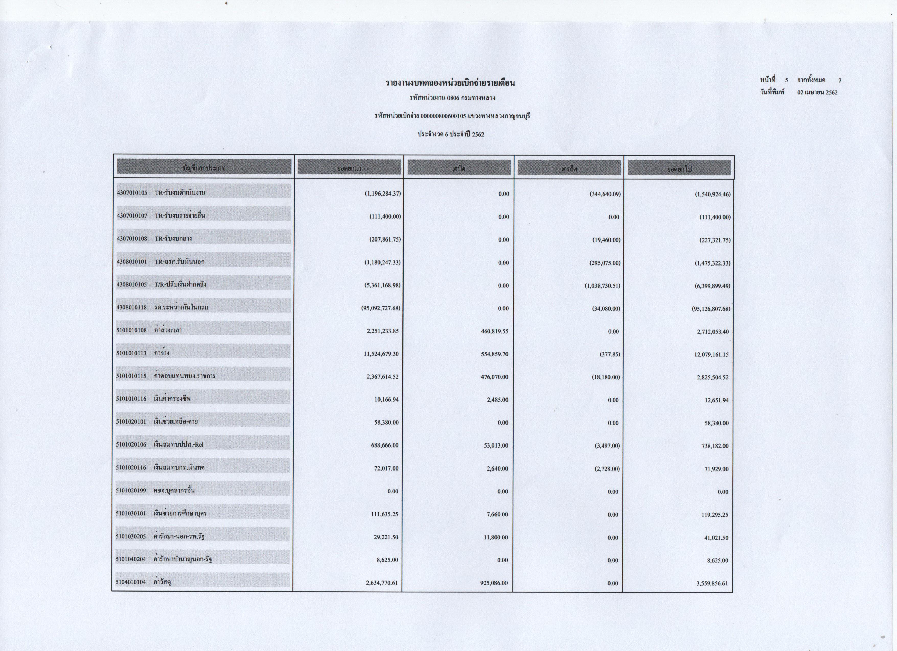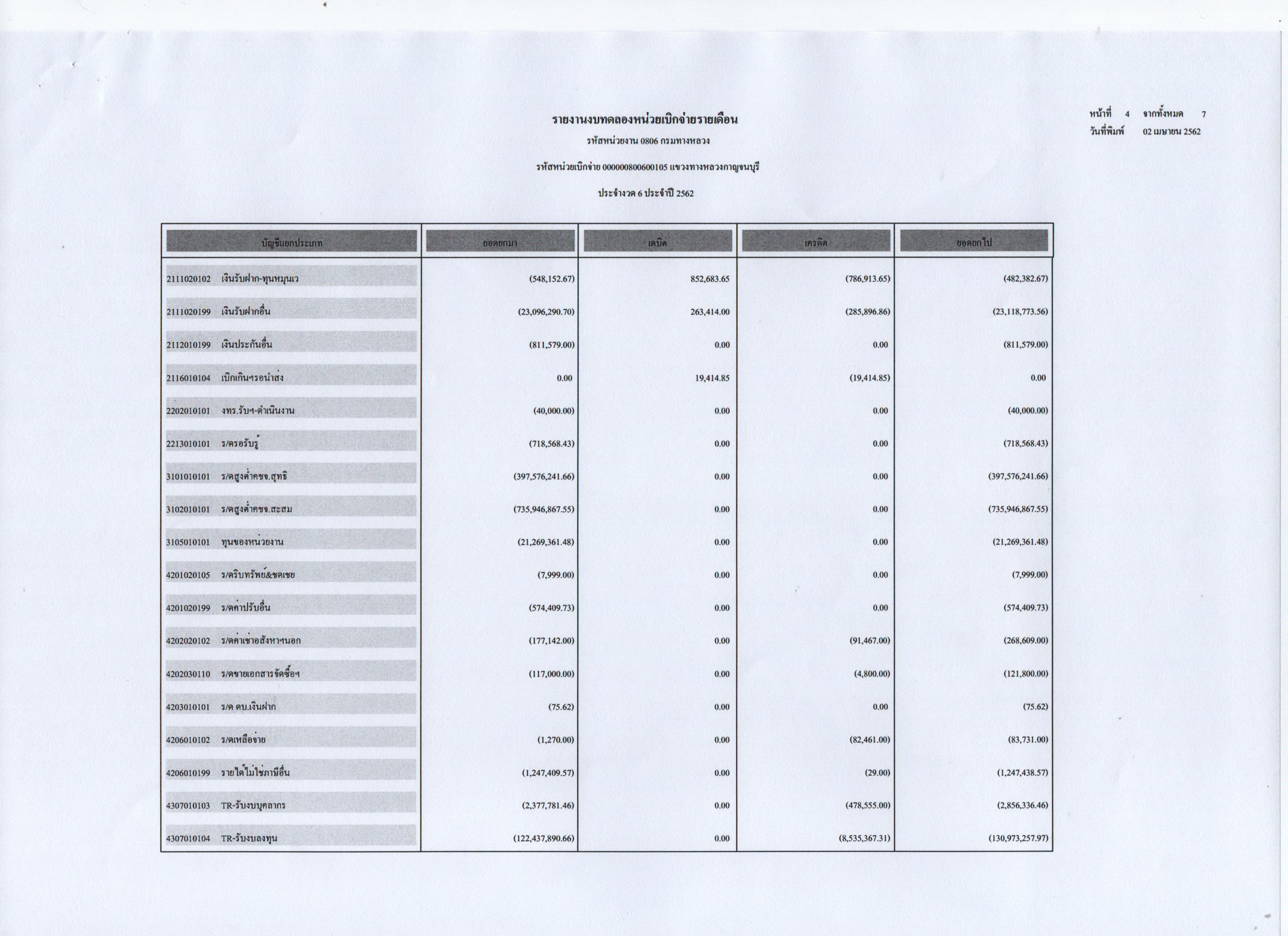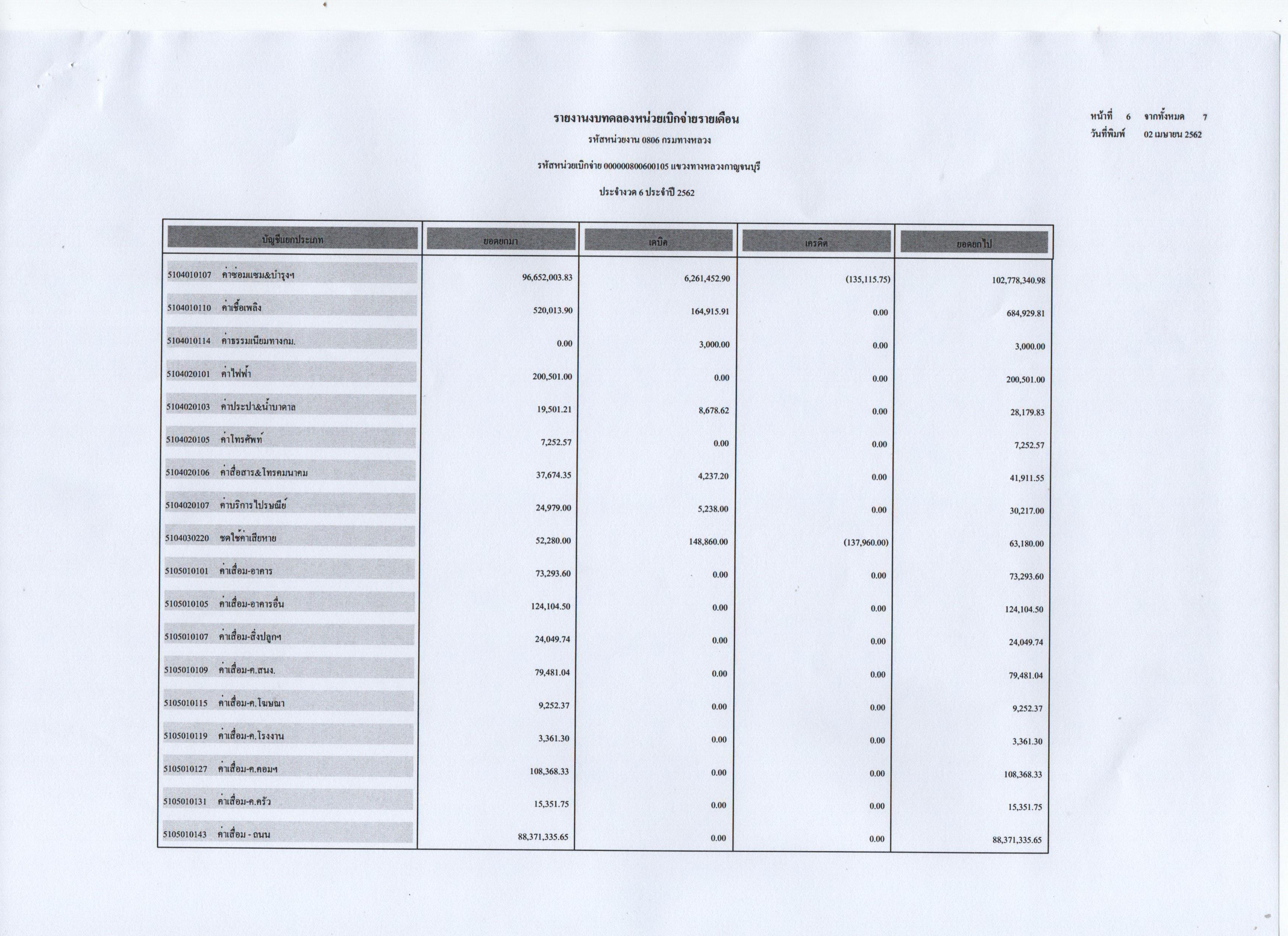 รายงานงบทดลองหน่วยเบิกจ่ายรายเดือน ประจำงวดที่ 6 ประจำปี 2562