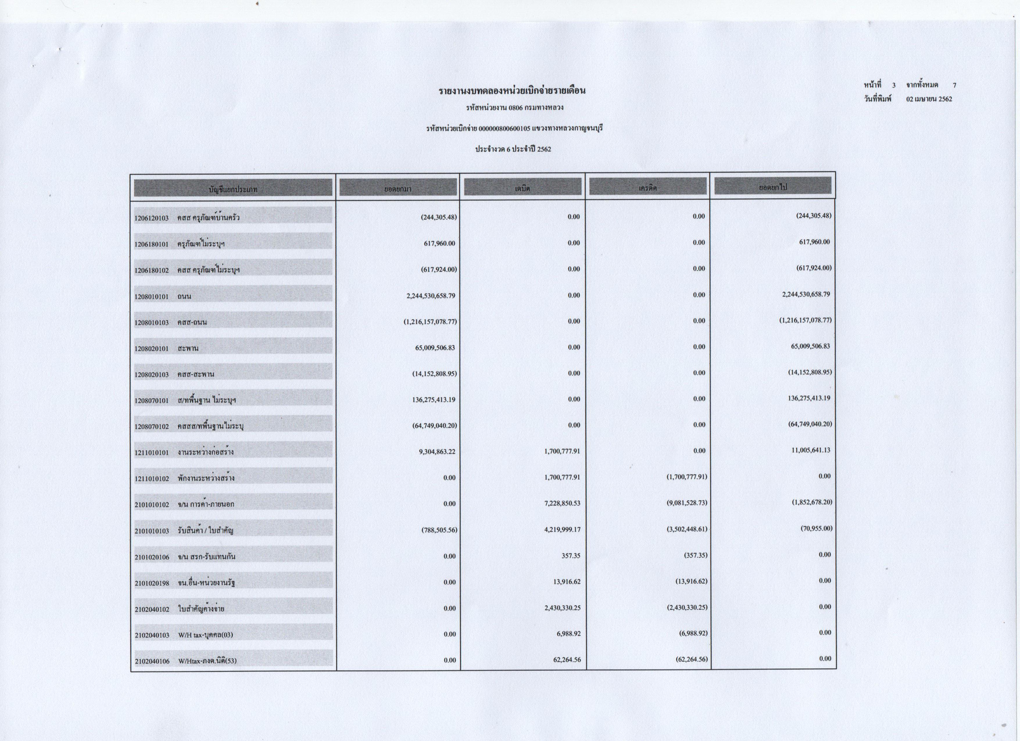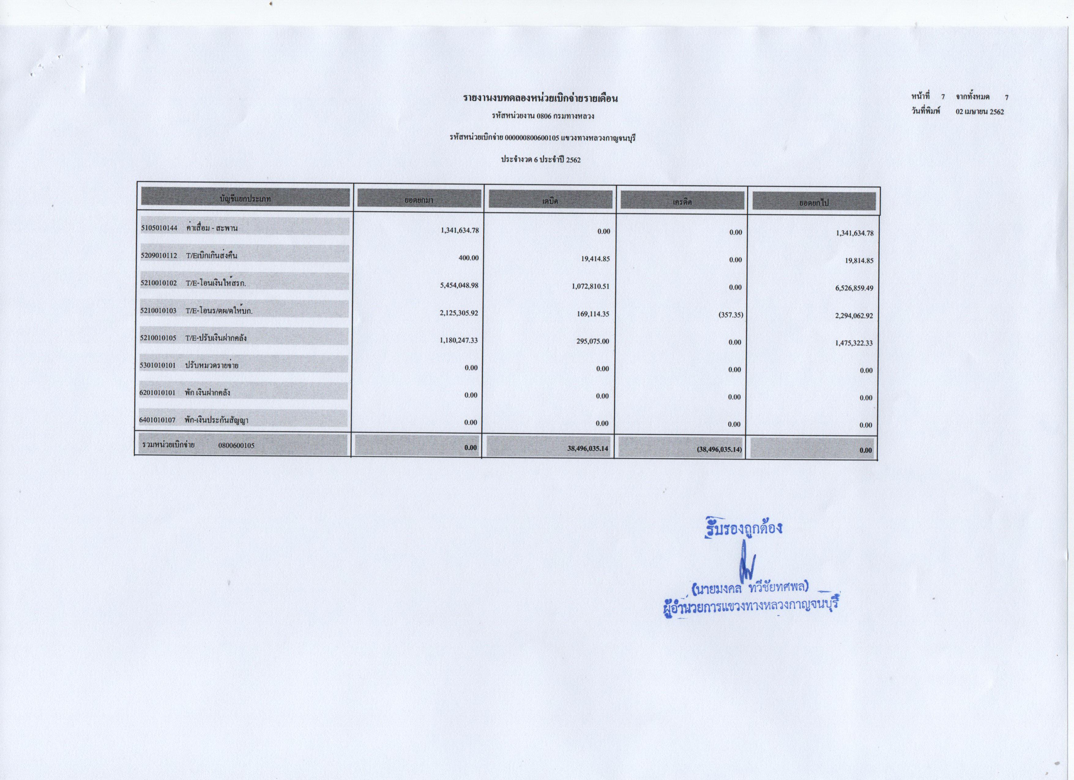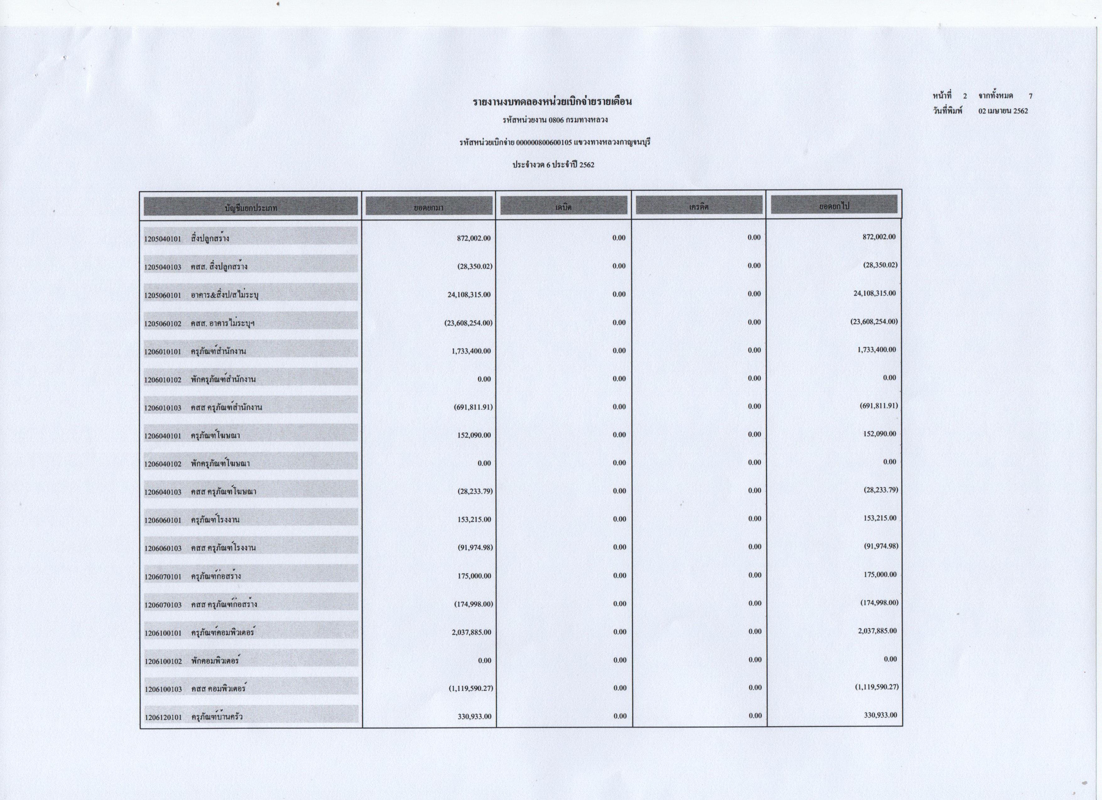 รายงานงบทดลองหน่วยเบิกจ่ายรายเดือน ประจำงวดที่ 6 ประจำปี 2562