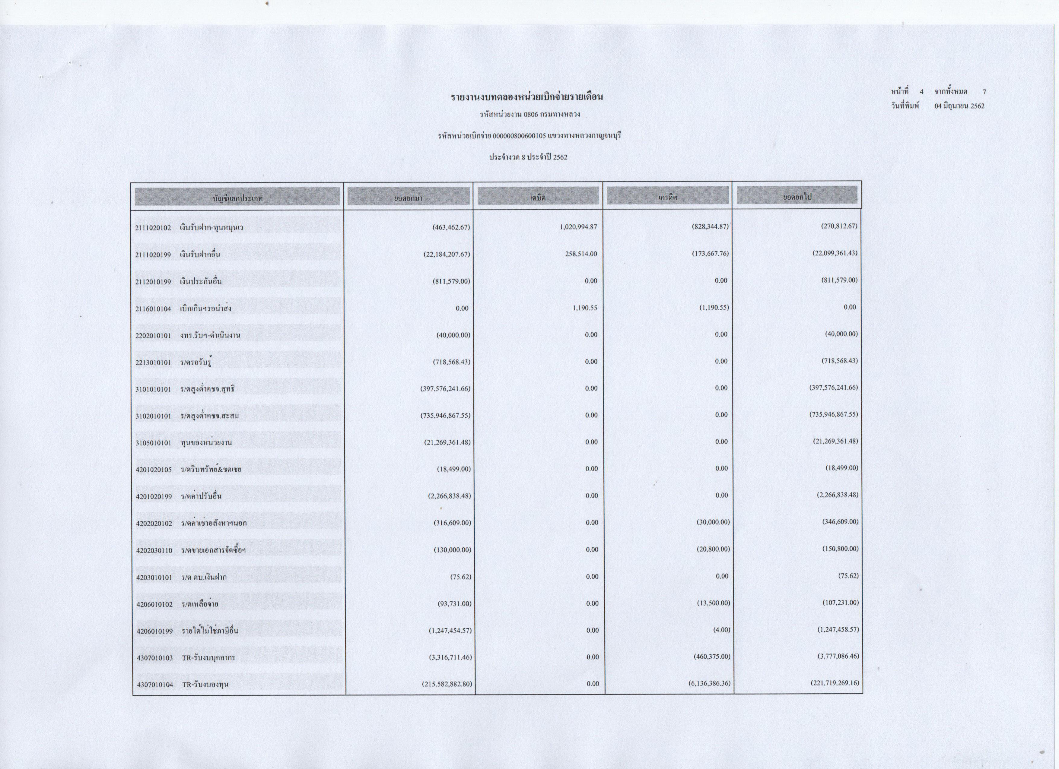 รายงานงบทดลองหน่วยเบิกจ่ายรายเดือน ประจำงวดที่ 8 ประจำปี 2562