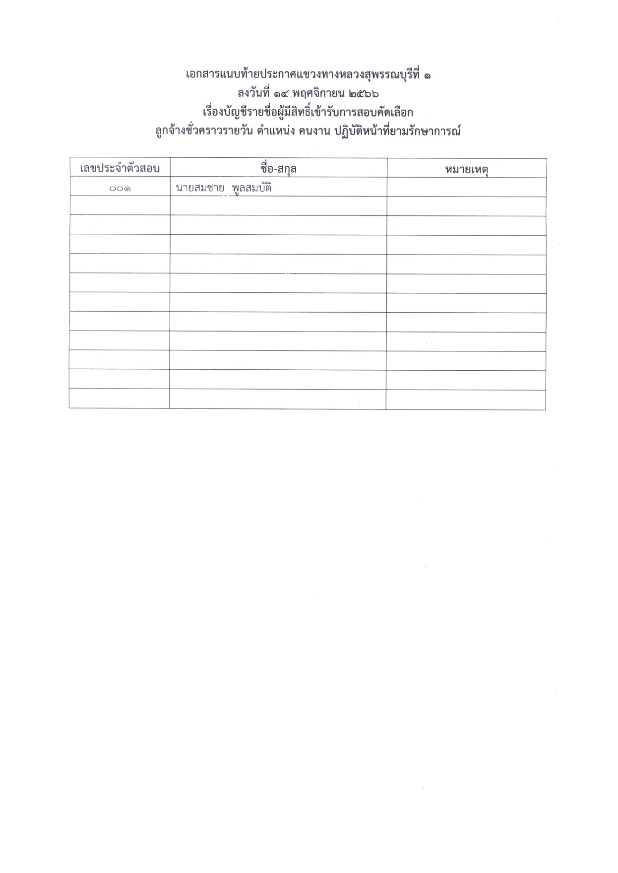 ประกาศรายชื่อผู้มีสิทธิ์เข้ารับการสอบคัดเลือกเป็นลูกจ้างชั่วคราวรายวัน ตำแหน่ง คนงาน ปฏิบัติหน้าที่ยามรักษาการณ์ สังกัดแขวงทางหลวงสุพรรณบุรีที่ 1