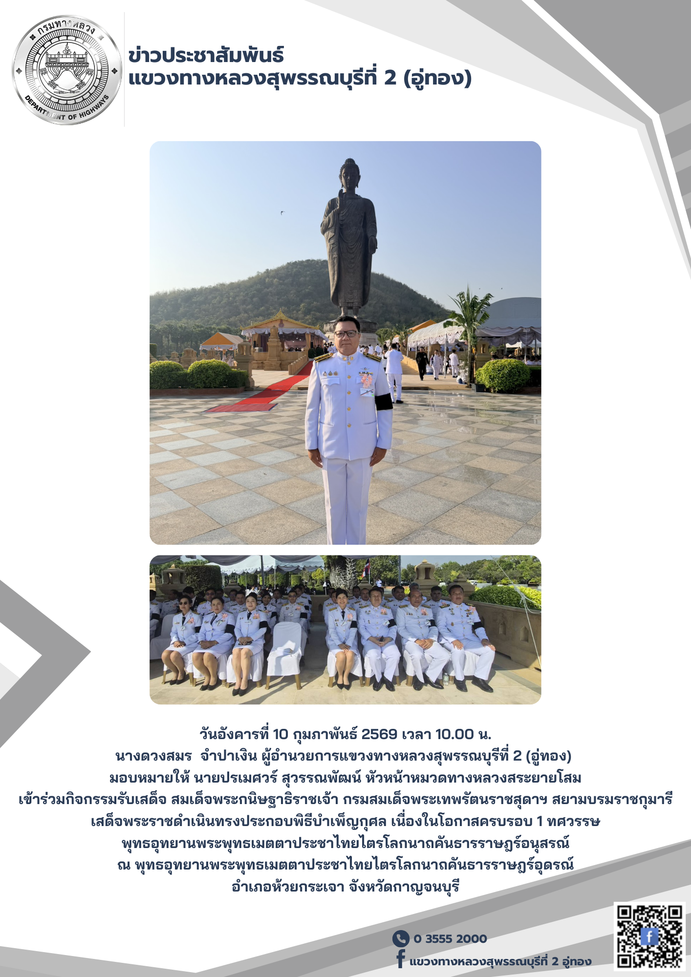 13 10/02/2569 กิจกรรมรับเสด็จ สมเด็จพระกนิษฐาธิราชเจ้า กรมสมเด็จพระเทพรัตนราชสุดาฯ สยามบรมราชกุมารี เสด็จพระราชดำเนินทรงประกอบพิธีบำเพ็ญกุศล เนื่องในโอกาสครบรอบ 1 ทศวรรษ พุทธอุทยานพระพุทธเมตตาประชาไทยไตรโลกนาถคันธารราษฎร์อนุสรณ์ ณ พุทธอุทยานพระพุทธเมตตาประชาไทยไตรโลกนาถคันธารราษฎร์อุดรณ์ อำเภอห้วยกระเจา จังหวัดกาญจนบุรี