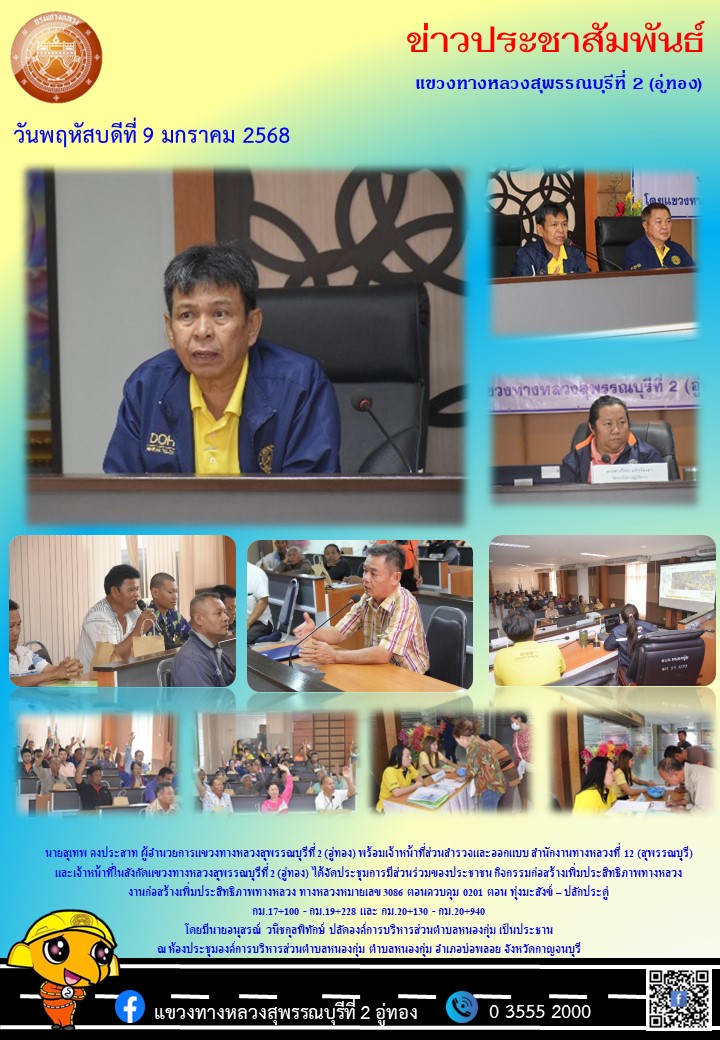 ประชุมประจำเดือน ครั้งที่ 1/2568 เพื่อติดตามผลการปฏิบัติงาน และปัญหาอุปสรรค ในการปฏิบัติงานรอบเดือนที่ผ่านมา ณ ห้องประชุม ชั้น 3 แขวงทางหลวงสุพรรณบุรีที่ 2 (อู่ทอง)