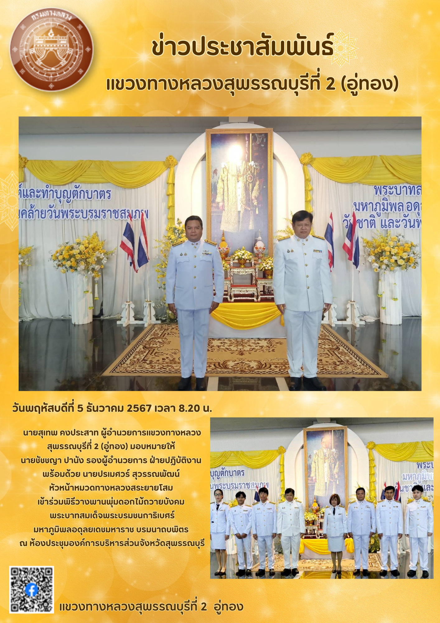 พิธีวางพานพุ่มเนื่องในวันพระบิดาแห่งฝนหลวง ประจำปี 2567 ณ ห้องประชุมองค์การบริหารส่วนจังหวัดสุพรรณบุรี