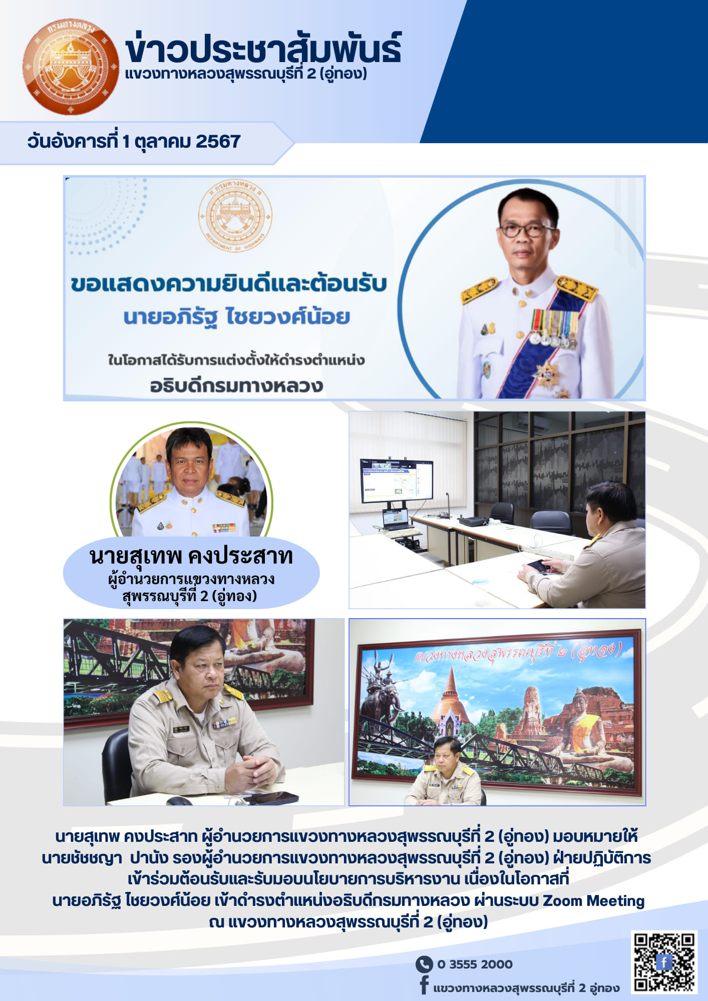 เข้าร่วมต้อนรับและรับมอบนโยบายการบริหารงาน เนื่องในโอกาสที่ นายอภิรัฐ ไชยวงศ์น้อย เข้าดำรงตำแหน่งอธิบดีกรมทางหลวง ผ่านระบบ Zoom Meeting