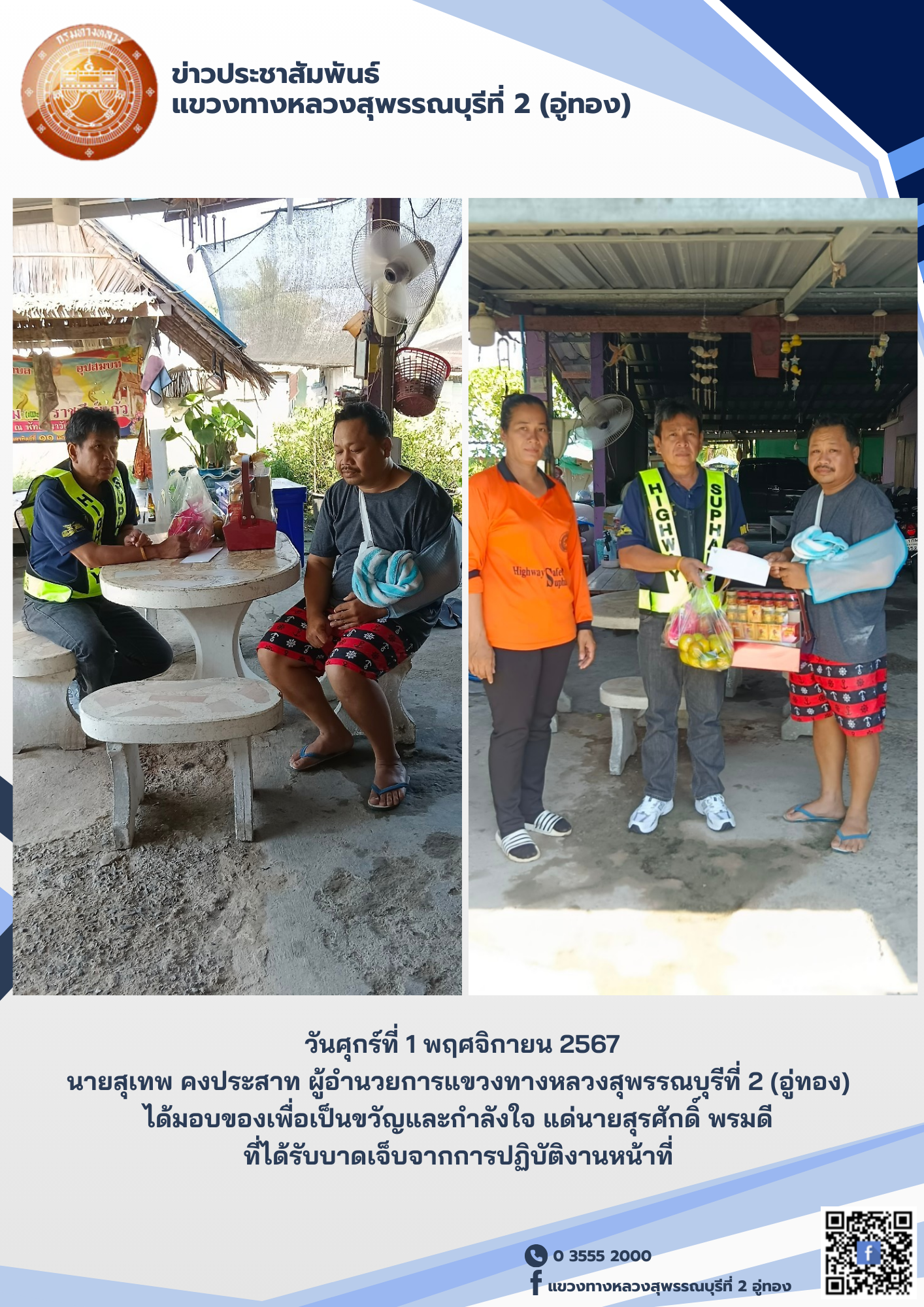 วันศุกร์ ที่ 1 พฤศจิกายน 2567 นายสุเทพ คงประสาท ผู้อำนวยการแขวงทางหลวงสุพรรณบุรีที่ 2 (อู่ทอง) ได้มอบของเพื่อเป็นขวัญและกำลังใจ แด่ นายสุรศักดิ์ พรมดี ที่ได้รับบาดเจ็บจากการปฏิบัติหน้าที่