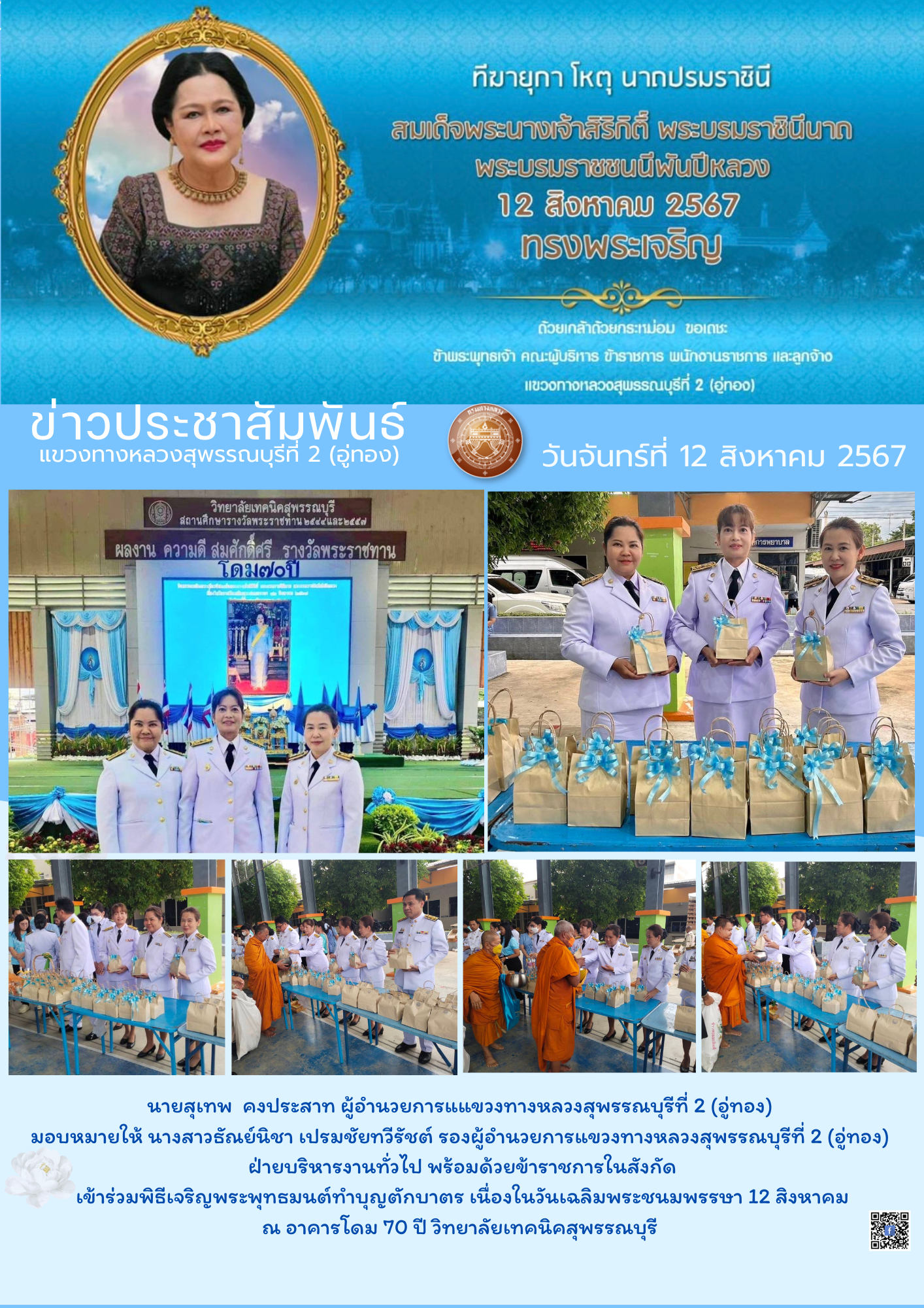 เข้าร่วมพิธีเจริญพระพุทธมนต์ทำบุญตักบาตรเนื่องในวันเฉลิมพระชนมพรรษา 12 สิงหาคม ณ อาคารโดม 70ปี วิทยาลัยเทคนิคสุพรรณบุรี