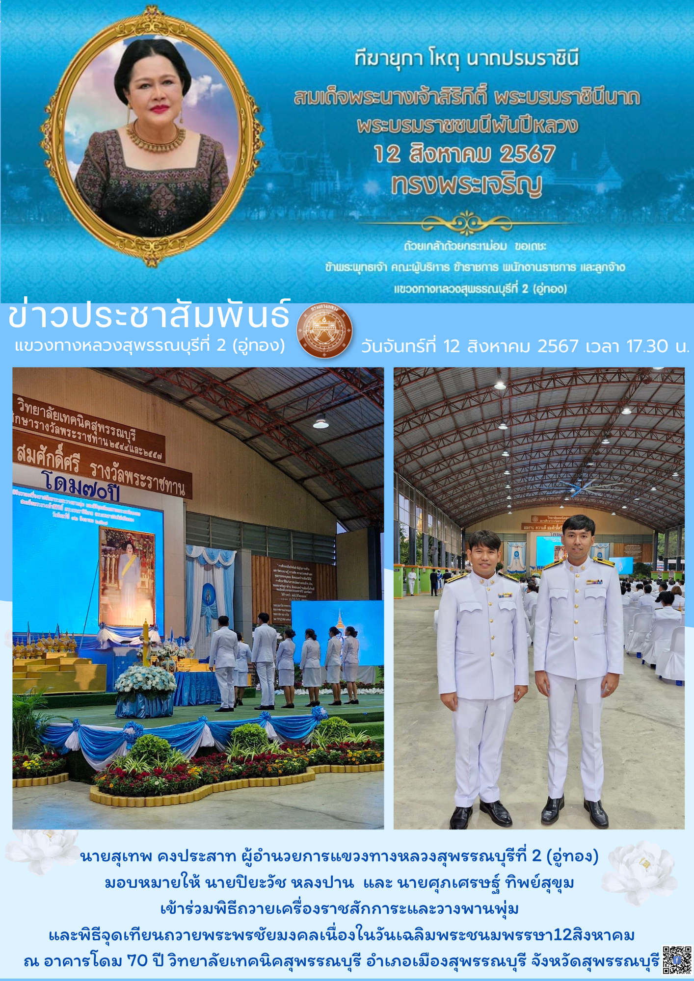 เข้าร่วมพิธีถวายเครื่องราชสักการะและวางพานพุ่ม และพิธีจุดเทียนถวายพระพรชัยมงคล เนื่องในวันเฉลิมพระชนมพรรษา12สิงหาคม ณ อาคารโดม 70 ปี วิทยาลัยเทคนิคสุพรรณบุรี อำเภอเมืองสุพรรณบุรี จังหวัดสุพรรณบุรี