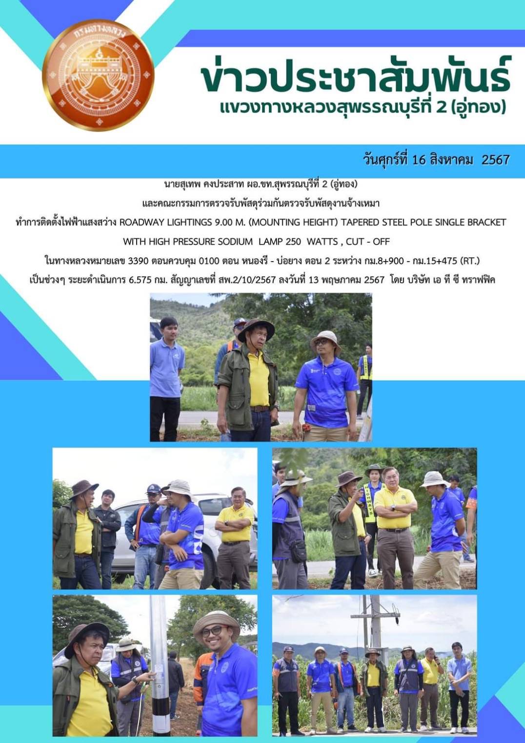 นายจิรวัฒน์ ทรงผาสุข ผู้อำนวยการสำนักงานทางหลวงที่ 12 พร้อมด้วย นายสุเทพ คงประสาท ผู้อำนวยการแขวงทางหลวงสุพรรณบุรีที่ 2 (อู่ทอง) นายชัชชญา ปานัง รองผู้อำนวยการแขวงทางหลวงสุพรรณบุรีที่ 2 (อู่ทอง) ฝ่ายปฏิบัติการ และ นายกฤษณ์ พรหมศิรินนท์ หัวหน้าหมวดทางหลวงอู่ทอง ลงพื้นที่สายทาง ติดตาม/ตรวจสอบการทำงานเครื่องสูบน้ำ เพื่อแก้ไขปัญหาน้ำท่วมทางเมื่อเกิดฝนตกหนัก ในทางหลวงหมายเลข 321 ตอน วังขอน - ดอนแจง ระหว่าง กม.74+500 - กม.74+900 (บริเวณตลาดอู่ทอง)