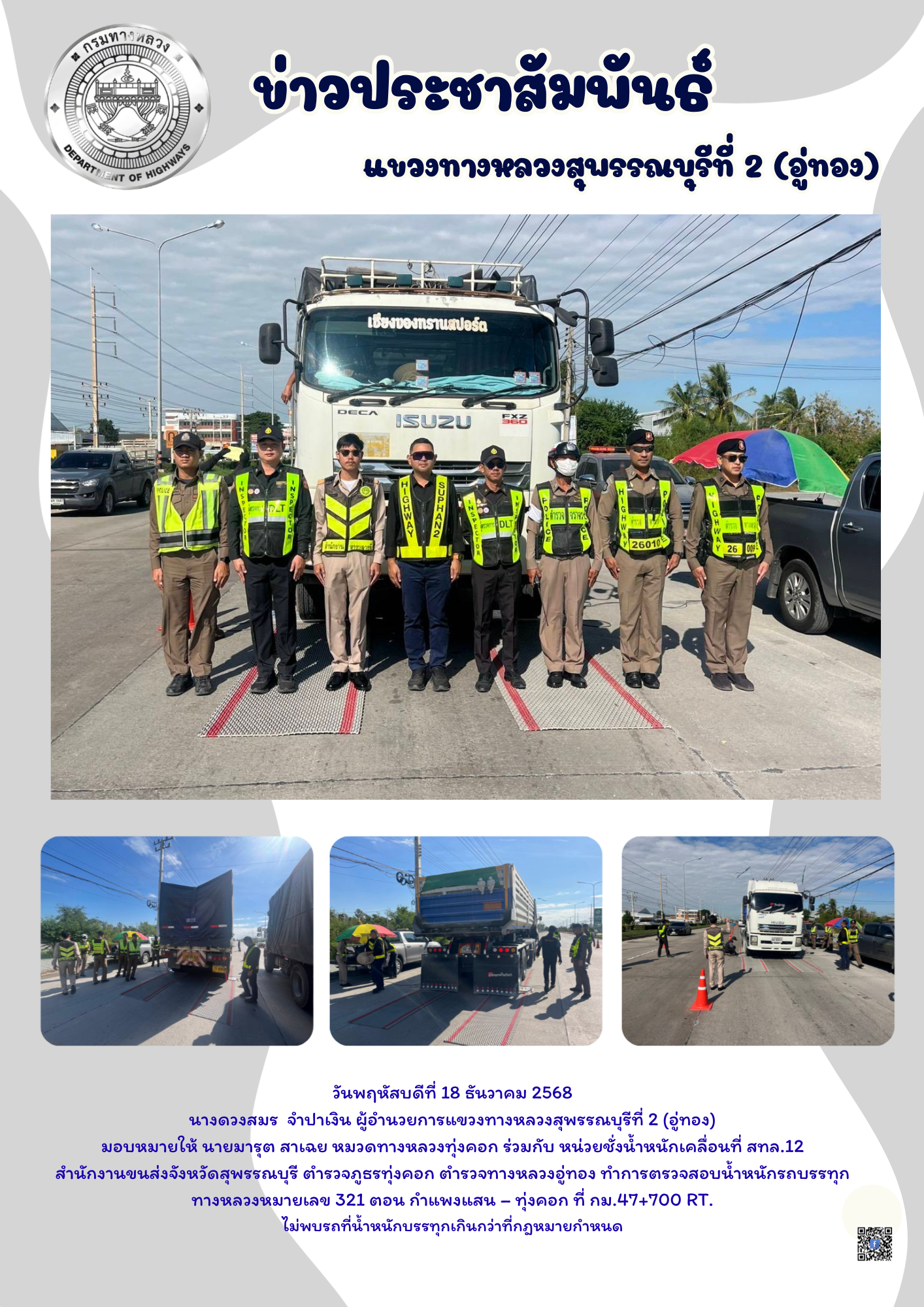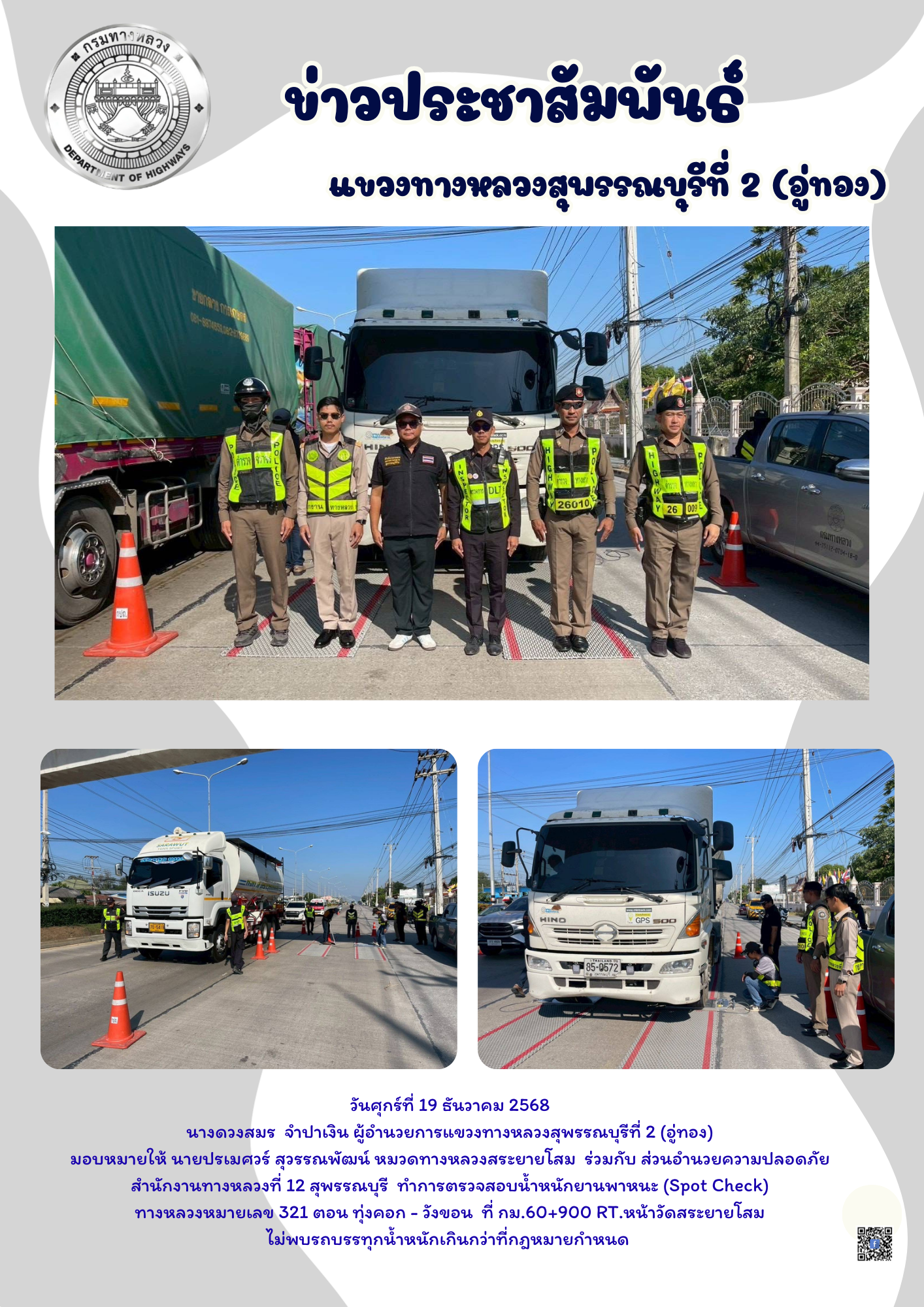 ตรวจสอบน้ำหนักยานพาหนะ (Spot Check) ทางหลวงหมายเลข 321 ตอน ทุ่งคอก - วังขอน ที่ กม.60+900 RT.หน้าวัดสระยายโสม ไม่พบรถบรรทุกน้ำหนักเกินกว่าที่กฎหมายกำหนด