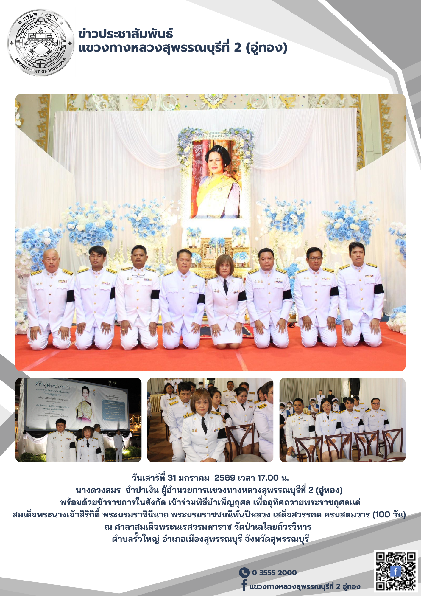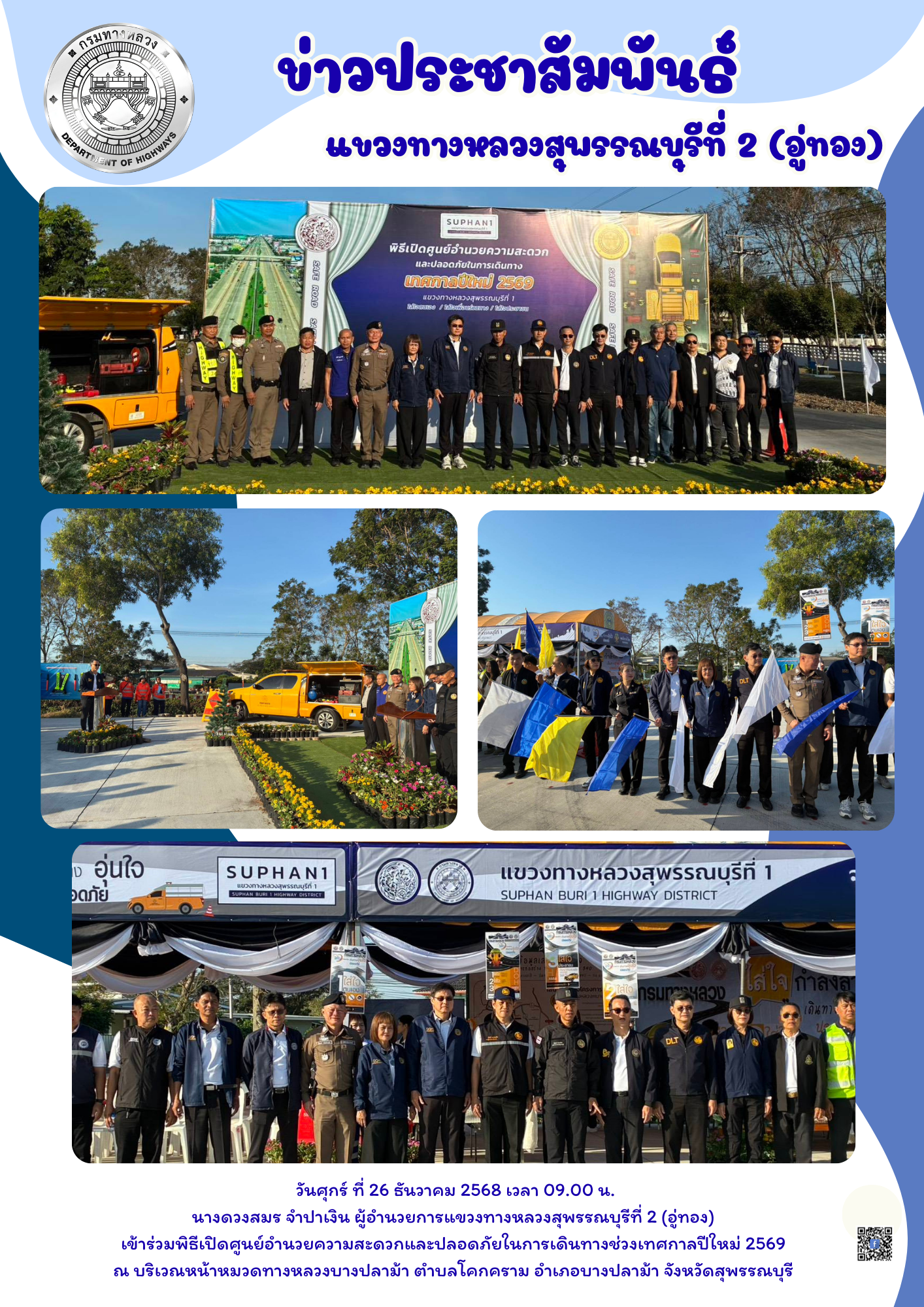 พิธีเปิดศูนย์อำนวยความสะดวกและปลอดภัยในการเดินทางช่วงเทศกาลปีใหม่ 2569 ณ บริเวณหน้าหมวดทางหลวงบางปลาม้า ตำบลโคกคราม อำเภอบางปลาม้า จังหวัดสุพรรณบุรี