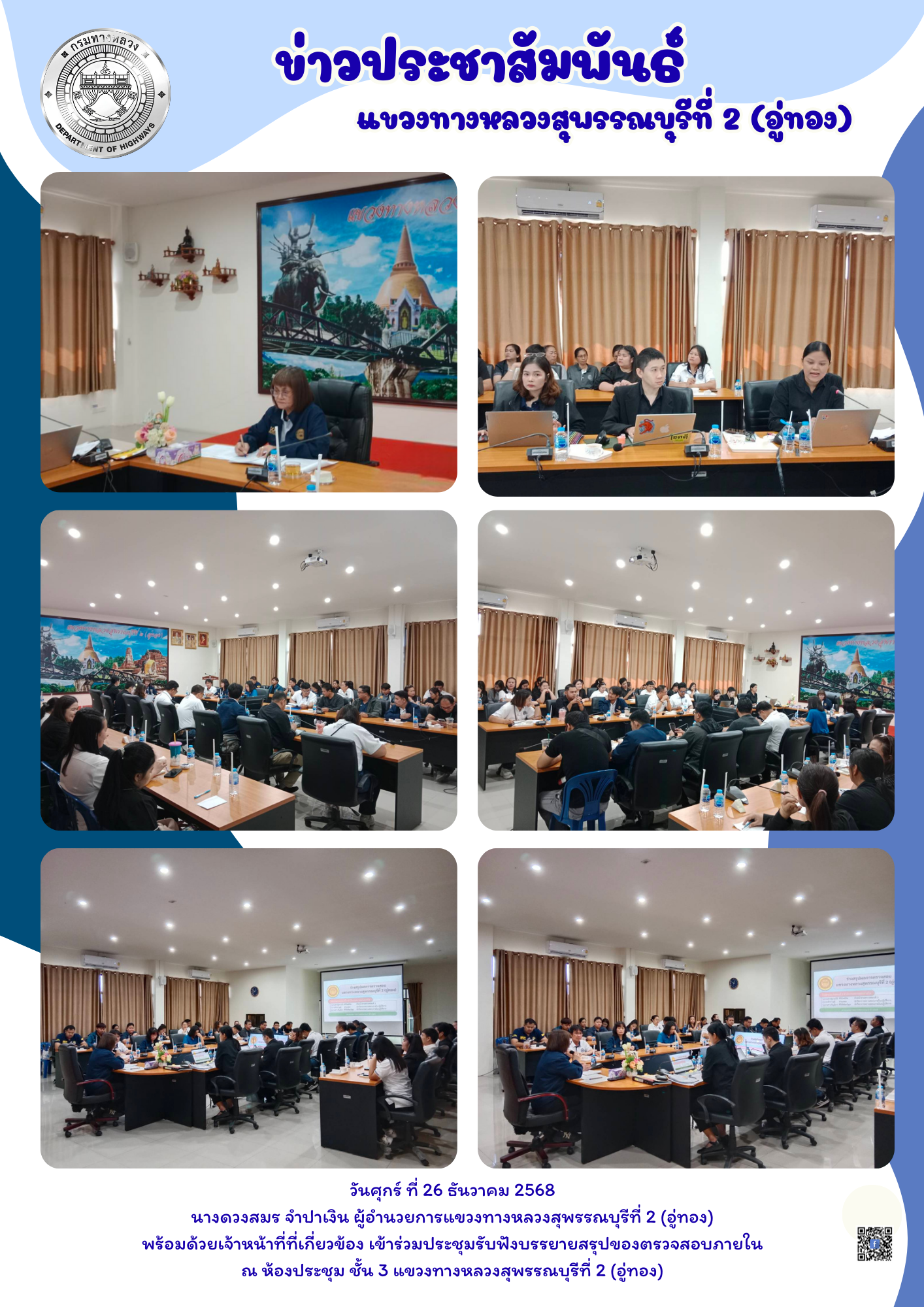ประชุมเตรียมความพร้อมของงานก่อสร้างประจำปี 2569 เพื่อรับทราบเงื่อนไขการทำงาน การรายงาน การควบคุมงาน โดยเฉพาะอย่างยิ่งคุณภาพของงานตามมาตรฐานของกรมทางหลวง ณ ห้องประชุม ชั้น 3 แขวงทางหลวงสุพรรณบุรีที่ 2 (อู่ทอง)