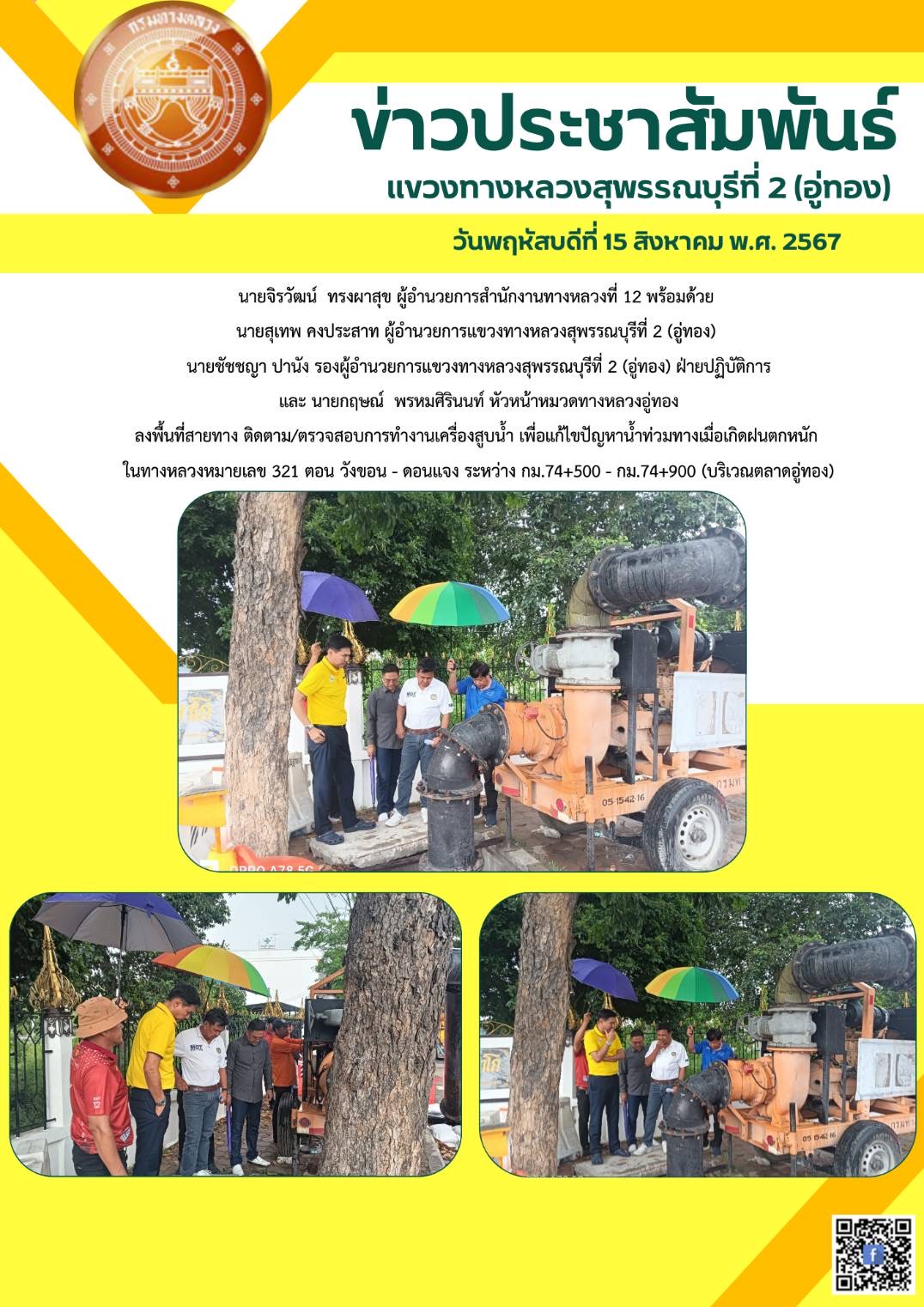 นายจิรวัฒน์ ทรงผาสุข ผู้อำนวยการสำนักงานทางหลวงที่ 12 พร้อมด้วย นายสุเทพ คงประสาท ผู้อำนวยการแขวงทางหลวงสุพรรณบุรีที่ 2 (อู่ทอง) นายชัชชญา ปานัง รองผู้อำนวยการแขวงทางหลวงสุพรรณบุรีที่ 2 (อู่ทอง) ฝ่ายปฏิบัติการ และ นายกฤษณ์ พรหมศิรินนท์ หัวหน้าหมวดทางหลวงอู่ทอง ลงพื้นที่สายทาง ติดตาม/ตรวจสอบการทำงานเครื่องสูบน้ำ เพื่อแก้ไขปัญหาน้ำท่วมทางเมื่อเกิดฝนตกหนัก ในทางหลวงหมายเลข 321 ตอน วังขอน - ดอนแจง ระหว่าง กม.74+500 - กม.74+900 (บริเวณตลาดอู่ทอง)