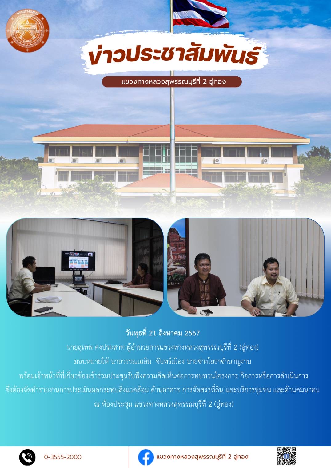 นายสุเทพ คงประสาท ผู้อำนวยการแขวงทางหลวงสุพรรณบุรีที่ 2 (อู่ทอง) มอบหมายให้ นายวรรณเฉลิม จันทร์เมือง นายช่างโยธาชำนาญงาน พร้อมเจ้าหน้าที่ที่เกี่ยวข้อง เข้าร่วมประชุมรับฟังความคิดเห็นต่อการทบทวนโครงการ กิจการ หรือการดำเนินการซึ่งต้องจัดทำรายงานการประเมินผลกระทบสิ่งแวดล้อม ด้านอาคาร การจัดสรรที่ดิน และบริการชุมชน และด้านคมนาคม ณ ห้องประชุม แขวงทางหลวงสุพรรณบุรีที่ 2 (อู่ทอง)