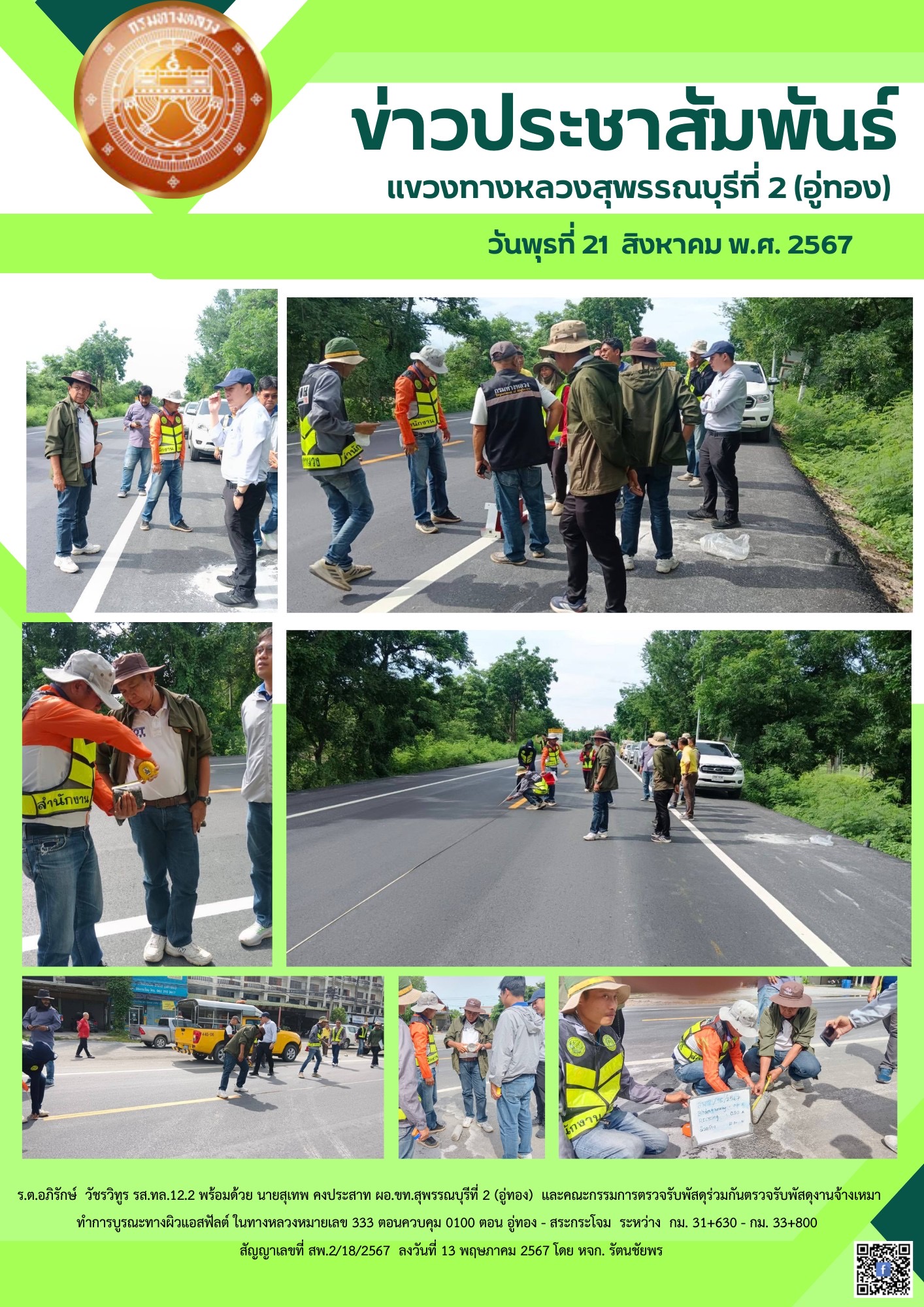 ร.ต.อภิรักษ์ วัชรวิทูร รส.ทล.12.2 พร้อมด้วย นายสุเทพ คงประสาท ผอ.ขท.สุพรรณบุรีที่ 2 (อู่ทอง) และคณะกรรมการตรวจรับพัสดุร่วมกันตรวจรับพัสดุงานจ้างเหมา ทำการบูรณะทางผิวแอสฟัลต์ ในทางหลวงหมายเลข 333 ตอนควบคุม 0100 ตอน อู่ทอง - สระกระโจม ระหว่าง กม. 31+630 - กม. 33+800 สัญญาเลขที่ สพ.2/18/2567 ลงวันที่ 13 พฤษภาคม 2567 โดย หจก. รัตนชัยพร